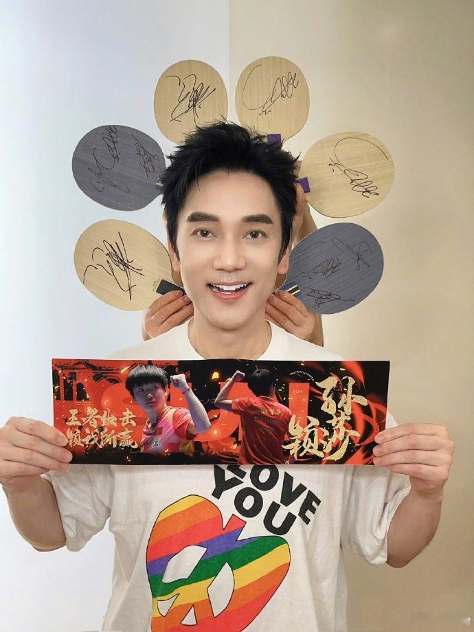 #林依轮举孙颖莎签名手幅打call# 林依轮手中紧握着孙颖莎的签名手幅,大声为乒乓球队呐喊加油,期待王楚钦孙颖莎在今晚比赛中大放异彩!