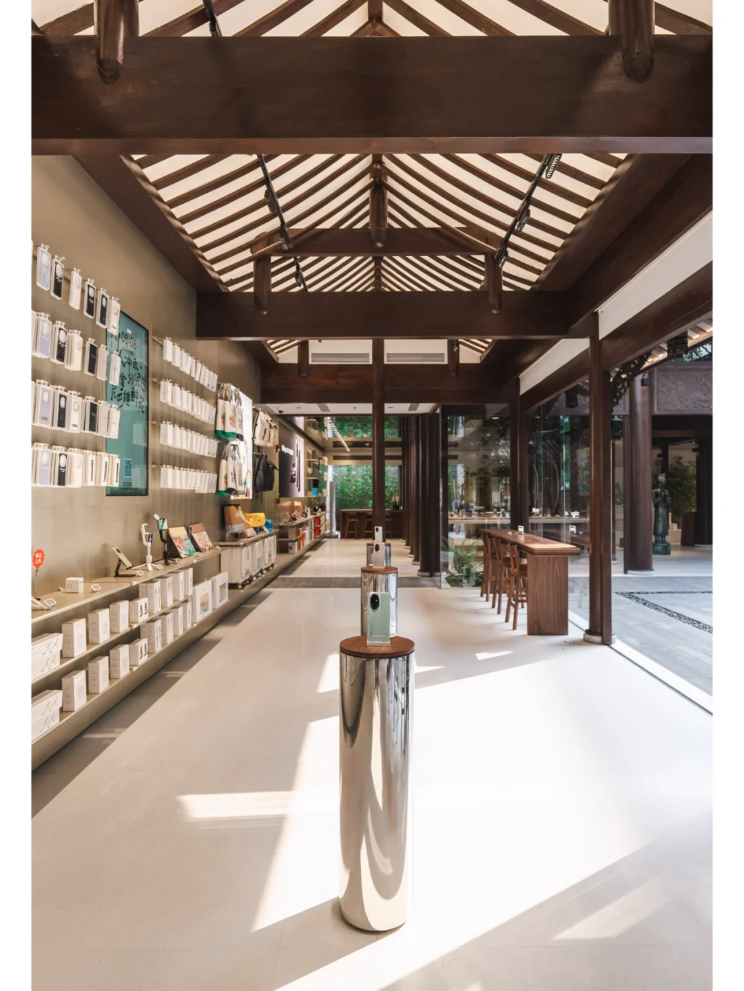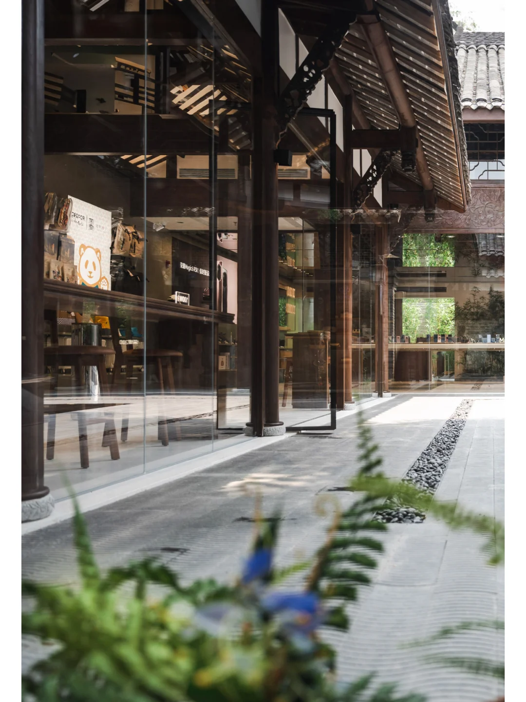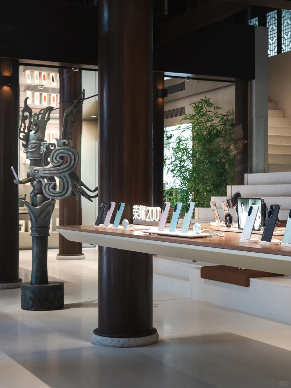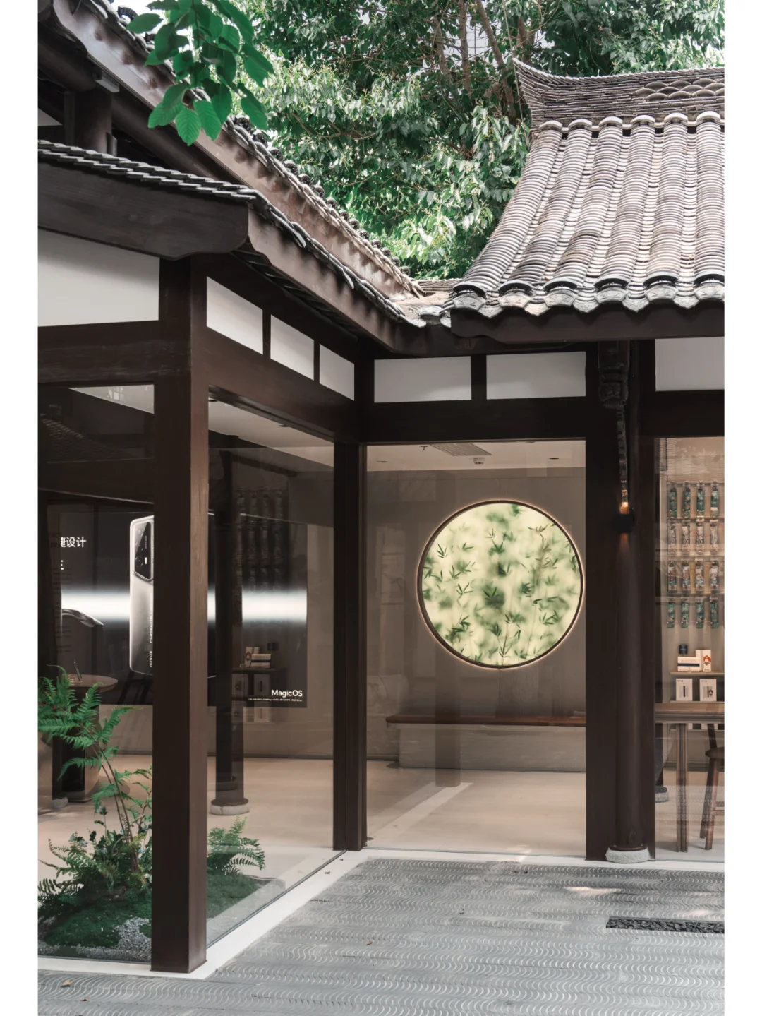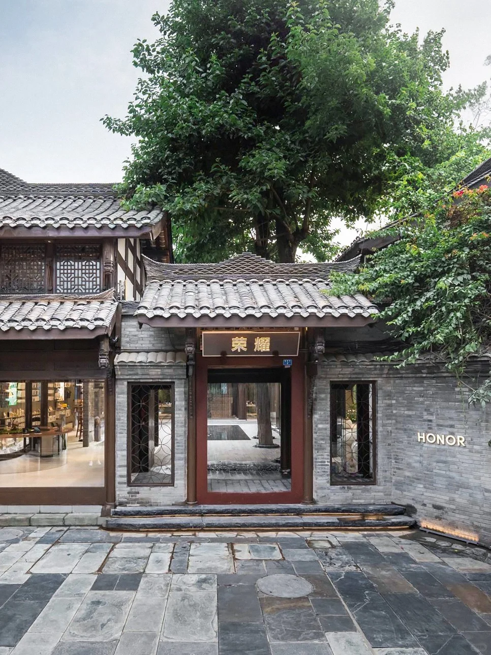 充满历史传统元素的宽窄巷子街区与都市现代感十足的科技品牌,这对看似矛盾的二元,近日却藉由荣耀首家全球旗舰店的落址开业,以新旧共生,融合古今的全新形态展现在人们面前。荣耀新零售设计团队,通过非侵入式的微更新手法,巧妙地将在地文化的深厚底蕴与前沿科技的创新活力融为一体,重新定义了城市文化与品牌叙事的表达方式。