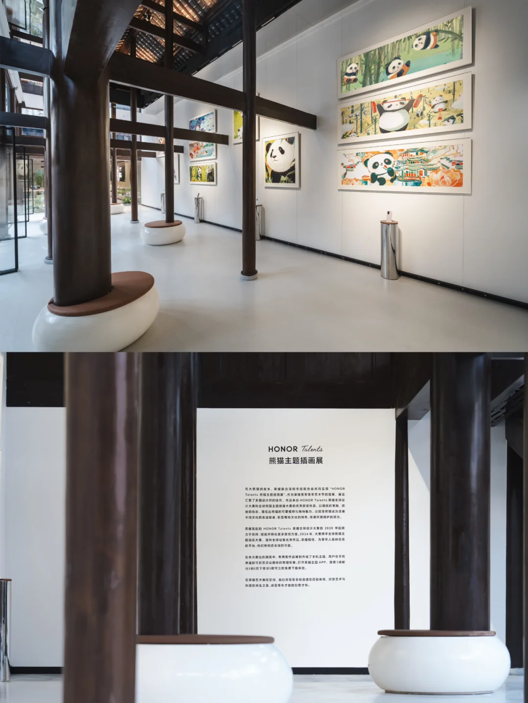 屋瓦以青为天,景观以青为地,古风建筑与新式院落形成完美融合,营造古今对话穿越时空定义的“青瓦古舍”空间。空间叙事以科技美学共创、科技文创博览、科技美学会客厅、品牌在地艺术画廊和中轴探秘,五个主题分区为逻辑,分别以艺术轴和产品轴打造两条洄游动线,开启基于荣耀品牌与宽窄在地文化探索的科技人文与艺术美学之旅。