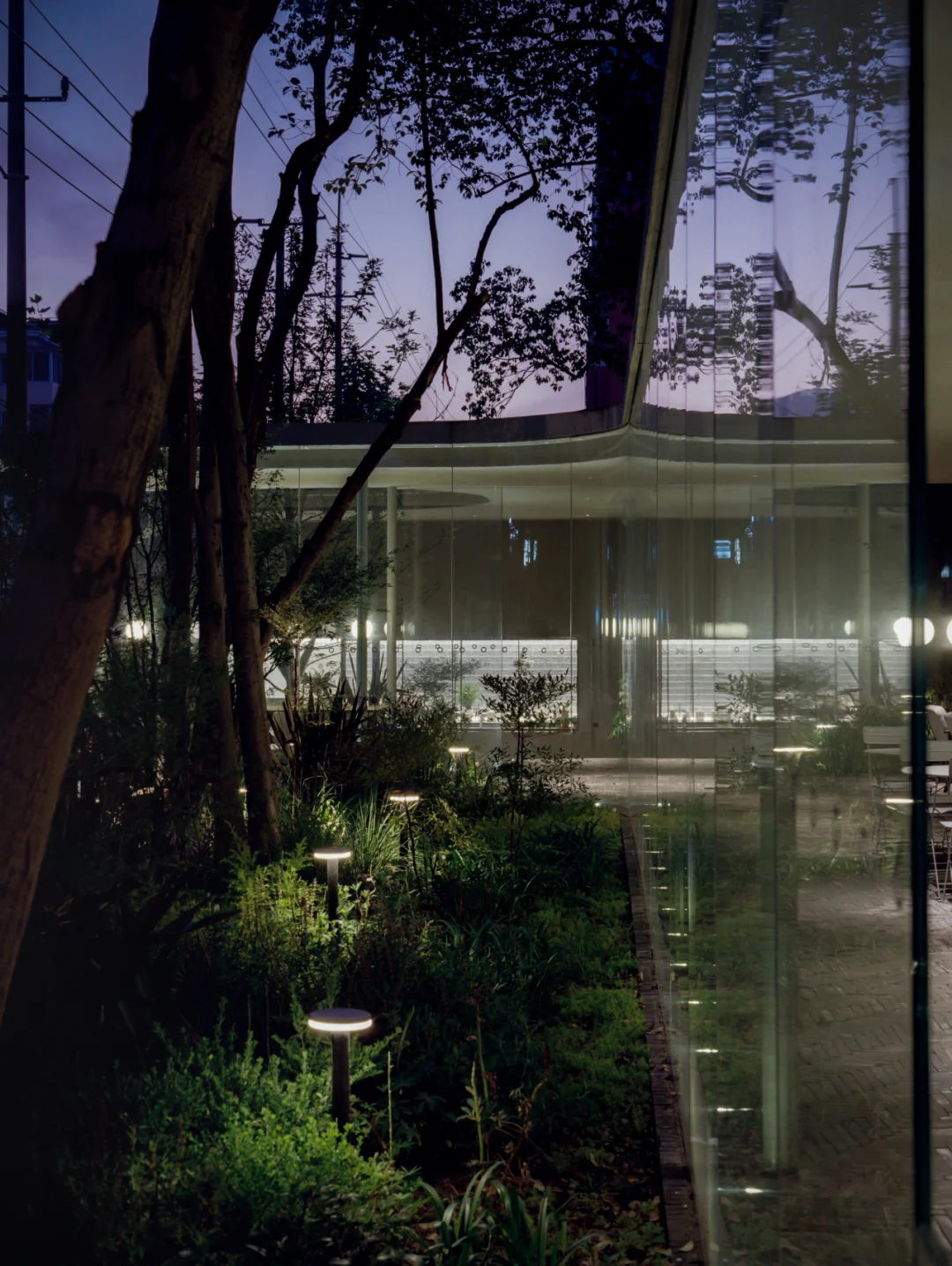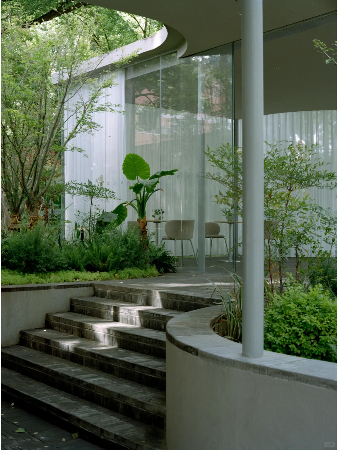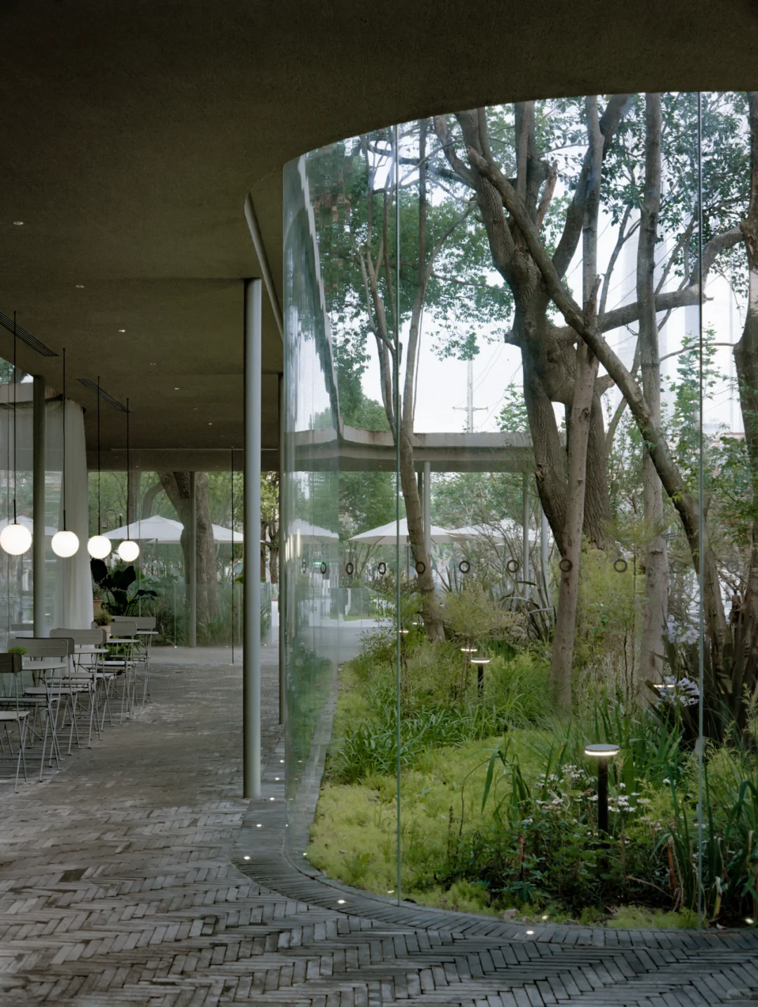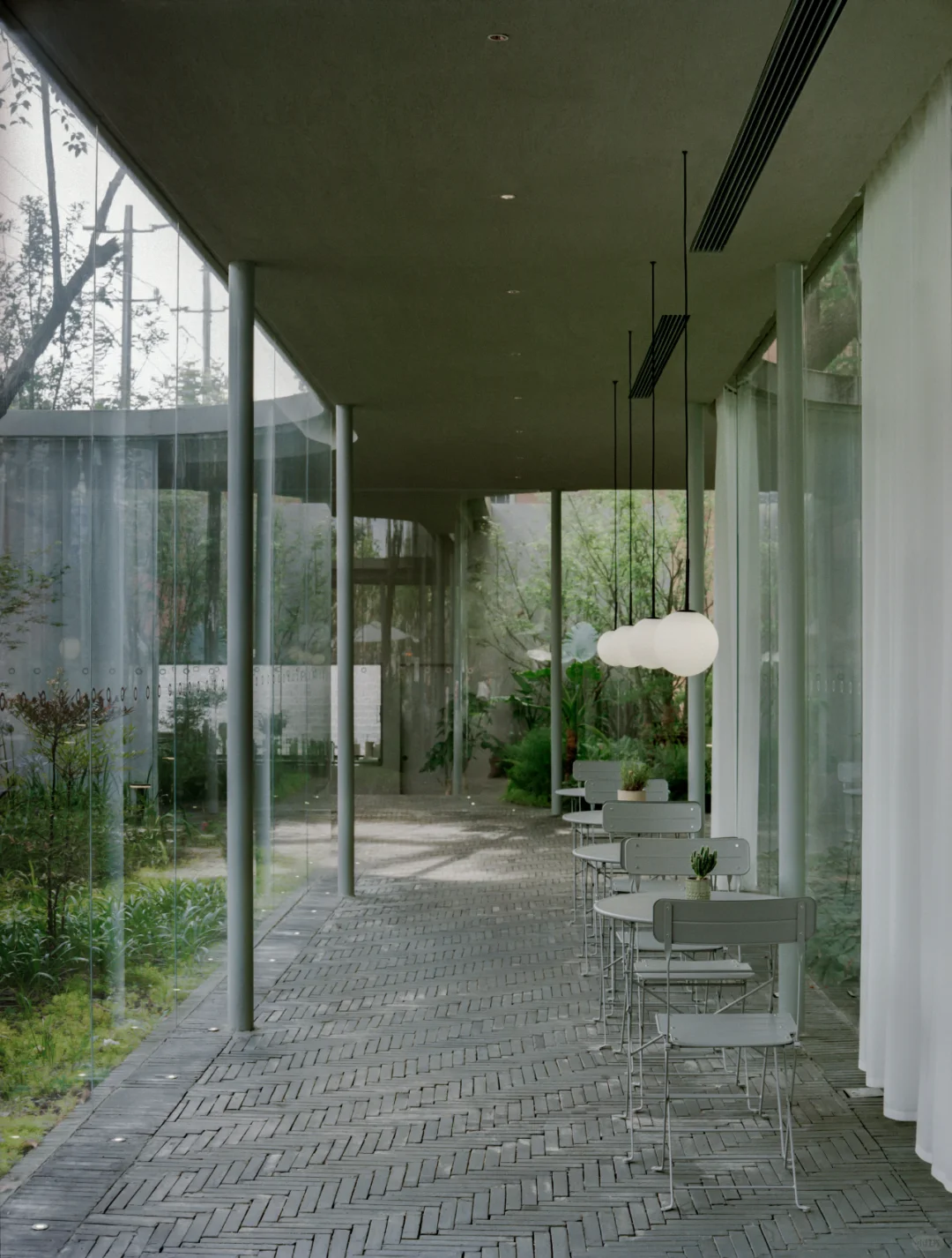 通透洁净的落地玻璃、随处可见的青砖,以及低调内敛的灰色肌理涂料,这些材料的选择也一同传达着设计初衷:让大家没有压力地走进藏在这一片绿色中的庇护所,去享受自然。高高的落地窗两端干净利落地隐于天花、藏进砖缝,最大限度地开拓人在室内的视野和感知。