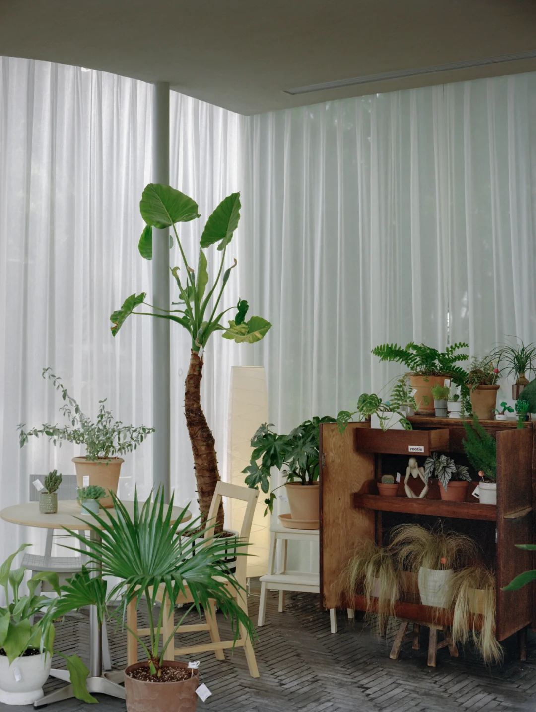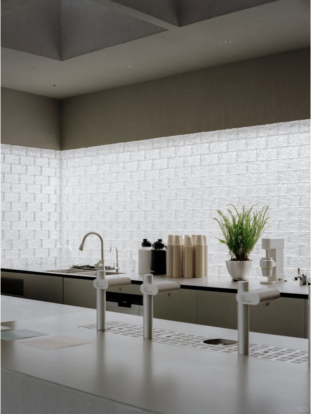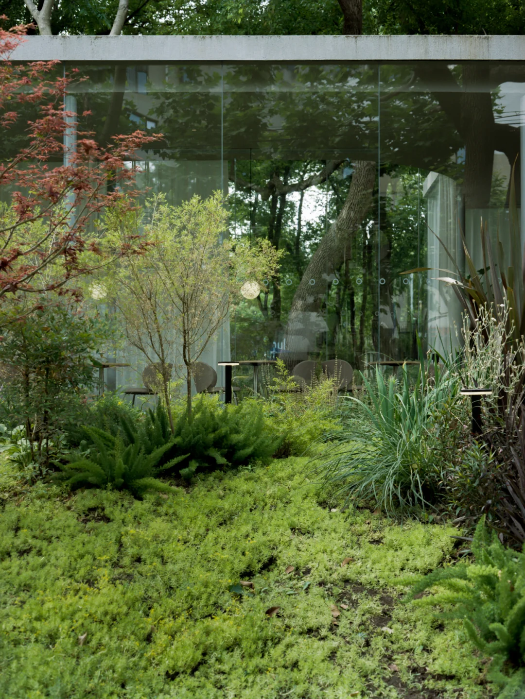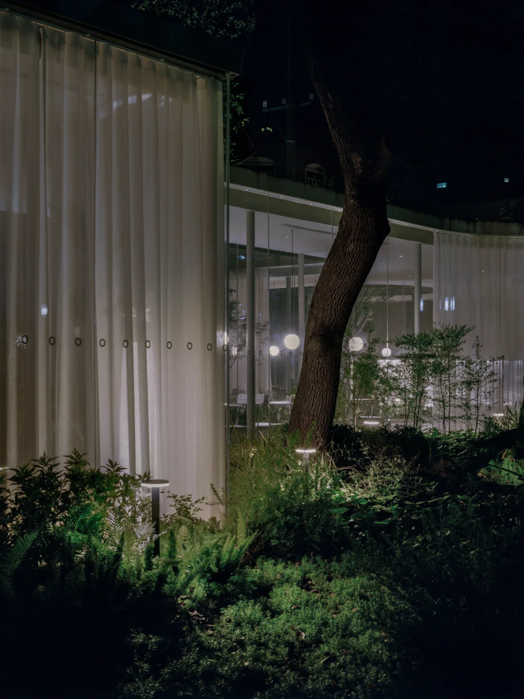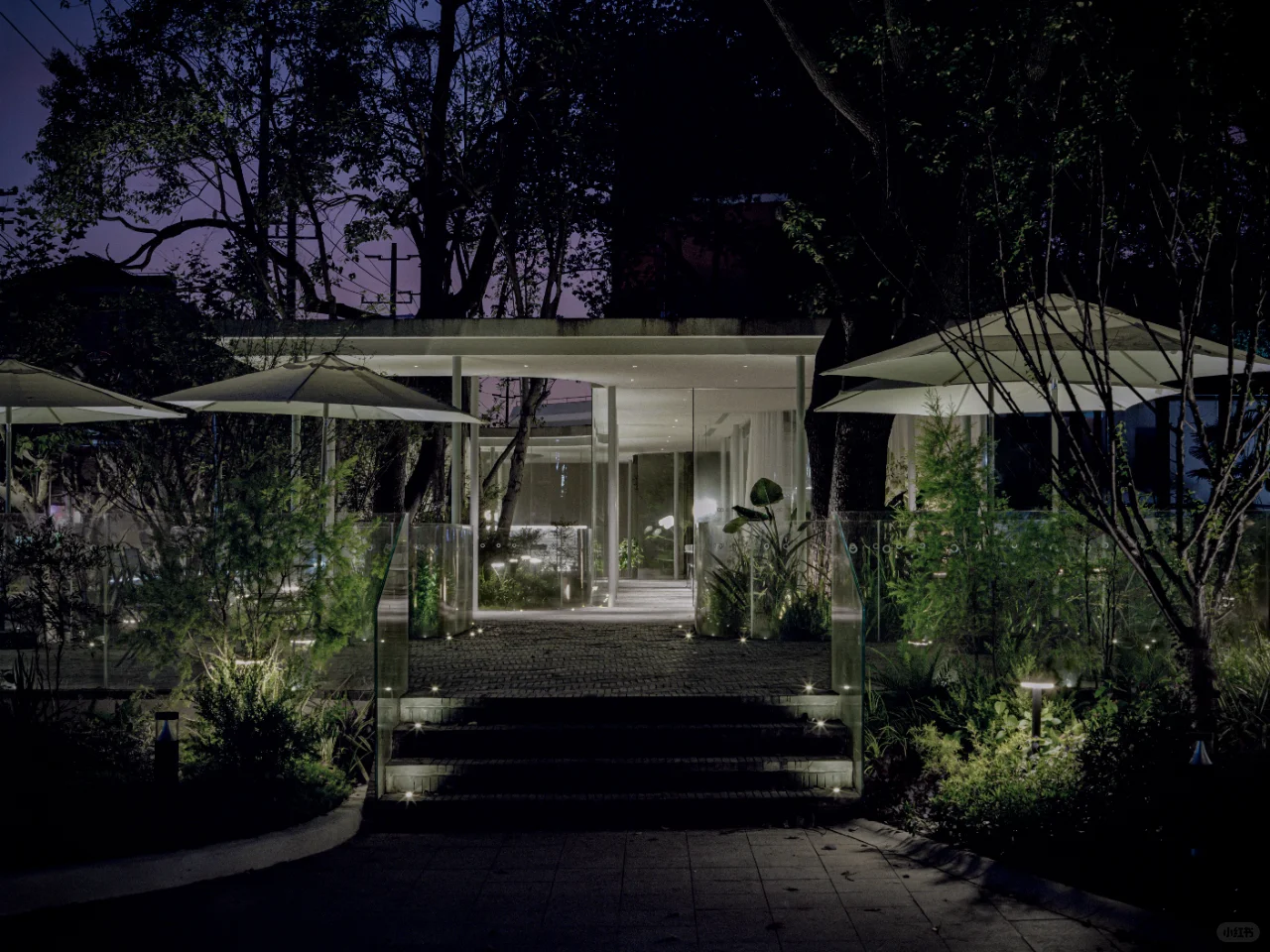 通透洁净的落地玻璃、随处可见的青砖,以及低调内敛的灰色肌理涂料,这些材料的选择也一同传达着设计初衷:让大家没有压力地走进藏在这一片绿色中的庇护所,去享受自然。高高的落地窗两端干净利落地隐于天花、藏进砖缝,最大限度地开拓人在室内的视野和感知。