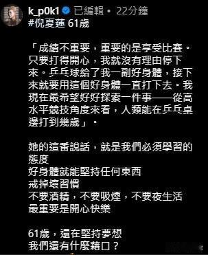 倪夏莲61岁6次出战奥运乒乓球 保錡@ERROR发文大赞心态值得学习 2024年巴黎奥运乒乓球选手倪夏莲代表卢森堡出赛,她今年已经61岁,倪夏莲已经6次出战奥运,她有「乒乓嫲嫲」之称。今日(31日)下午倪夏莲於女单32强赛遇上23岁中国选手孙颖莎,孙颖莎以4:0击败倪夏莲晋级,虽然倪夏莲被撃败出局,但嬴到了不少掌声。 ERROR成员吴保錡(保錡)在社交平台发文大赞倪夏莲,他先引用了倪夏莲说的话:「成绩不重要,重要的是享受比赛。只要打得开心,我就没有理由停下来。乒乓球给了我一副好身体,接下来就要用这个好身体一直打下去。我现在最希望好好探索一件事——从高水平竞技角度来看,人类能在乒乓桌边打到几岁。」 保錡表示倪夏莲的说话值得去学习:「她的这番说话,就是我们必须学习的态度。好身体就能坚持任何东西,戒掉坏习惯,不要酒精,不要吸烟,不要夜生活,最重要是开心快乐。」保錡自己亦是一名运动健儿,所以对她说的话更发深省。 最後保錡更对倪夏莲表示尊敬,因为她已经61岁都还在坚持梦想,更问自己有什麽藉口:「我们还有什麽藉口?Respect!」网民亦有留言回覆保錡:「完全享受过程,乐在其中,运动嘅初心。」双方面都十分正面,可以说是有满满的正能量。