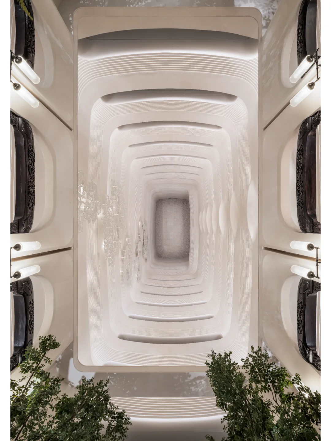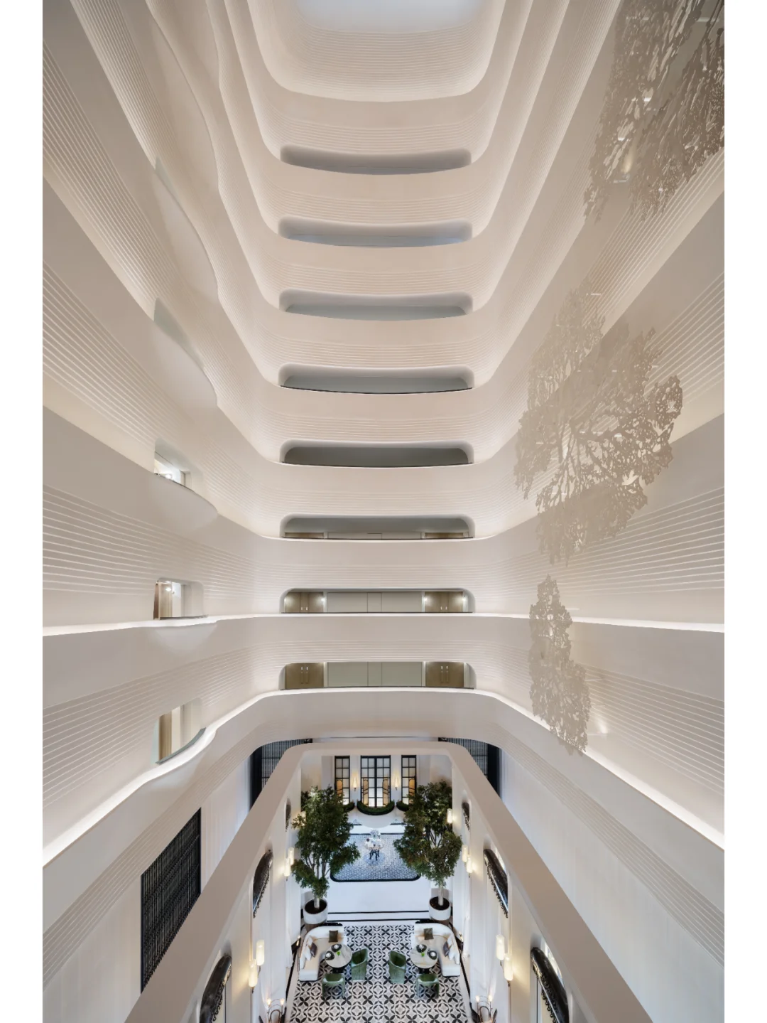 在高达63米的12层中空大堂中,为避免营造出压抑如天井的空间体验,设计团队采用中式传统建筑“密檐塔”的建筑构架关系,形成为富有弹性的抛物线,使比例虽高挺而不显空旷和笨拙。