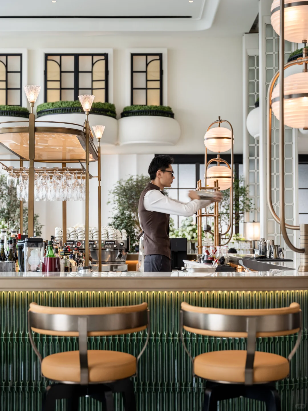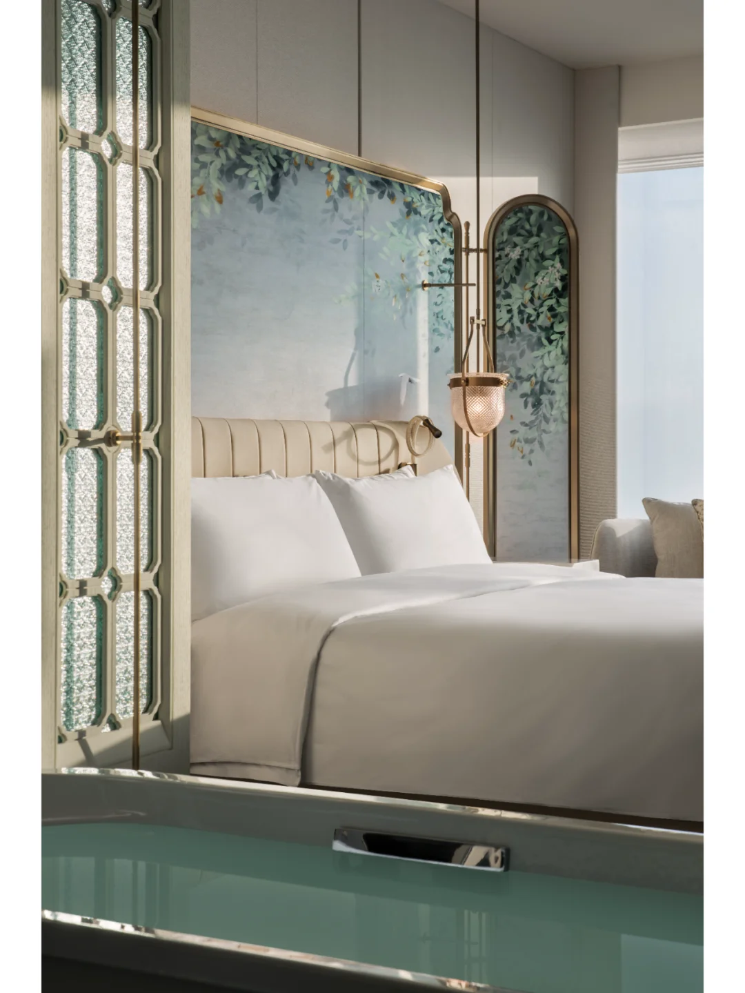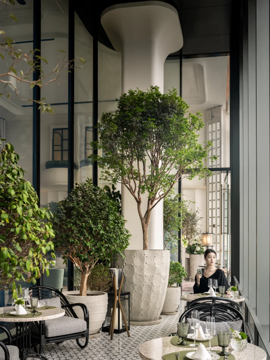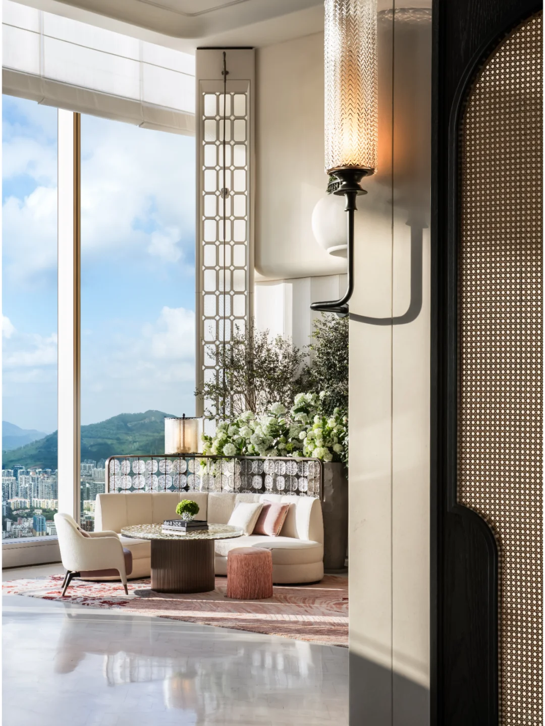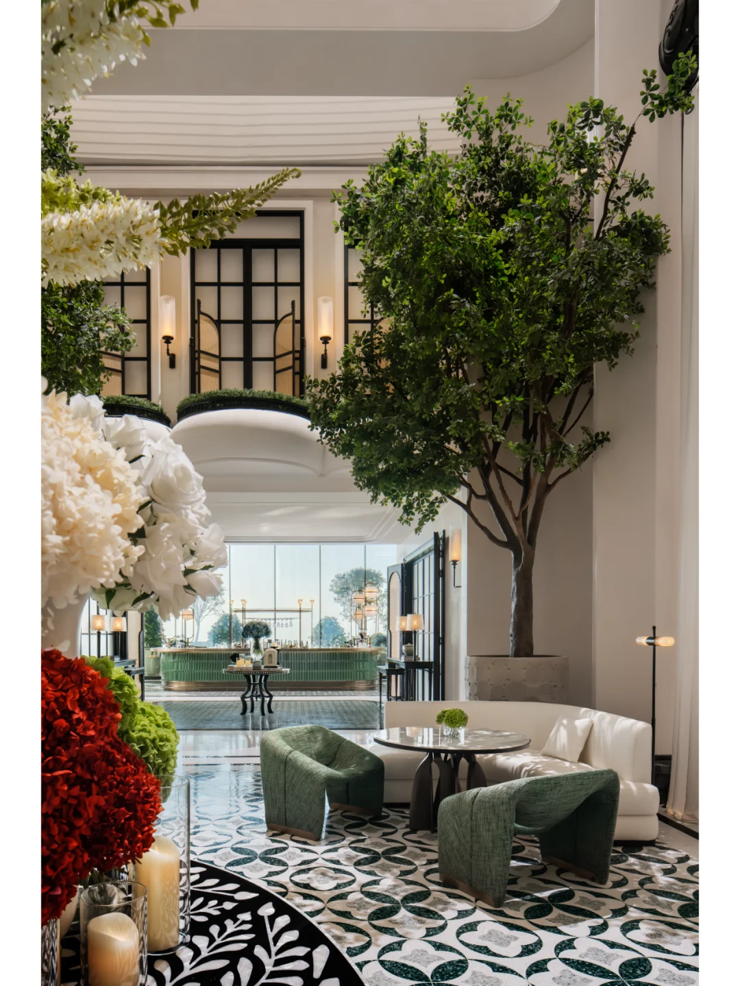 酒店整体以优雅温暖的米白色为基调,融入大量的绿植、花艺等天然的自然元素,将自然之美与人文之美完全融合,也巧妙避开了传统中式风格色彩所带来的厚重感。