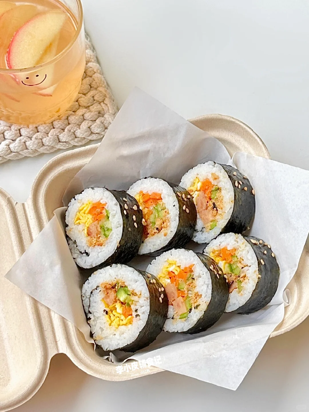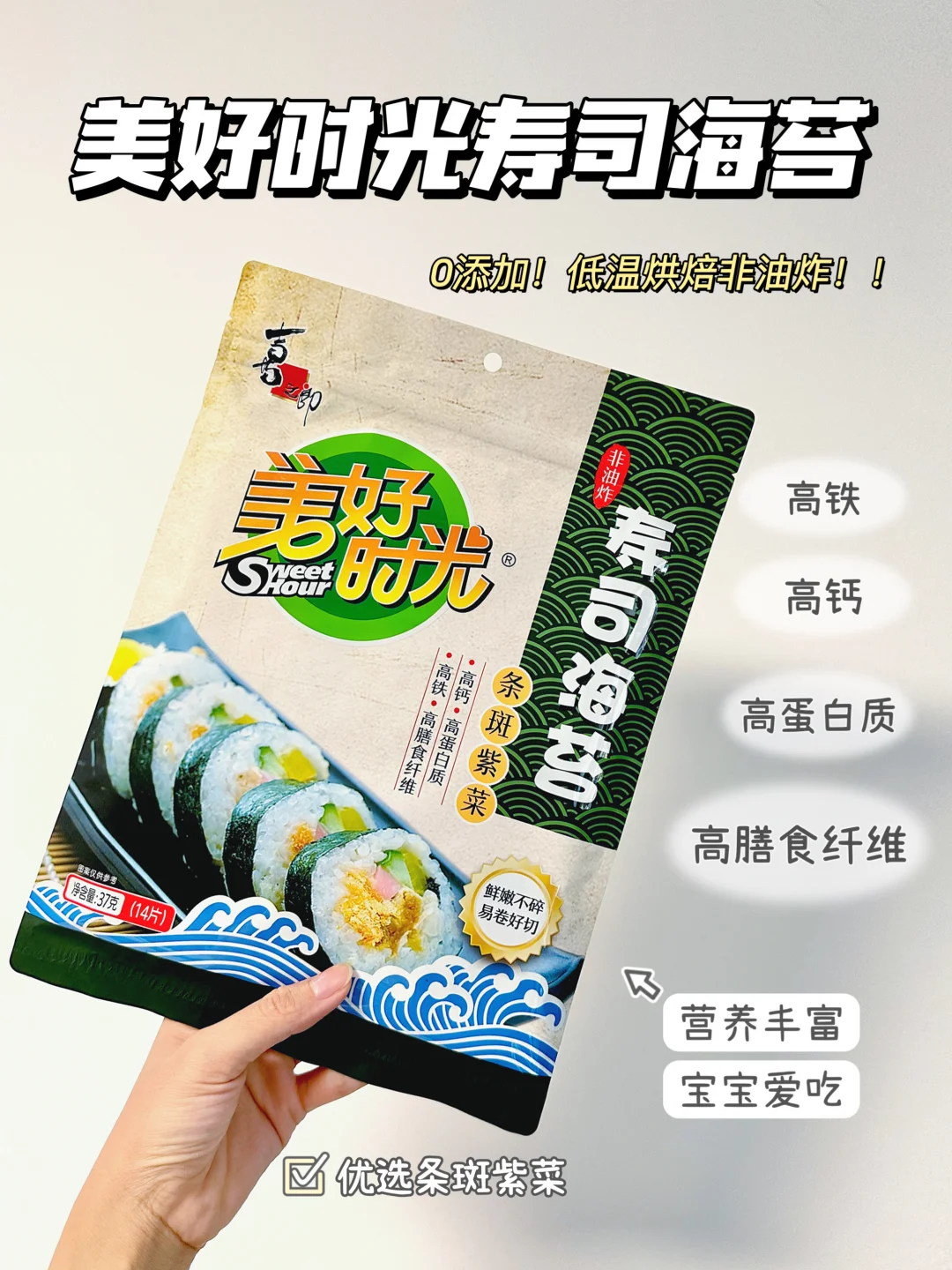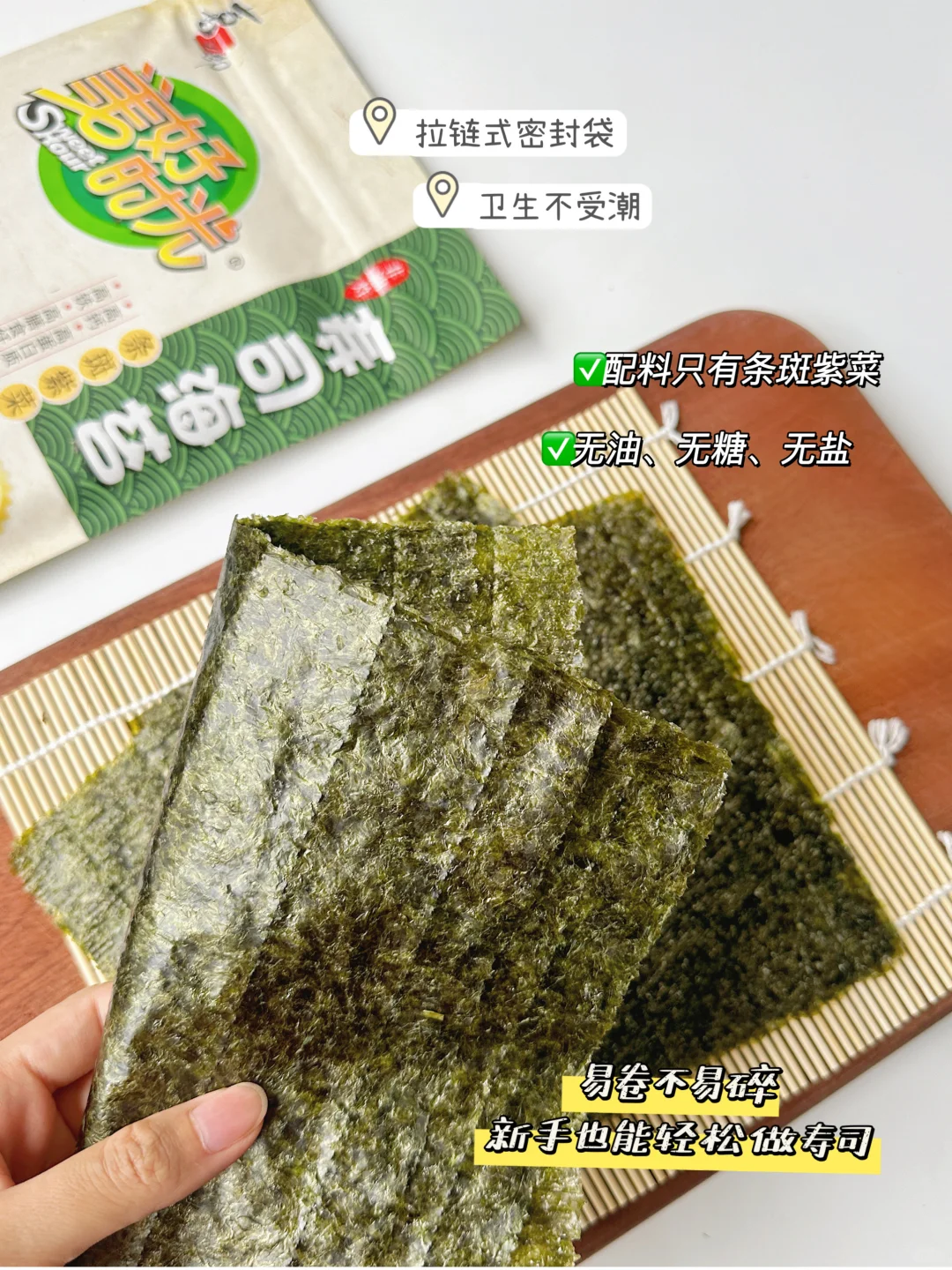 🌟 做寿司卷用到的是美好时光寿司海苔,配料表干净,只有优选条斑紫菜一种,无糖无盐无油0添加,给小宝宝吃也很放心!而且这款海苔是低温烘焙的,非油炸,宝宝吃了不会上火,营养价值也很高,高钙、高铁、高锌、高蛋白,又香又脆,吃起来特别鲜!!做寿司易卷不易碎,新手也能轻松上手。