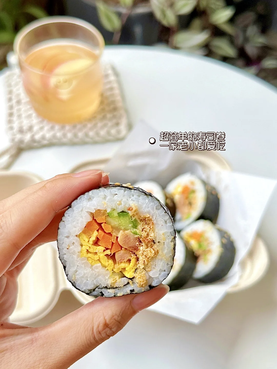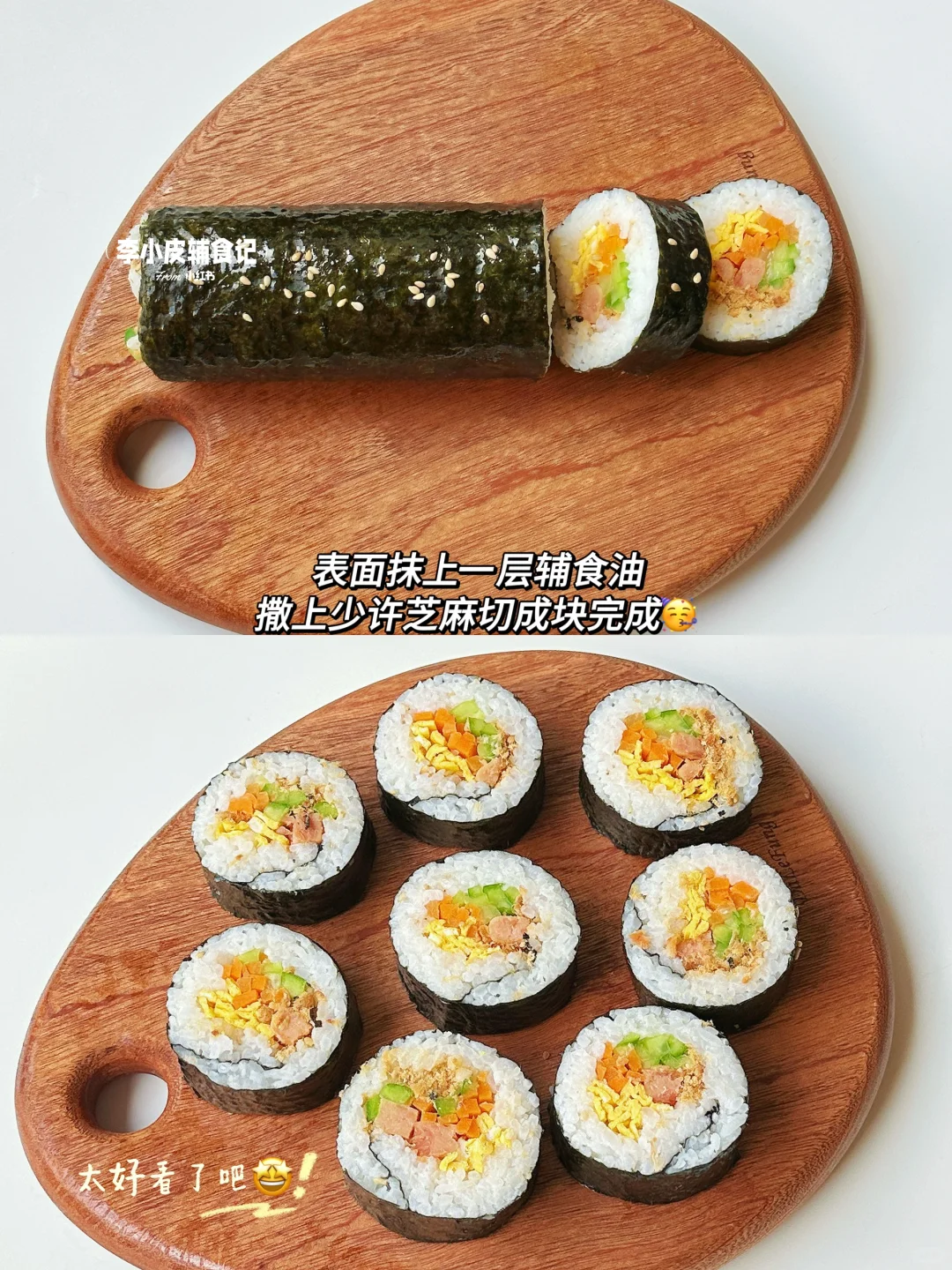🌀配菜可随意换成宝宝爱吃的蔬菜肉类,注意米饭的水分不要太大,否则做好的寿司发黏会影响口感喔🍥