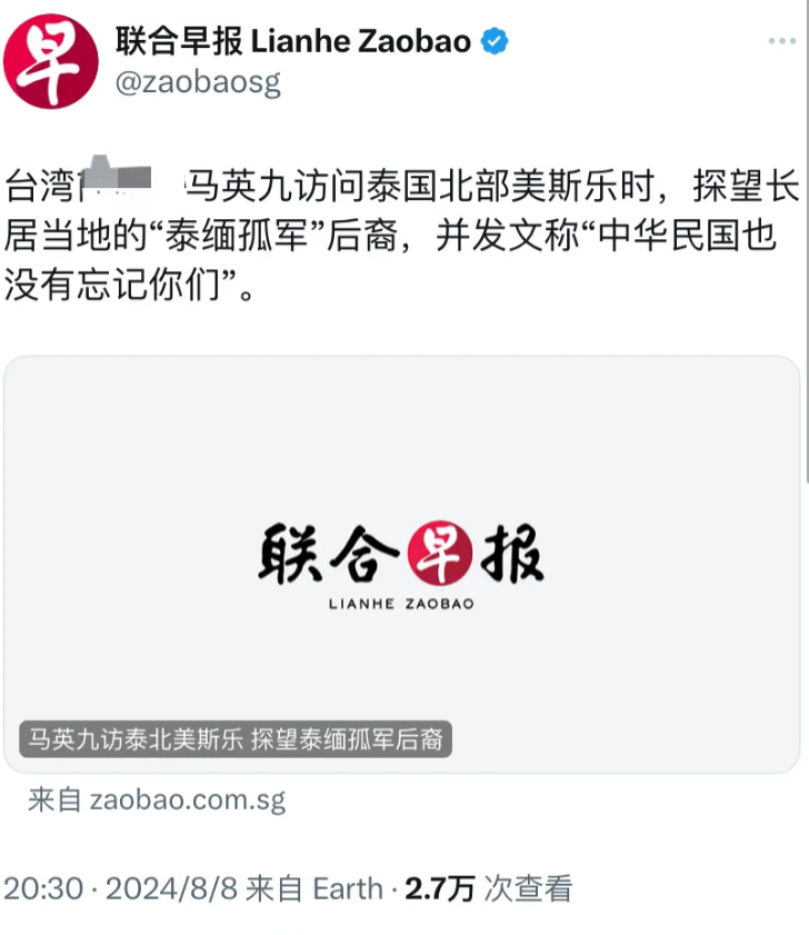 外媒昨晚报道:马英九访问泰国北部美斯乐时,探望长居当地的“泰缅孤军”后裔,并发文称“中华民国也没有忘记你们”。