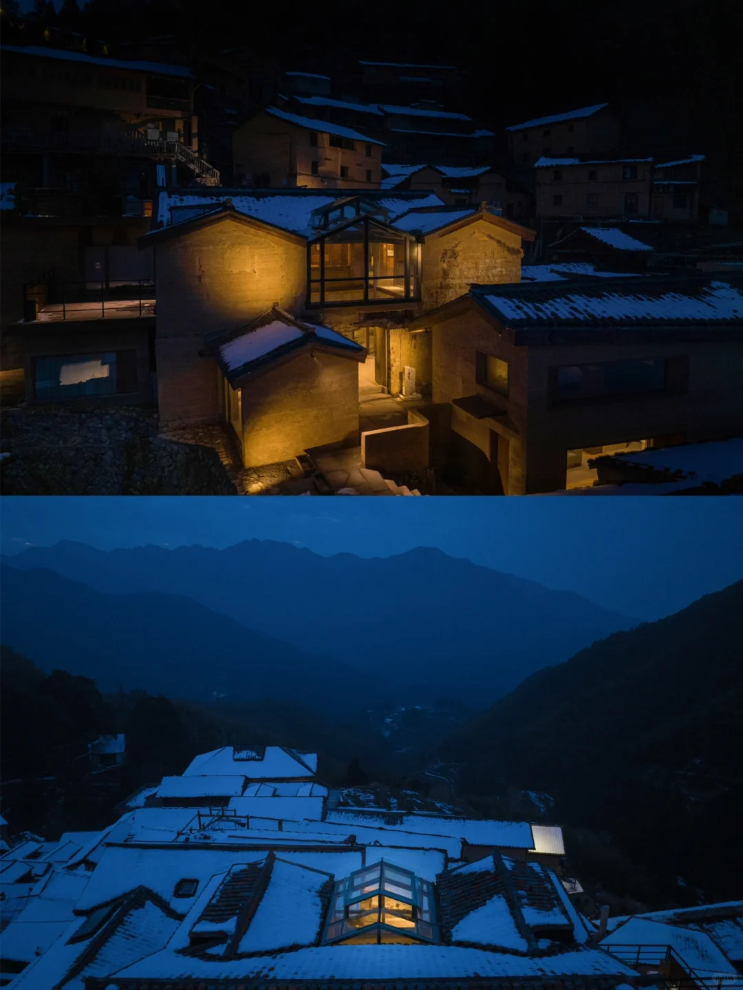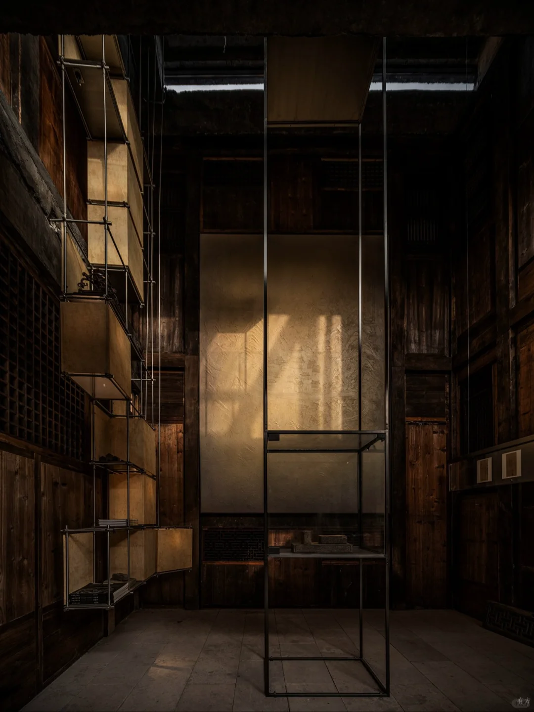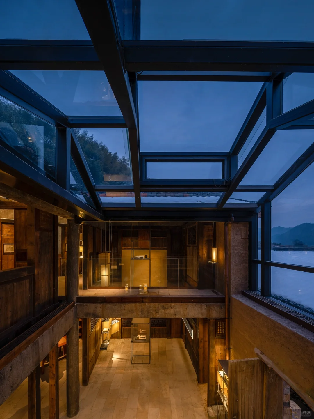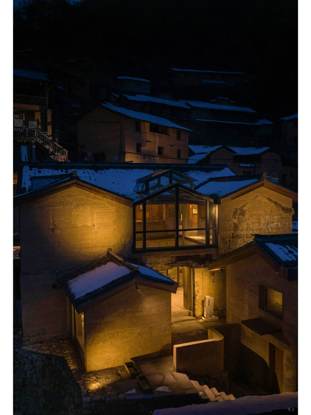 设计团队认为十钟山房博物馆应以尊重村落原始肌理为宗旨,决定用一个玻璃天顶去重构一个属于陈家埔村的新的公共空间,将部分建筑拆除重构,以夯土与木构“房中房”来组织空间。