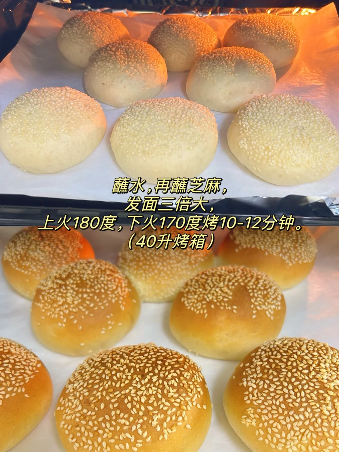 3.分成8个面包胚。蘸水再蘸芝麻。4.发面到2-3倍大。(35度100分钟)