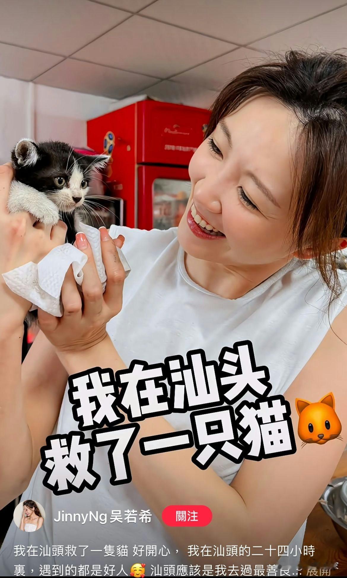TVB力捧女星内地拯救猫咪竟冒认系大S 路人当场做出呢个反应 32岁吴若希(Jinny)自从与老公何兆鸿(Alex)结婚後,育有一仔一女,一家四口幸福美满。Jinny即使已经荣升人妻,仍然没有放弃演艺事业,近年她积极接拍剧集,而去年更凭台庆剧《香港人在北京》「升呢」角逐视后并顺利入围十强。最近吴若希在小红书分享一段「我在汕头救了一只猫」的影片,她在影片中竟冒认系大S,路人当场做出呢个反应。 吴若希内地拯救猫咪竟冒认系大S 吴若希写上:「我在汕头救了一只猫好开心,我在汕头的二十四小时里,遇到的都是好人感汕头应该是我去过最善良的城市。」影片中的她积极在车厢的位置拯救猫咪,拯救完小动物後,她找到一间愿意收留猫咪的店家,对方的老板询问吴若希:「你真的是明星吗?」吴若希回覆:「我是大S。」而对方则回覆:「有点像。」吴若希最後面向镜头说:「大S用蓝莓啤酒嗰盒拯救一只猫。」有网民则留言回覆:「不过这一个大S有点离谱,有经过大S同意吗?」吴若希则回覆网民:「我刚出道的时候,他们叫我翻版大S。」