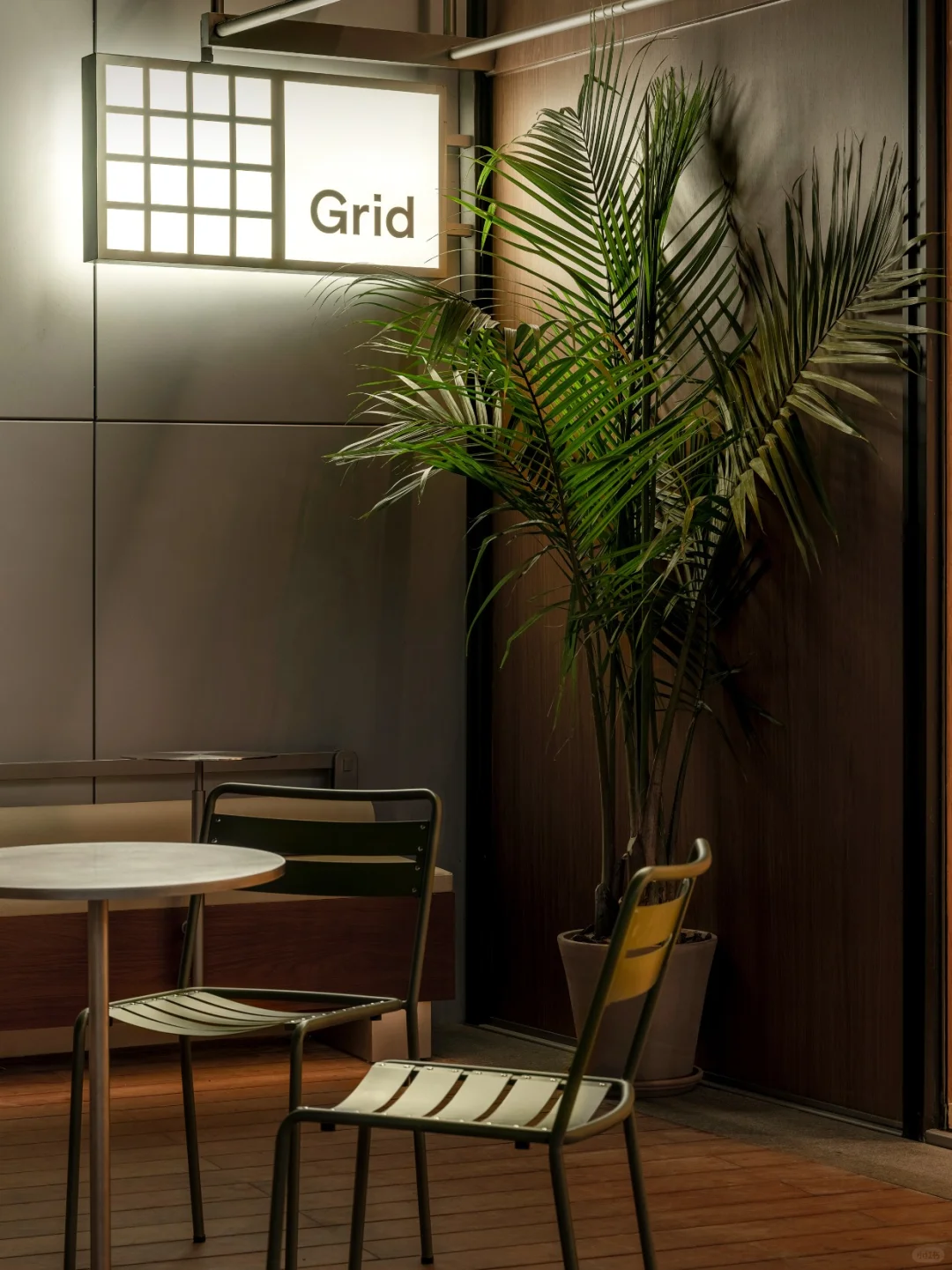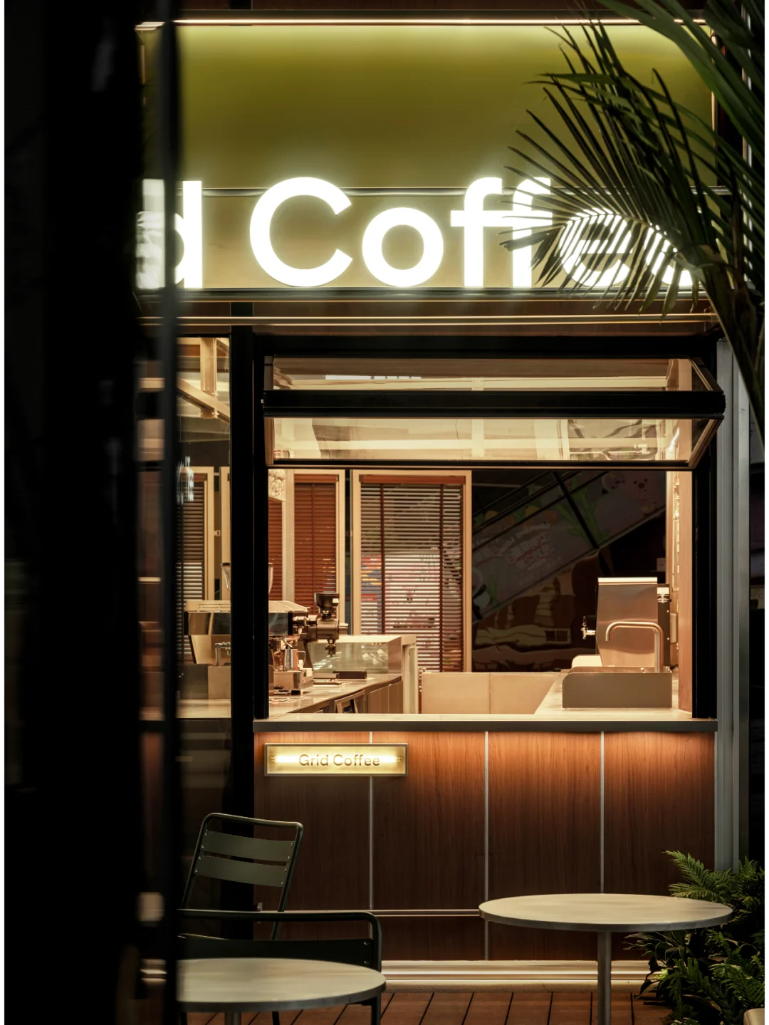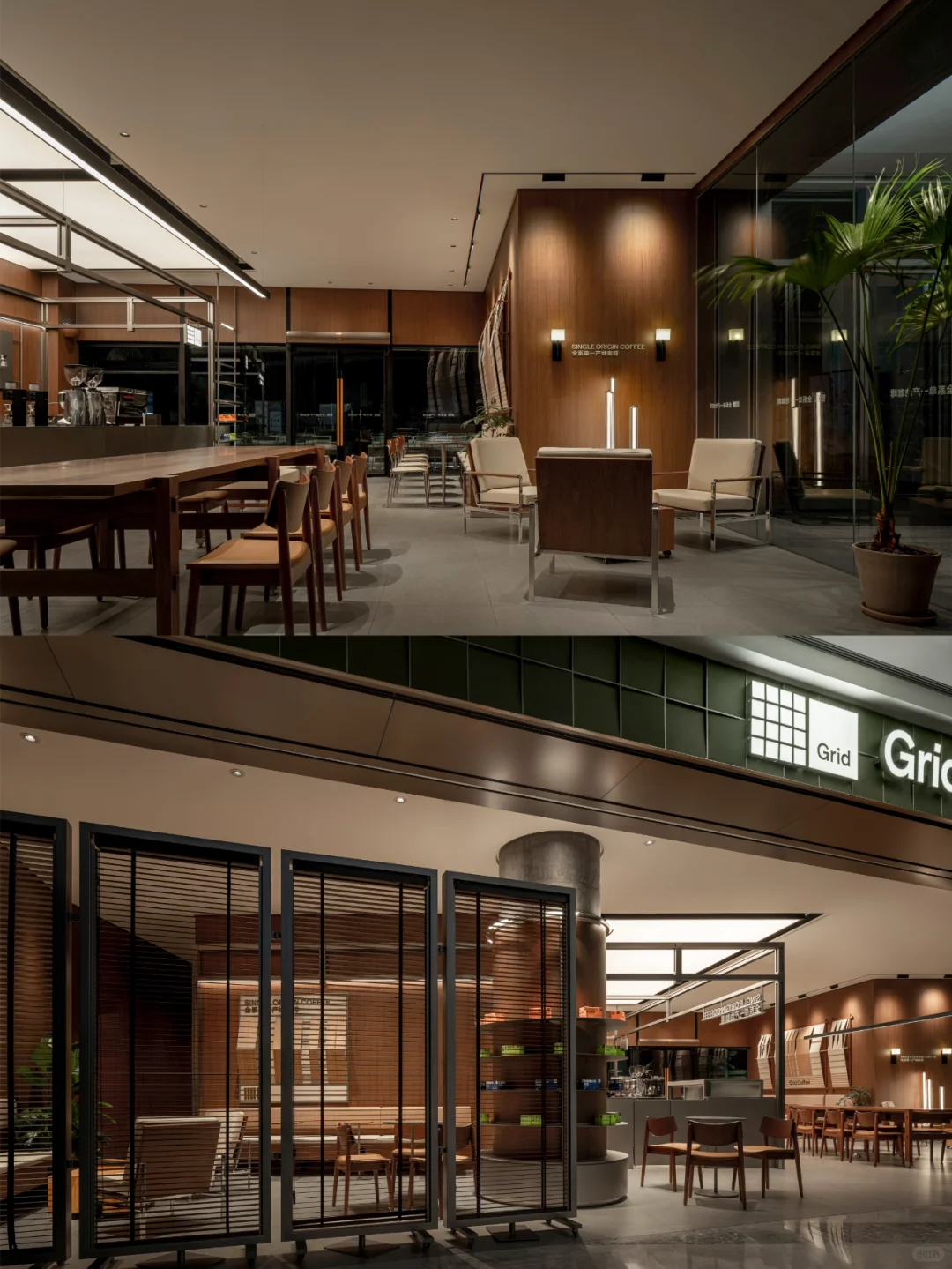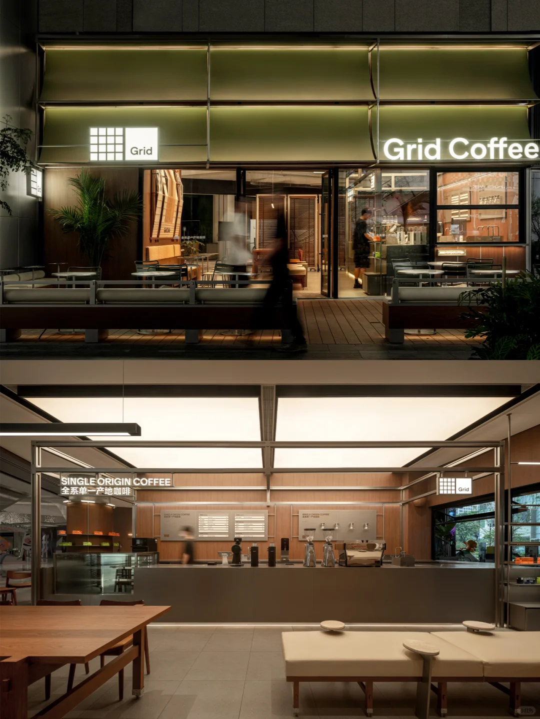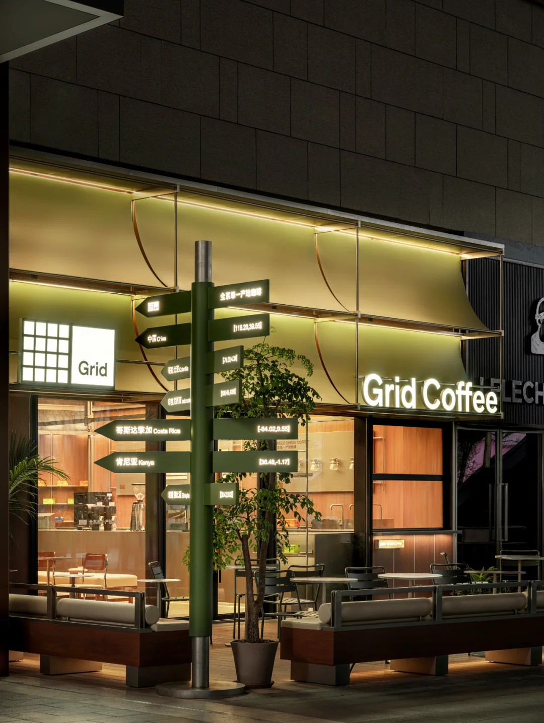 由笑脸蜘蛛打造的Grid Coffee,位于成都香港置地光环购物公园。室外外立面采用品牌标志性的绿色增强品牌辨识度。选用超薄钢板材质并设计成弧形,其独特的质感仿佛让人置身于轻松的露营氛围中,营造出都市中的悠然自得感。