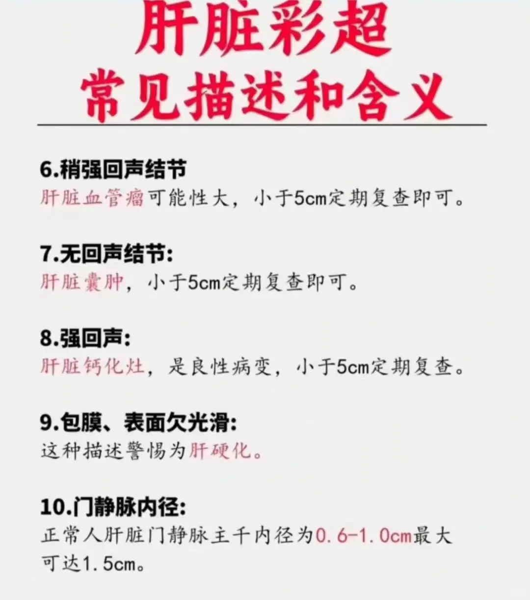 给大家看看肝脏彩超常见描述及其含义,其中第一项多为正常肝脏的描述,如果你的彩超报告中出现其他提示一定要注意,及时咨询专业医生明确病因,也可以把你的检查单发给我,抓住机会很重要,不要错失治疗时机!