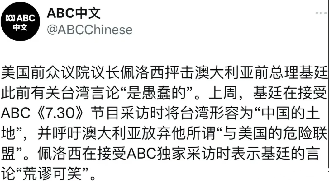8月13日,澳媒报道:美前众议院议长佩洛西抨击澳大利亚前领导人基廷的涉台言论“是愚蠢的”。上周,基廷在接受ABC《7.30》节目采访时,称它们都是“中国的土地”,并呼吁澳大利亚放弃与美国的“危险联盟”。佩洛西在接受ABC采访时表示基廷的言论“荒谬可笑”。