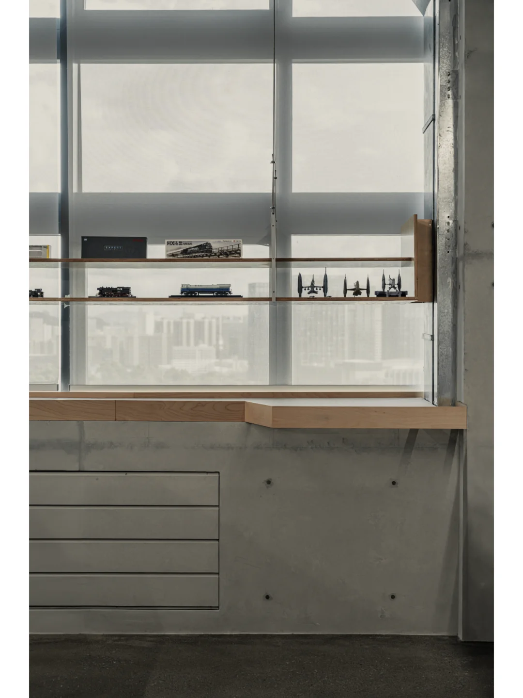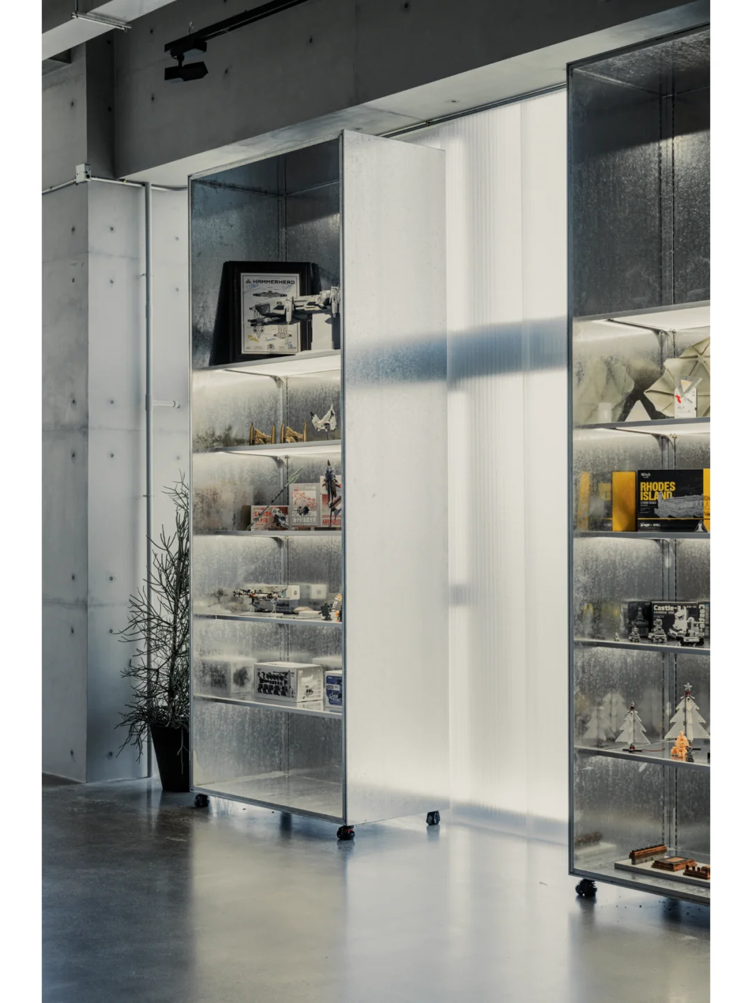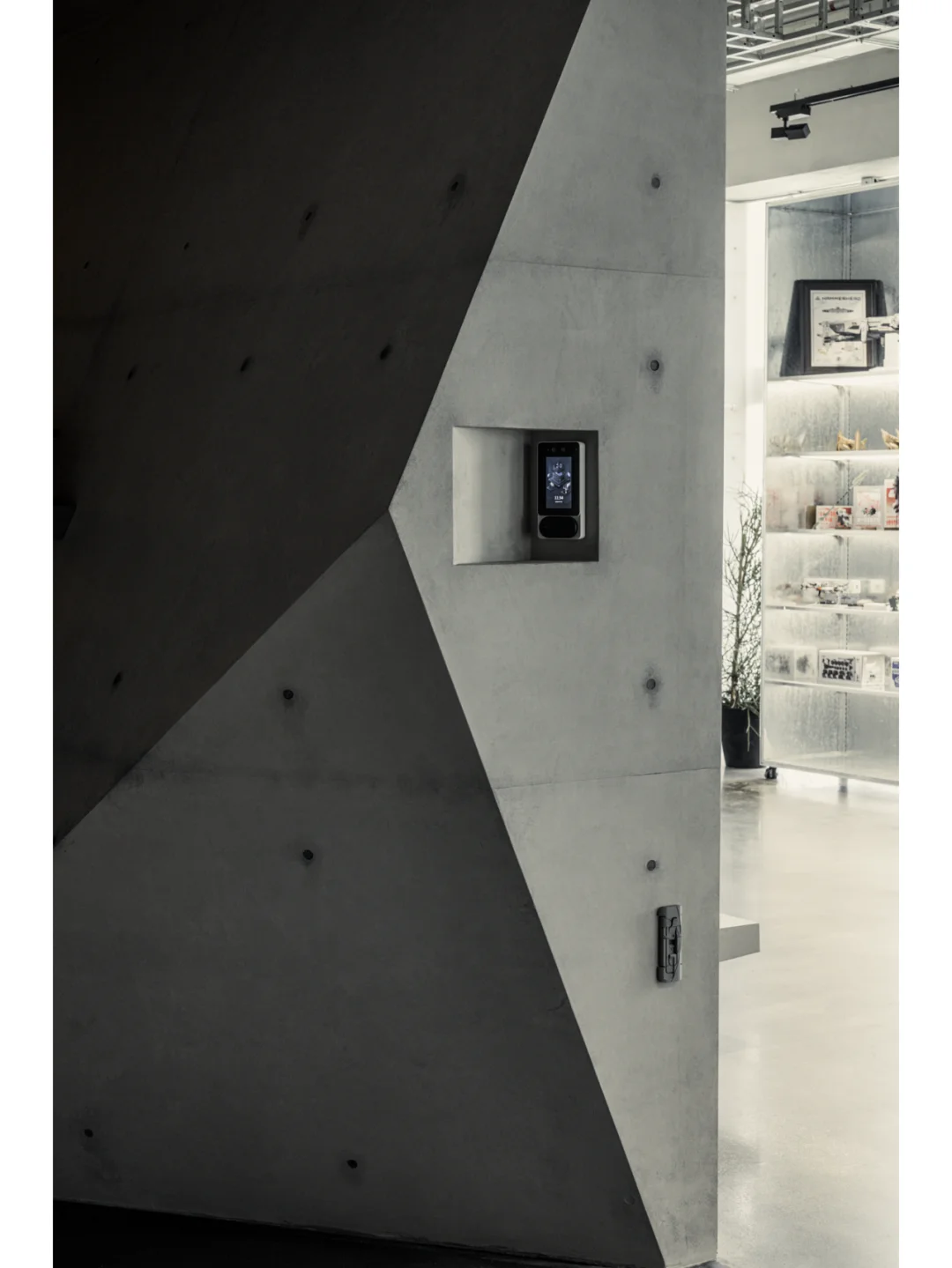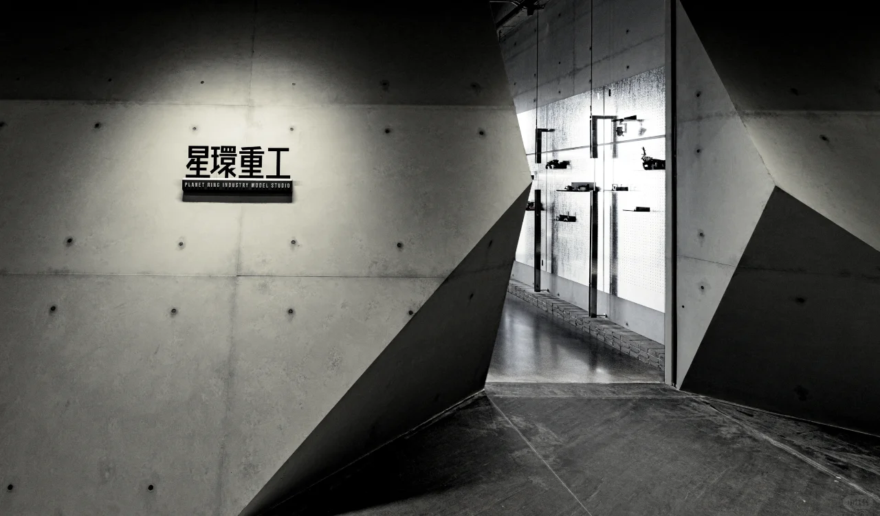 展厅秉持外立面的设计元素,由金属材质延续混凝土的粗犷和体块感,实现空间效果的统一。同时设置了灵活多变的收纳系统,方便依据不同大小的模型产品更换布局。