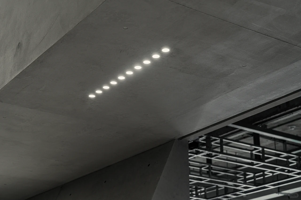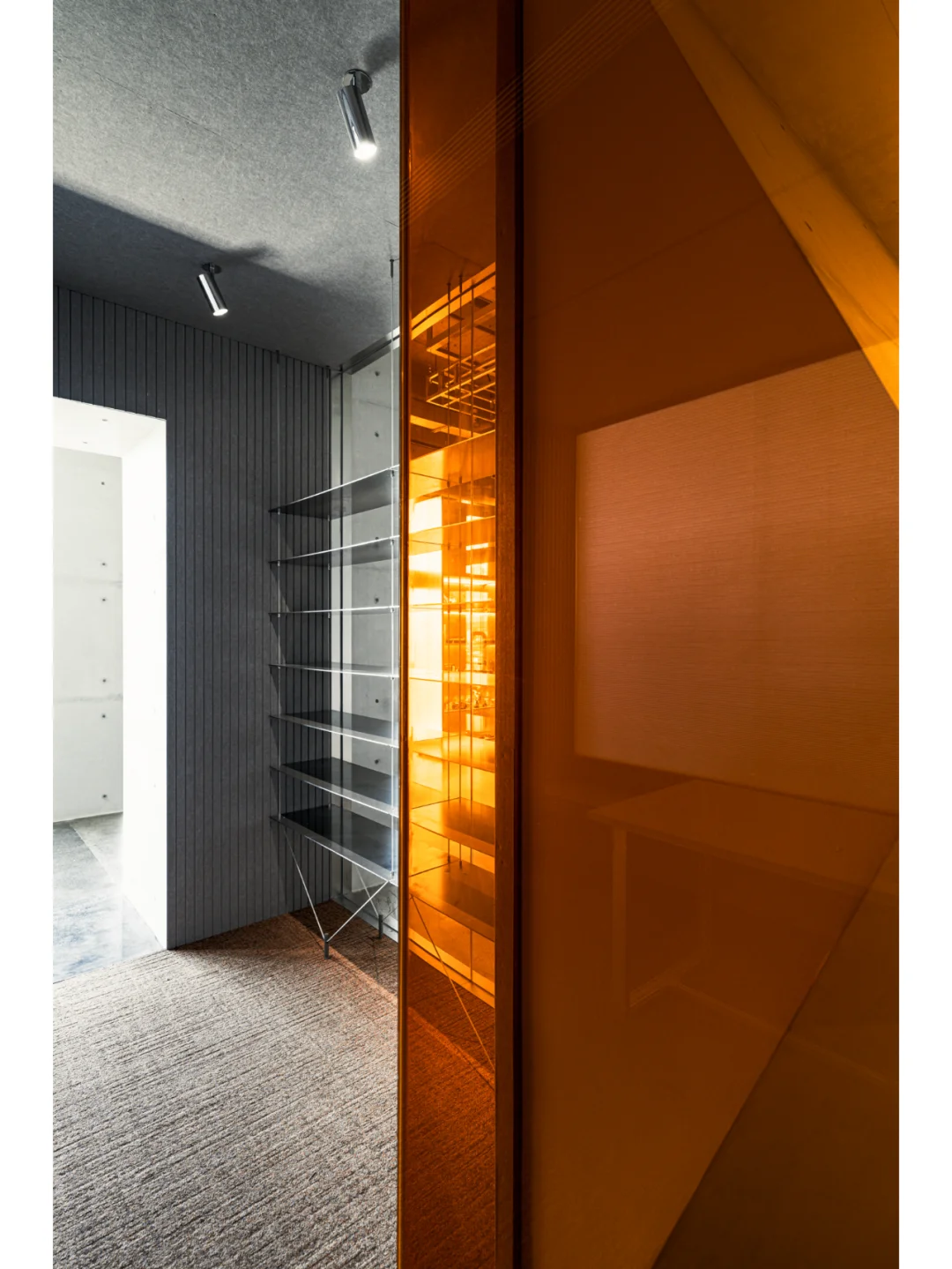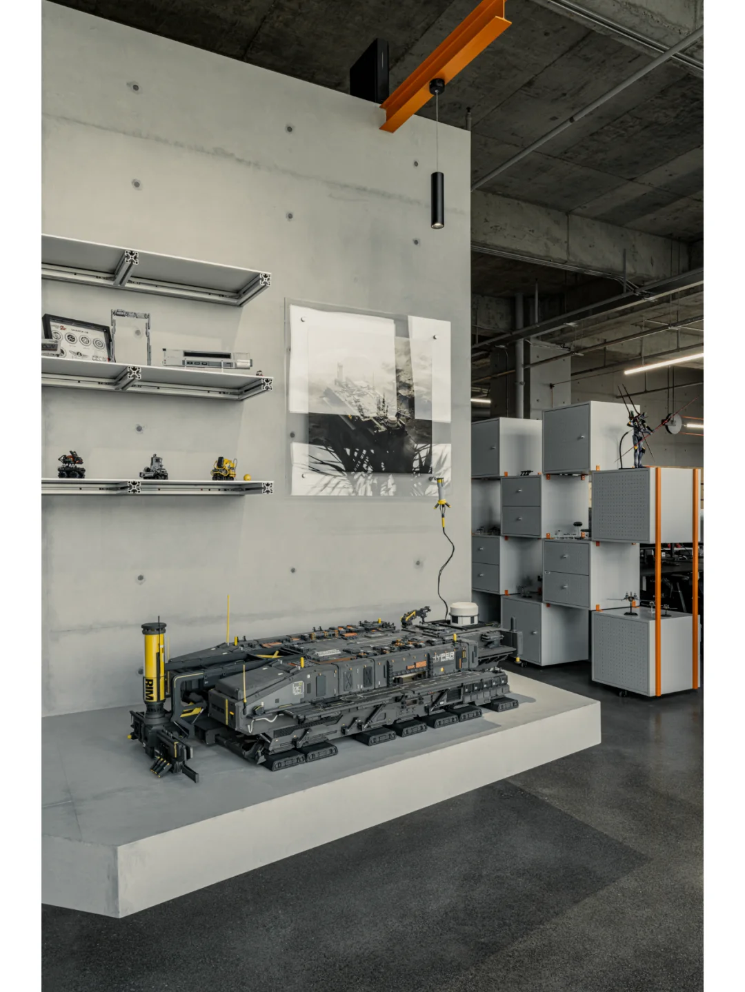 展厅秉持外立面的设计元素,由金属材质延续混凝土的粗犷和体块感,实现空间效果的统一。同时设置了灵活多变的收纳系统,方便依据不同大小的模型产品更换布局。