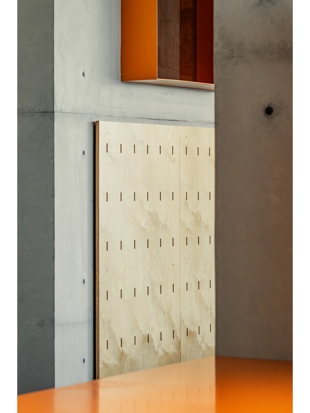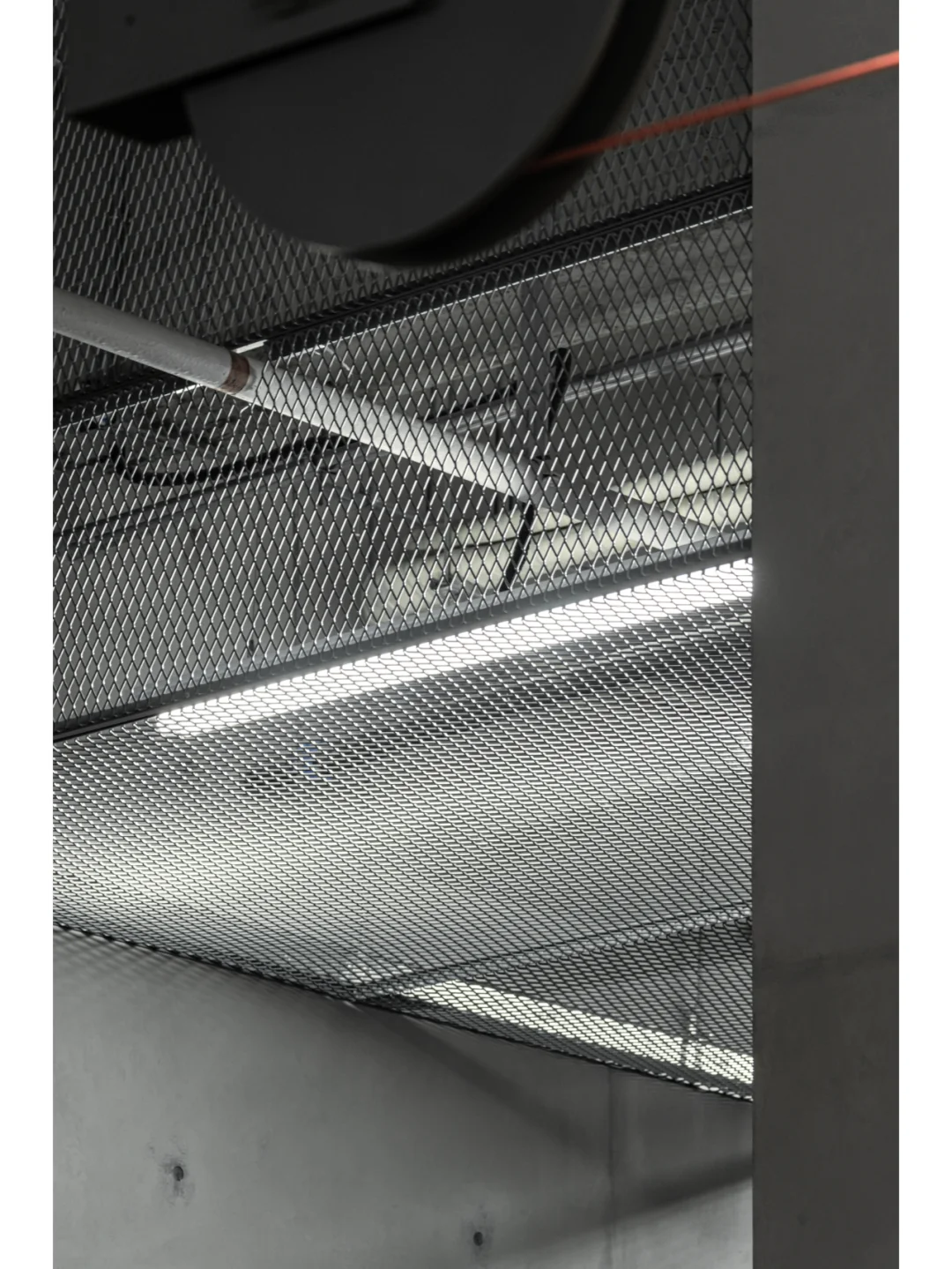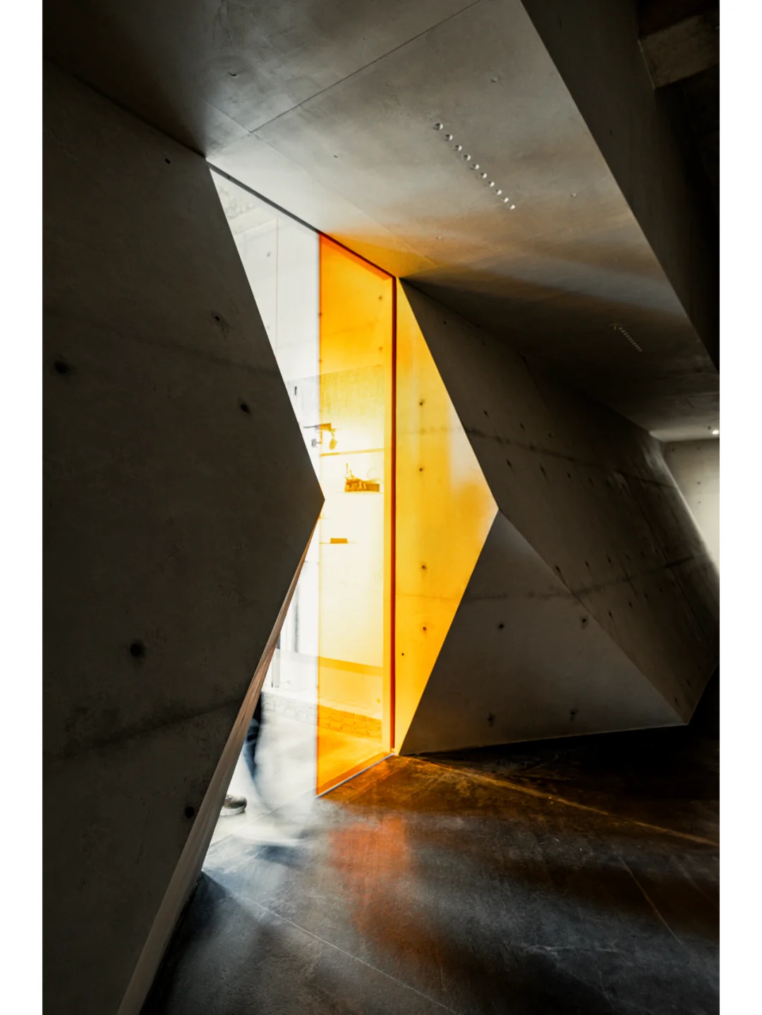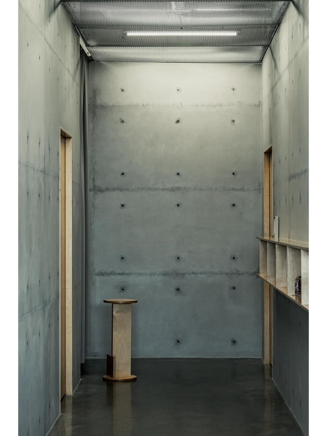展厅秉持外立面的设计元素,由金属材质延续混凝土的粗犷和体块感,实现空间效果的统一。同时设置了灵活多变的收纳系统,方便依据不同大小的模型产品更换布局。
