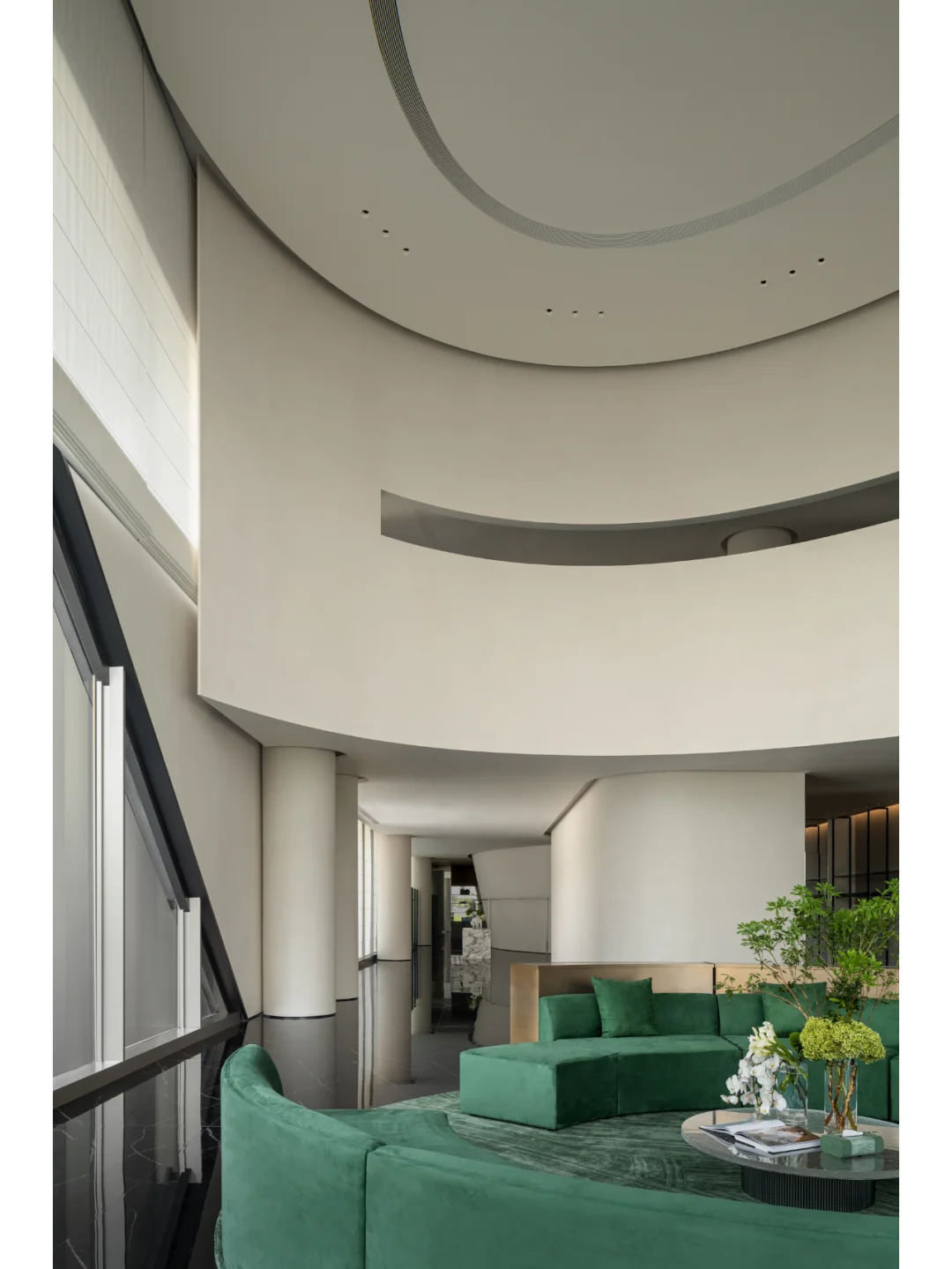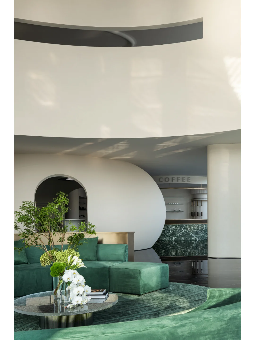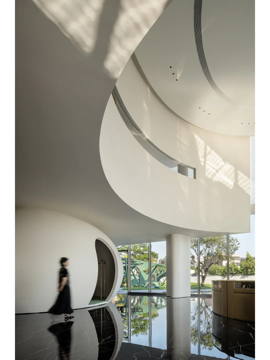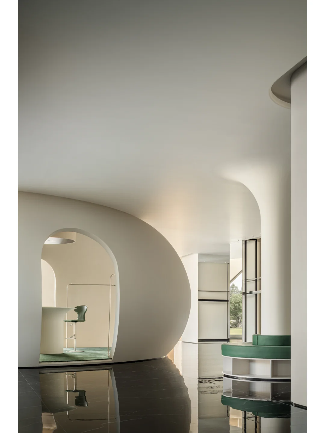 鉴于原有建筑形态先锋且具有力量感,MOOY木一小土设计团队以山茶花为灵感,在室内空间中转译“花瓣”形态,以打造柔美而灵动的丰富空间,与原有建筑形成一种戏剧性的反差,力量和柔美并存。