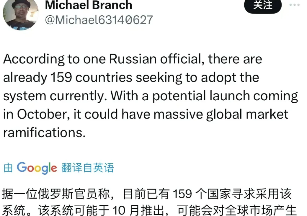 俄媒报道称,克宫主管金融的官员透露:目前已有159个国家支持使用该系统,它原定于10月喀山金砖国家峰会上对外公布,有分析人士表示,该消息的可信度较高,原因有两个方面: