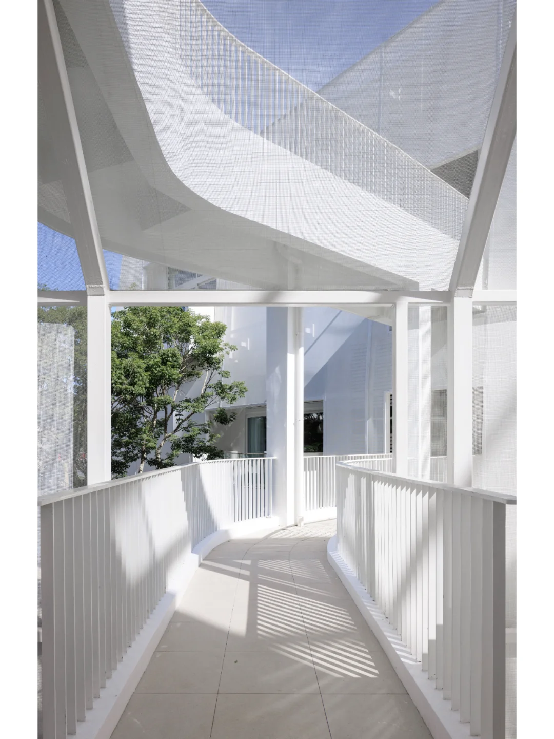 🏙️ 因为结构荷载的限制,用轻质的膜代替常用的穿孔铝板。三种不同穿孔率的法拉利膜从低往高,透明度渐变为大,形成了半透明的仿佛山峰一样的视觉边界。并在海南炽热的阳光下在屋顶形成了闪烁的效果,这也是flickering的由来。
