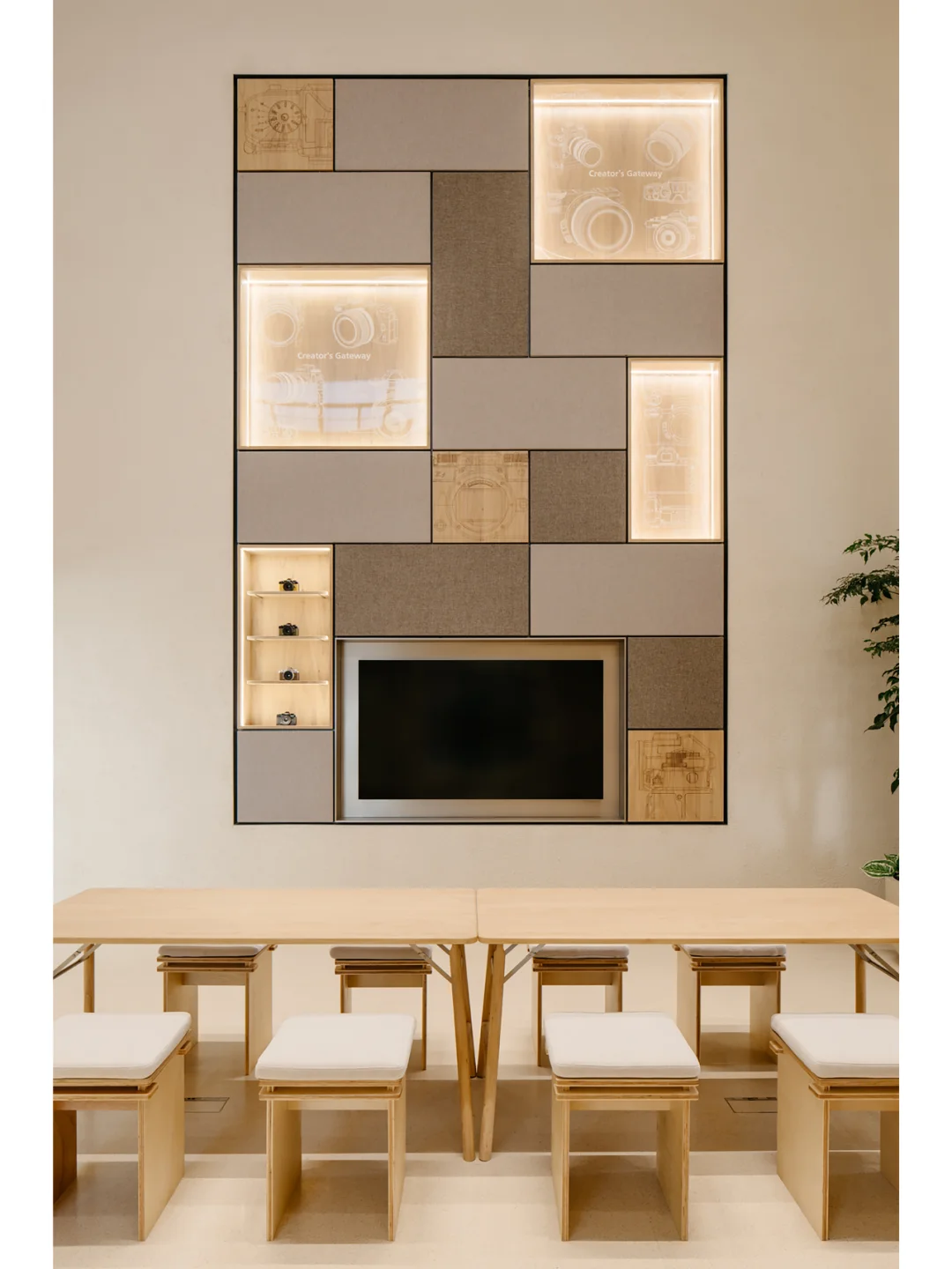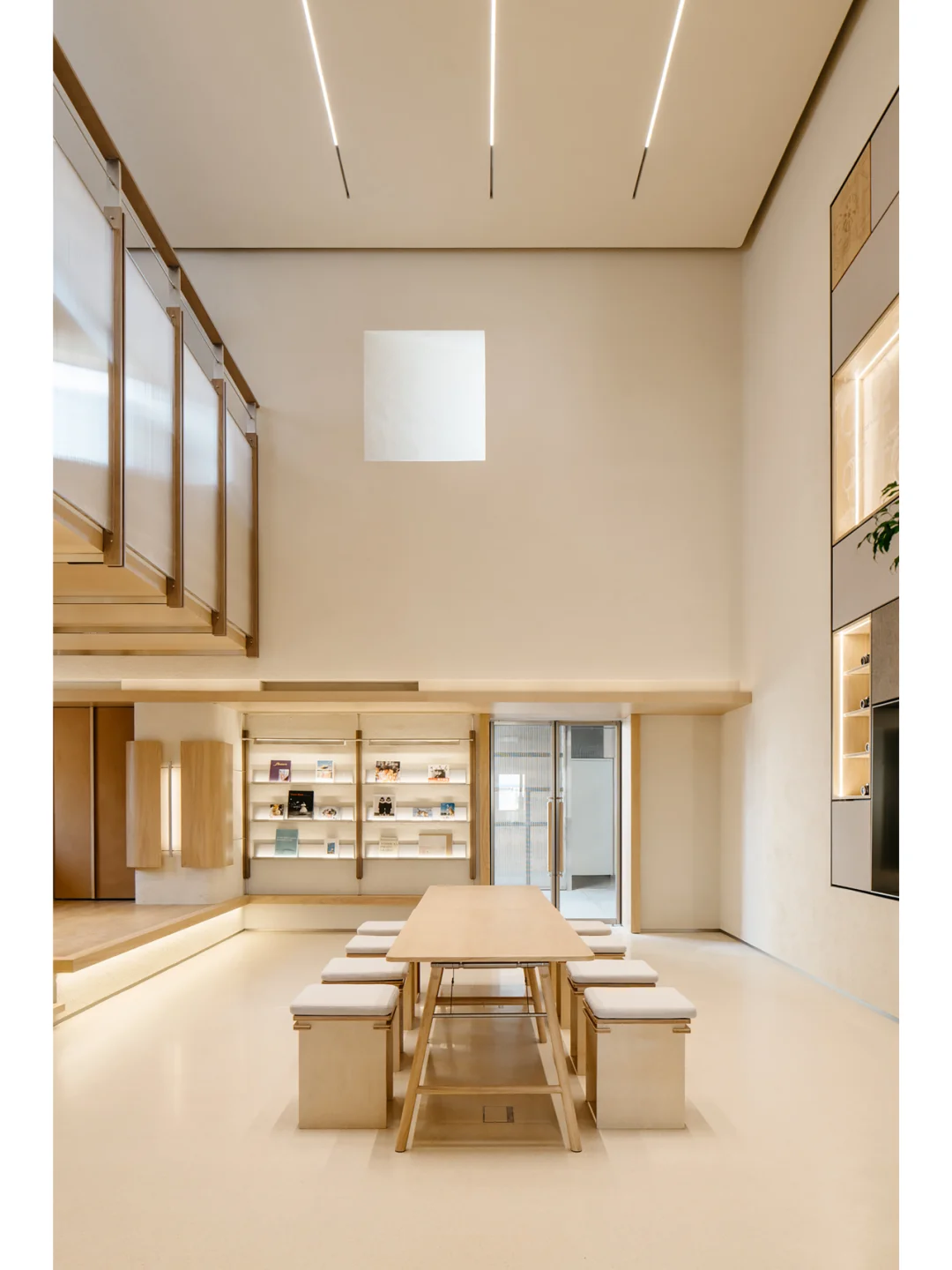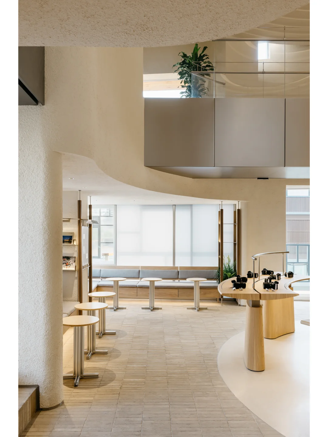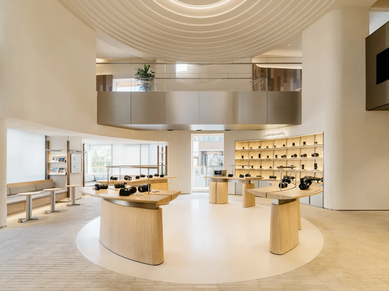 圆形挑高中庭成为汇聚视觉的空间核心,四周功能空间与其在布局上形成嵌套关系,成为连接各区域的枢纽。地铺用上从北京古旧建筑拆迁后回收而来的老青砖,既环保又富有在地性。整个空间中的展示道具混合榆木肌理与不锈钢细部,延续了自然与科技融合的主题。 叠级的圆形天花,灵感源自相机镜头的多层构造,为空间带来优雅的能量源。