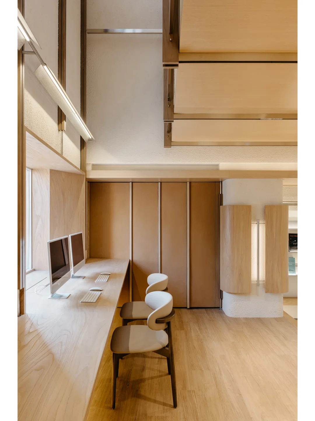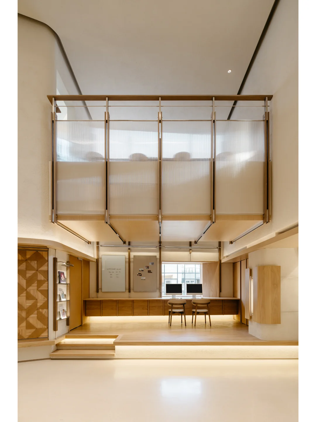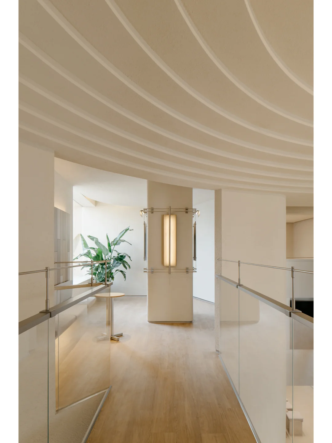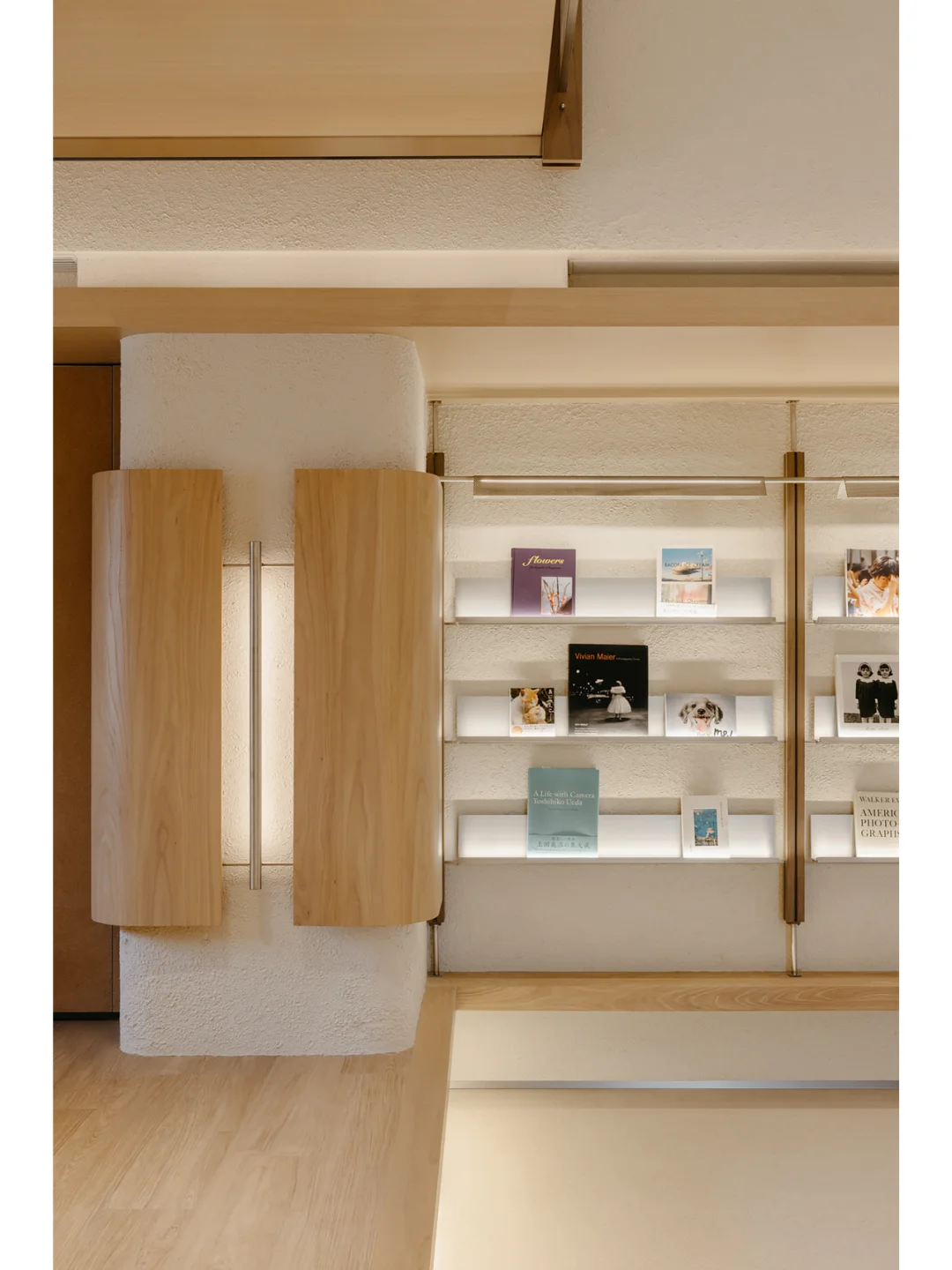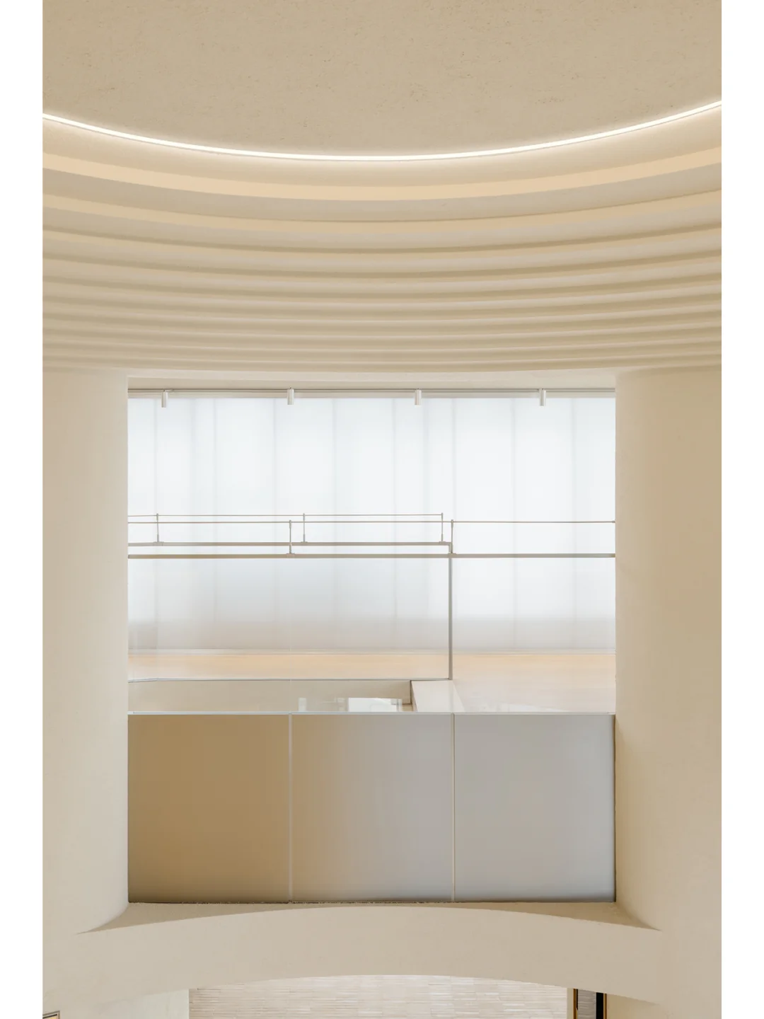 圆形挑高中庭成为汇聚视觉的空间核心,四周功能空间与其在布局上形成嵌套关系,成为连接各区域的枢纽。地铺用上从北京古旧建筑拆迁后回收而来的老青砖,既环保又富有在地性。整个空间中的展示道具混合榆木肌理与不锈钢细部,延续了自然与科技融合的主题。 叠级的圆形天花,灵感源自相机镜头的多层构造,为空间带来优雅的能量源。