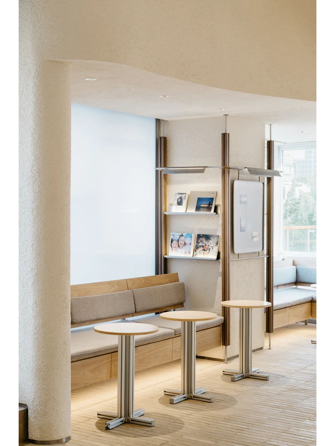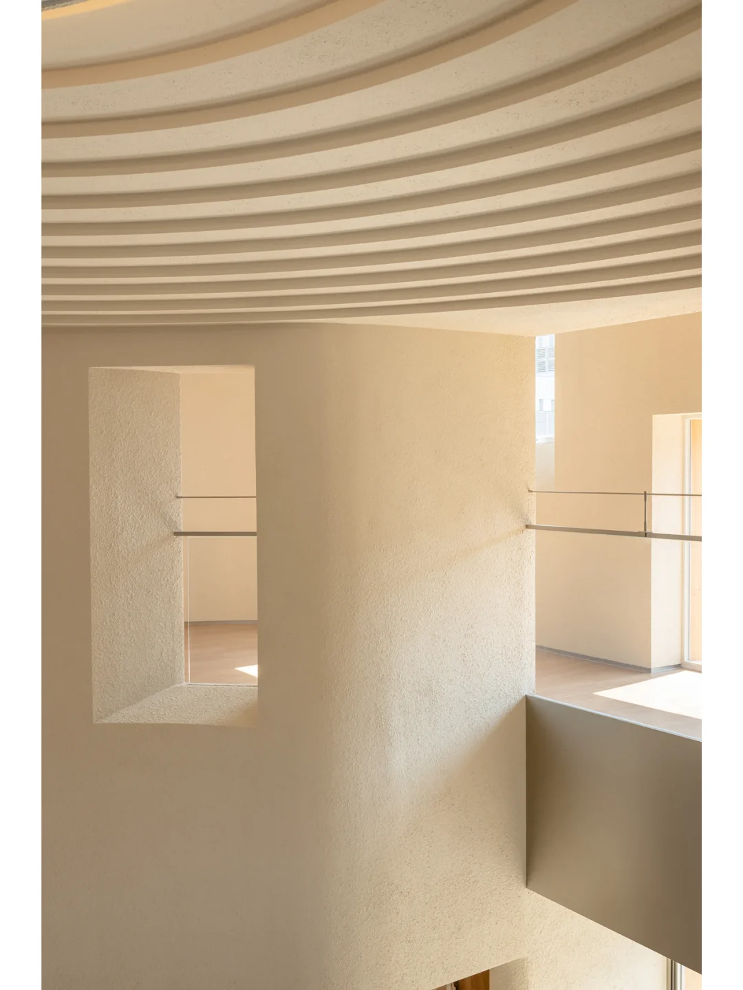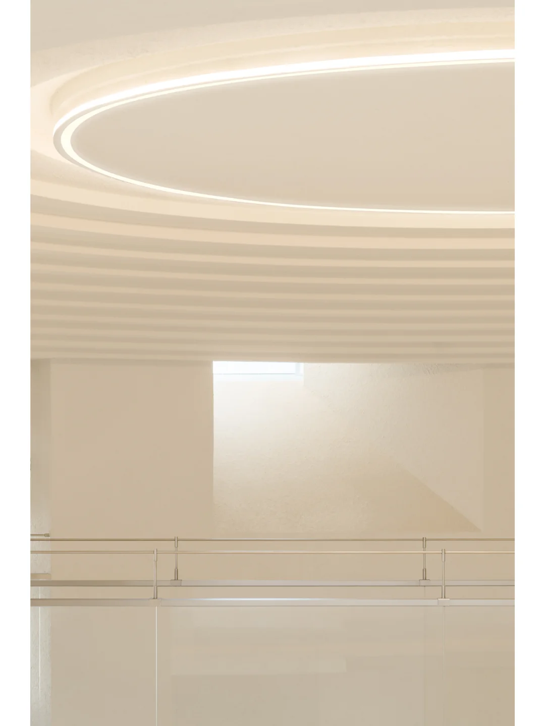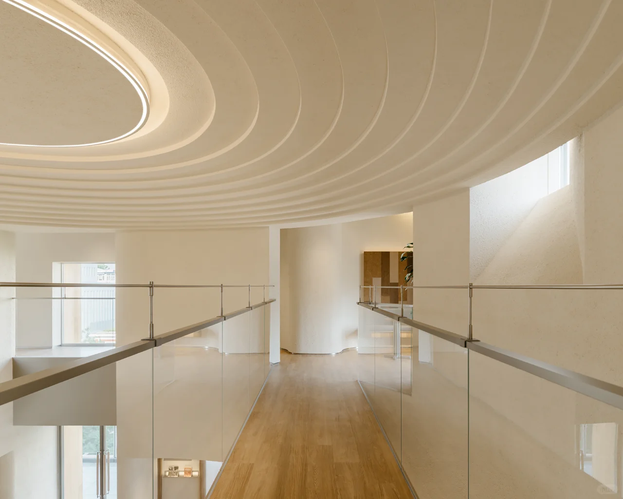 圆形挑高中庭成为汇聚视觉的空间核心,四周功能空间与其在布局上形成嵌套关系,成为连接各区域的枢纽。地铺用上从北京古旧建筑拆迁后回收而来的老青砖,既环保又富有在地性。整个空间中的展示道具混合榆木肌理与不锈钢细部,延续了自然与科技融合的主题。 叠级的圆形天花,灵感源自相机镜头的多层构造,为空间带来优雅的能量源。