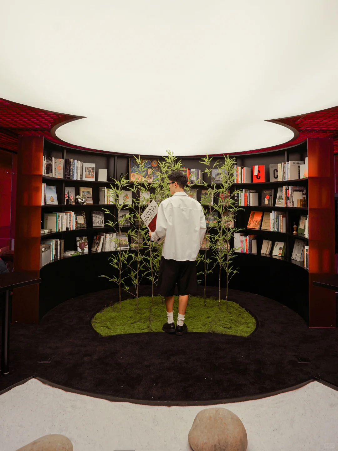 背景是一整面书墙,视觉上满震撼的