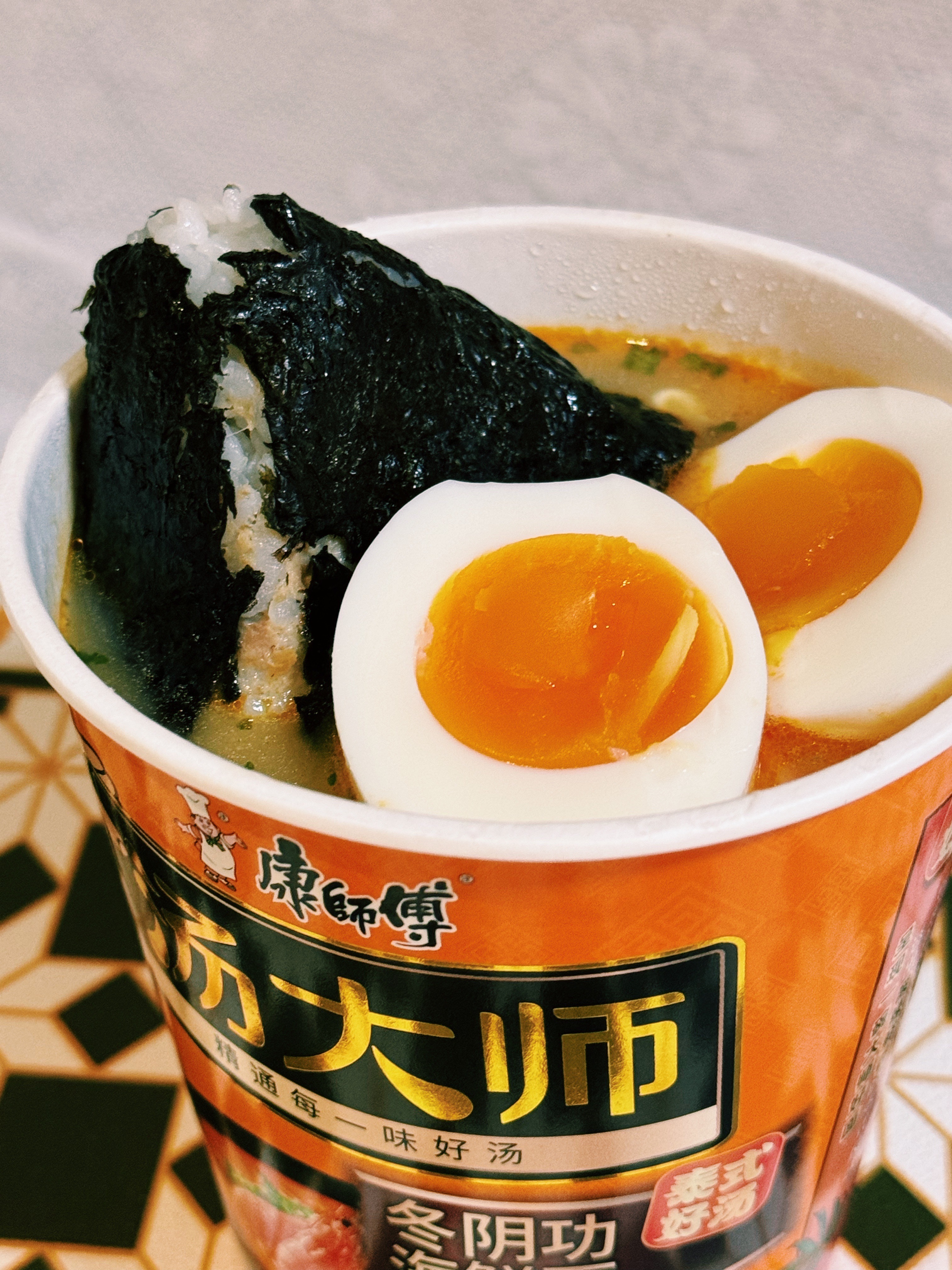 康师傅干拌面➡️年糕➡️拌面酱➡️三角饭团➡️芝士片➡️奶酪棒➡️加水➡️微波炉(2分钟)➡️溏心蛋➡️撒海苔碎➡️烤肠