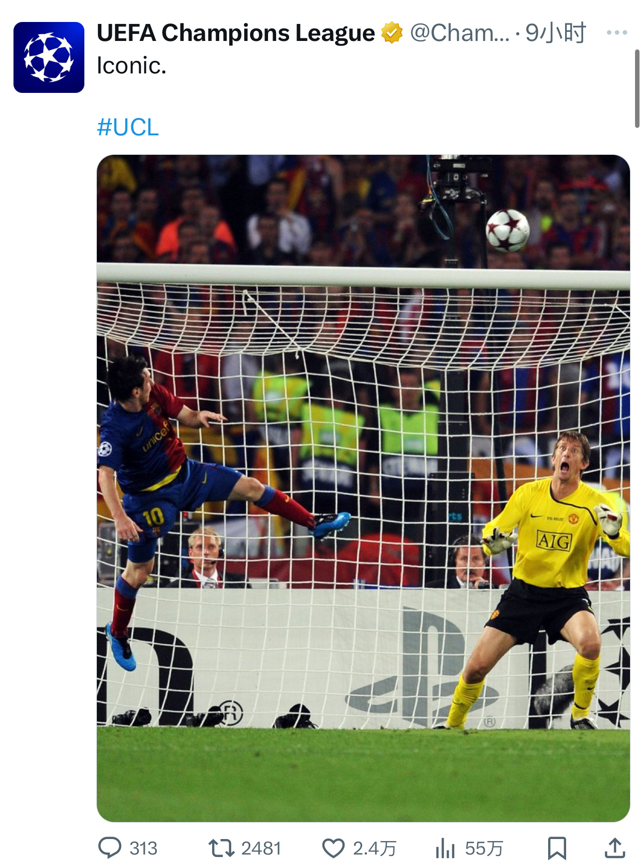 欧冠官推晒梅西经典头球破门:标志性的#梅西[超话]#