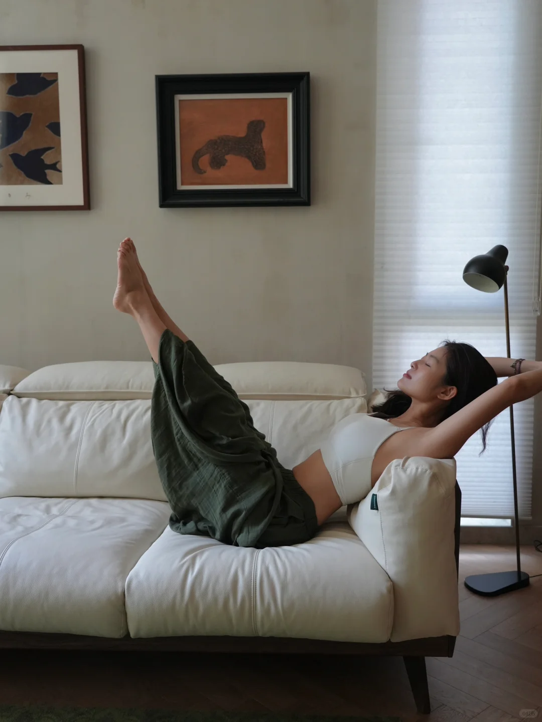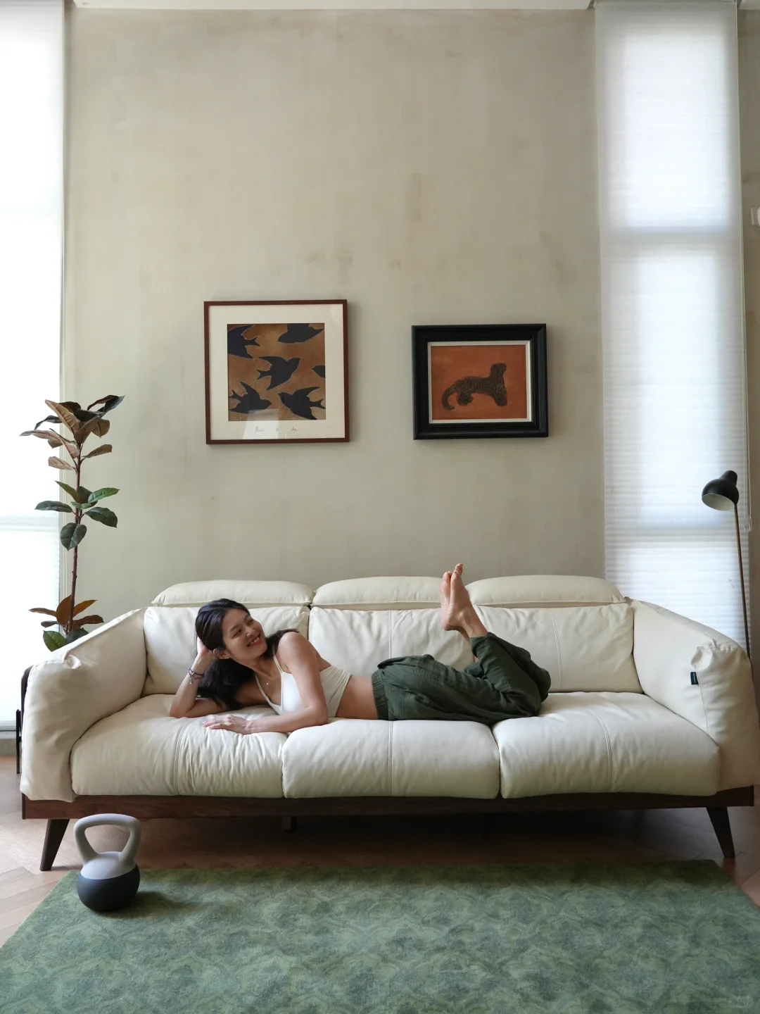 沙发的坐感既厚实又柔软,既有白鹅羽绒+公仔棉的蓬松柔软感,也有高密度海绵提供支撑力,在上面练瑜伽,完全不会软塌塌,很有支撑性,而且运动完也可以在沙发上彻彻底底舒适拉伸,我发现在这里做“大休息术”,时间可以无限延长,彻底躺平。