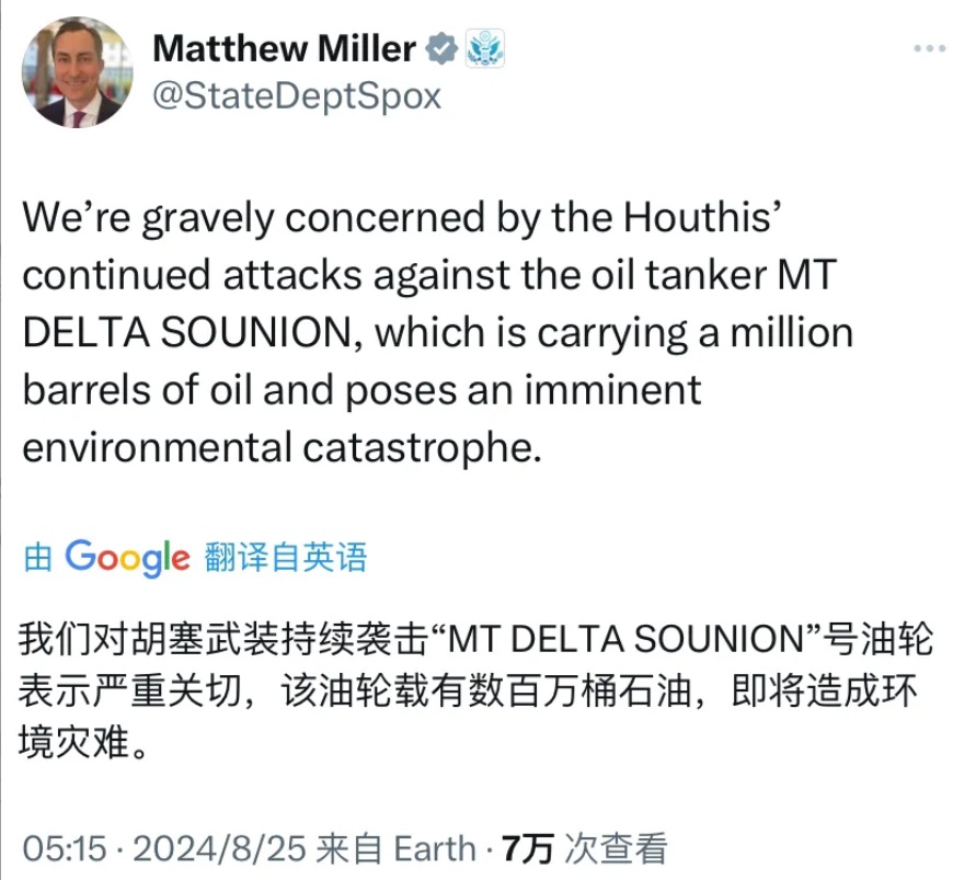 美国国务院发言人马修·米勒今天写道:“我们对胡塞武装持续袭击‘MT DELTA SOUNION’号油轮表示严重关切,该油轮载有数百万桶石油,即将造成环境灾难。”