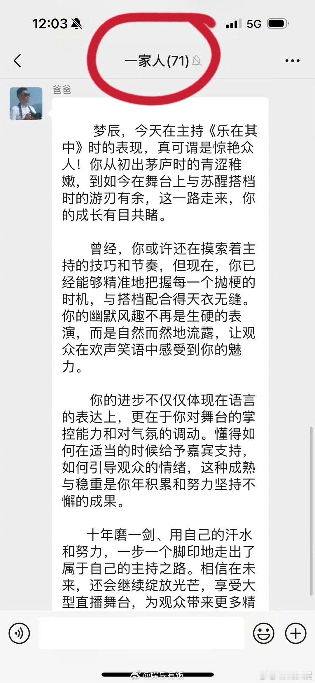 #沈梦辰家族群有71个人# 不得不佩服沈梦辰的爸爸,在如此庞大的家族群里,勇敢地表达对女儿的爱与赞扬。
