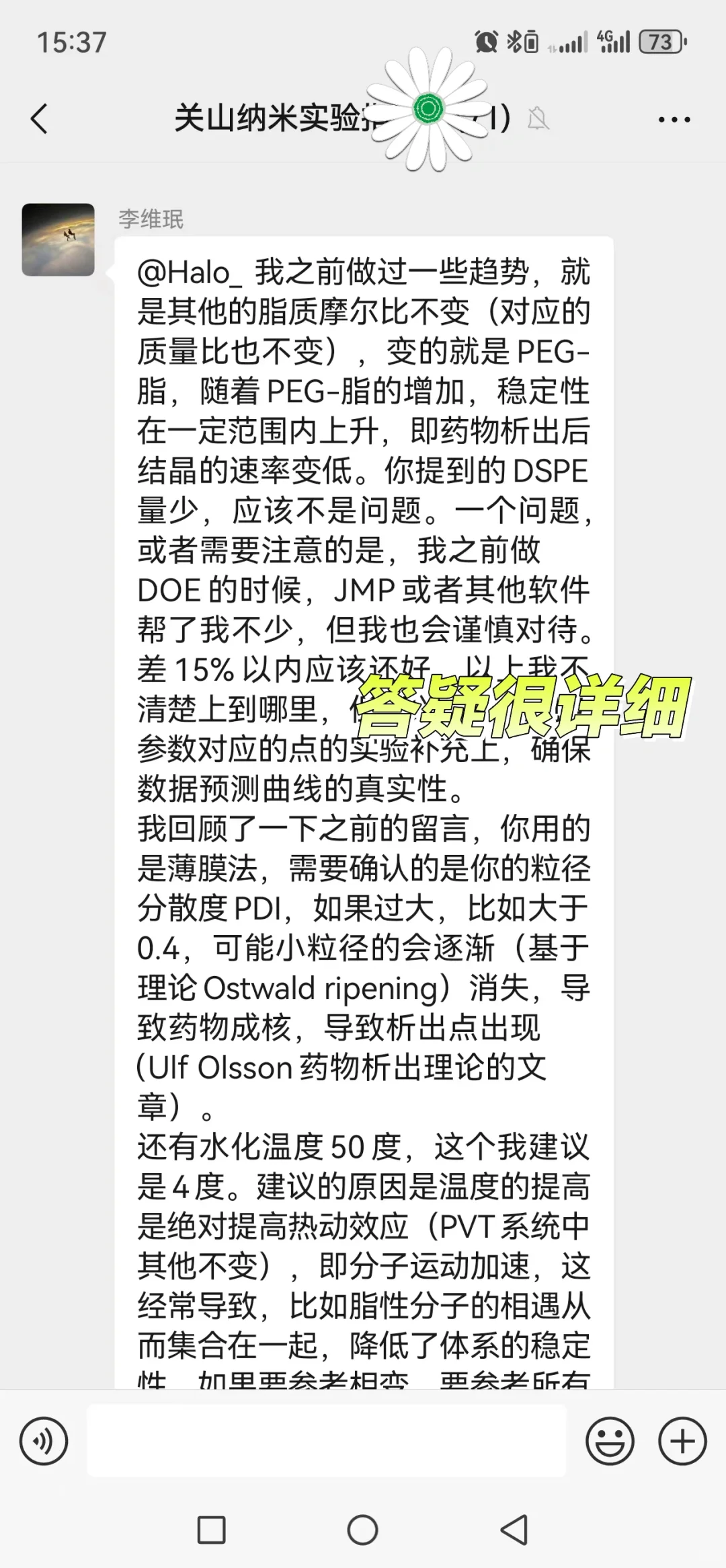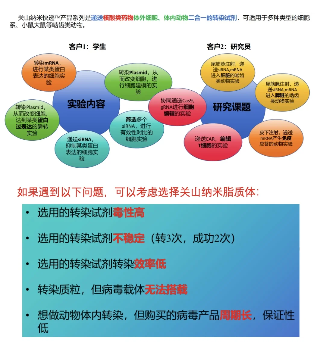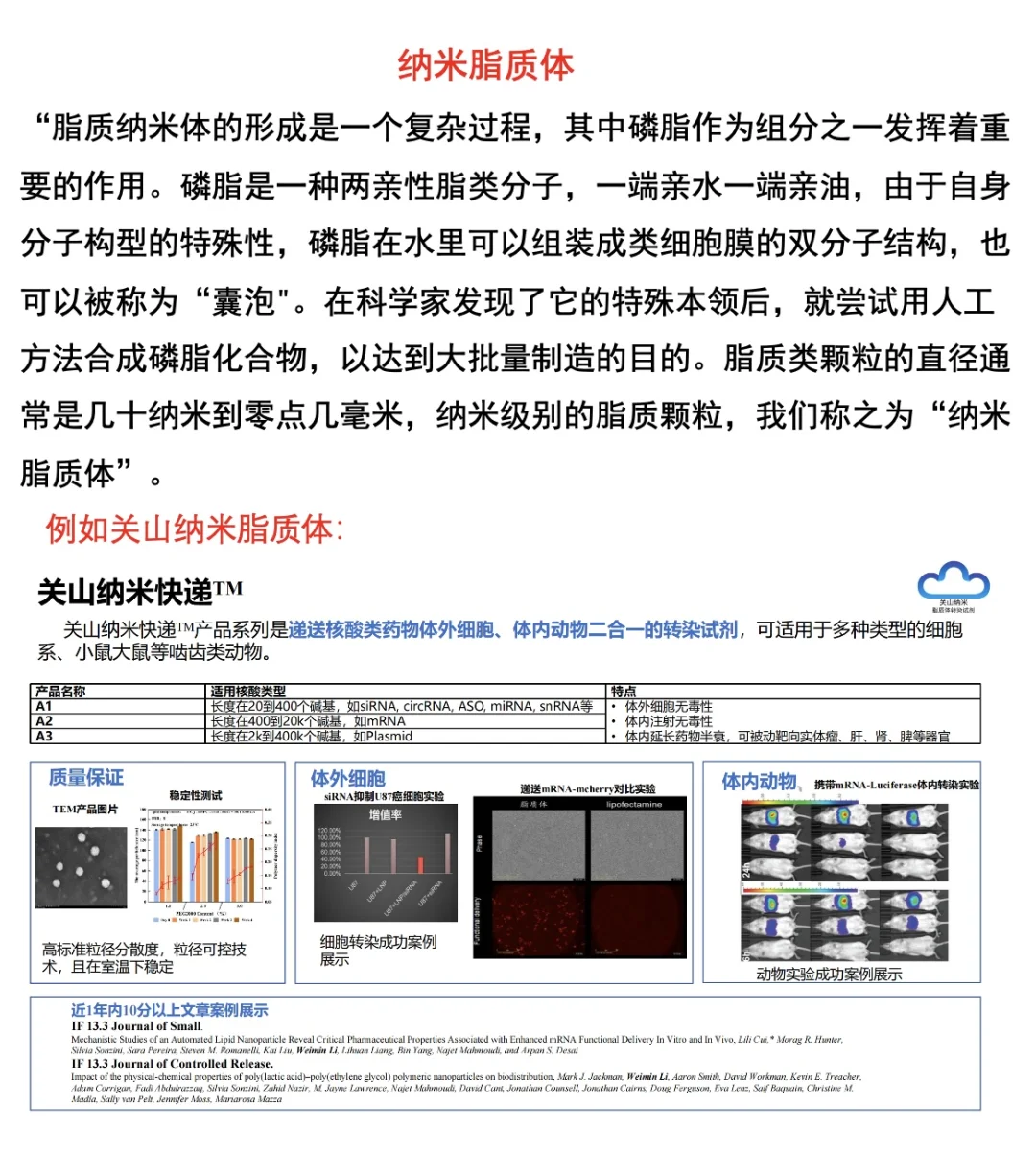 图片来源于文献(图1右下角),这不比小分子药物好做吗?😂 ➡️纳米颗粒递送常用NP类型介绍: ✅1、脂质体 包封率高、靶向性好、毒性低。亲水性治疗剂可被包裹在脂质纳米体内的水环境中,疏水性治疗剂可以被包载于磷脂双分子层中,治疗剂可装载于脂质纳米体内或脂质纳米体表面。 ✅2、 聚合物胶束 疏水内核和亲水外壳,制备简单、易于表面修饰。疏水性药物可以被包载于胶束的疏水内核中,易于随淋巴管渗透至淋巴结内,有利于肿瘤抗原和免疫佐剂的递送。 ✅3、金属/无机纳米 载💊量高、易于功能化修饰、无免疫原性,既是良好的药物载体又是肿瘤治疗剂,例如氧化石墨烯类纳米粒等。 ✅4、纳米凝胶 通过靶向配体修饰、响应性功能键合成等手段,可以合理设计多功能纳米凝胶用于提升化学免疫联合治疗效果。 ✅5、仿生纳米载体 具有仿天然的结构或形态、表面性质和大小,具有更强的靶向性和良好的生物相容性,可将药物输送到靶细胞或组织。白蛋白、高密度脂蛋白等制备的仿生纳米粒已被应用。 🌟推荐【关山纳米】,他们的脂质纳米体可以替代Lipo、PEI、Polyplus、AAV病毒、腺病毒等转染试剂,也就是体内体外转染都能做❗️ 无毒性、是可以直接用于动物实验的👍,操作简单,节省时间和成本,效果都不错,且有文献可以参考,剑桥大牛团队研发的。 ✅除此之外剑桥大团队还提供🆓Colloidal相关科研zi询,纳米载药,包括研发早期的设计,合成,测试,总结等等~对纳米颗粒做全面分析。 (zi询服wu先到先得,因为几个老师的时间有限,但老师回答的是很负责的❗️) 🌟他们的创始人李维珉博士拥有14年海外留学和工作经验,博士毕业于瑞典隆德大学物理化学系。曾在药企阿斯利康担任高级研发科学家,同时兼任英国剑桥大学博导。 新接触药物递送的,对这块一知半解的,或者想做做药物递送相关的可以找他们🈴。 🌍ps: 关山纳米提倡大家亲自参与实验,由老师zhi导,可以真正学到东西,旨在能够帮到实验遇到问题,遇到困难的同学~目前国内很多公司实验外包做假数据,关山纳米一律不接这样的业务❗️
