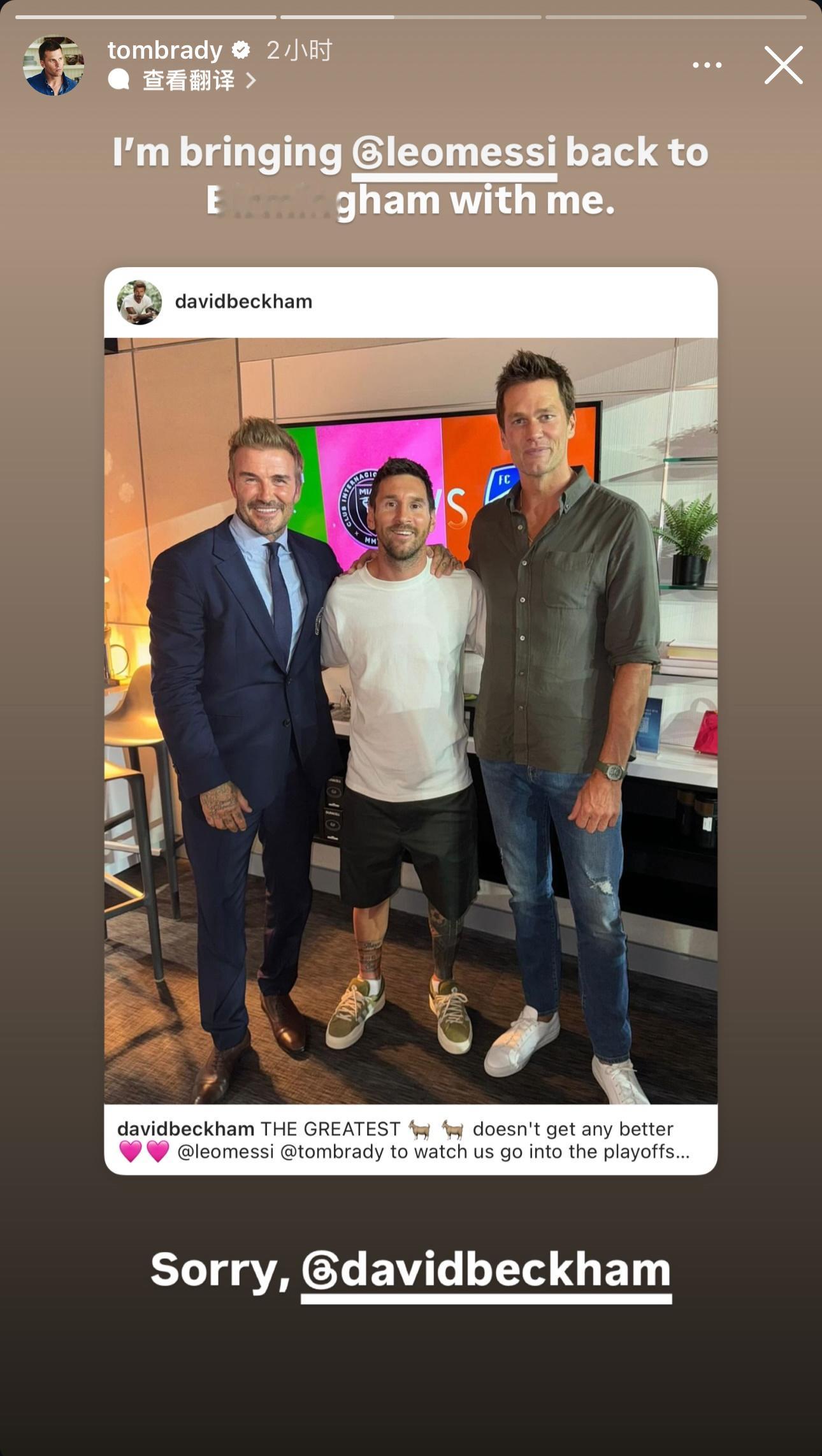 贝克汉姆ins晒与梅西和汤姆·布雷迪合影:最棒的🐐🐐 没有比这更好的了🩷 看我们进入季后赛 🇦🇷 & 🇺🇸
