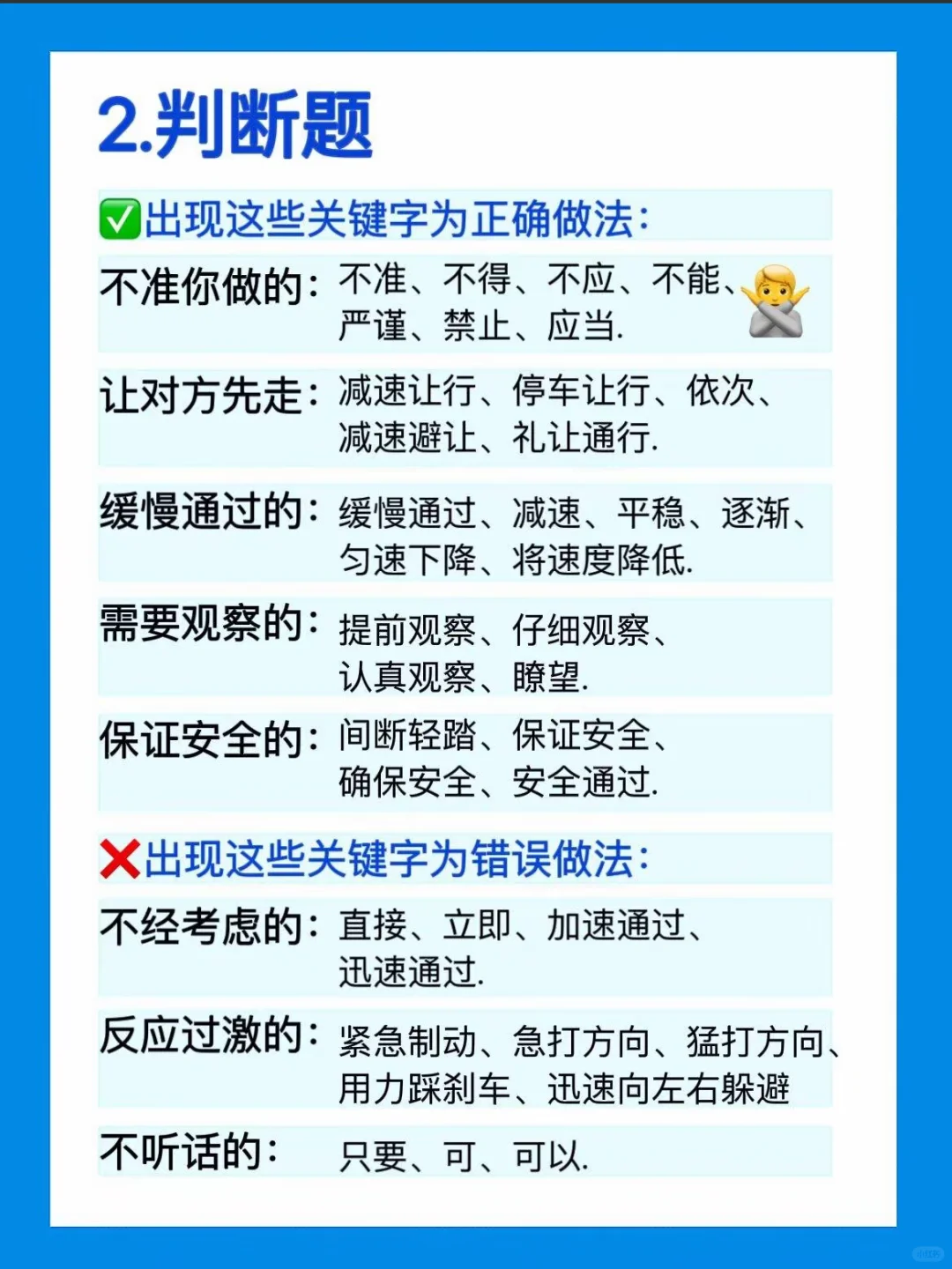 科目一满分2通关口诀 1.年份题 题目中看到“虚假”,选项中找1年 题目中看到“舞弊”,选项中找1年 题目中看到“吊销”,选项中找2年 题目中看到“欺骗”,选项中找3年 题目中看到“贿赂”,选项中找3年 题目中看到“兵设”,选项中找3年 题目中看到“吸毒”,选项中找3年 题目中看到“醉酒”,选项中找5年 题目中看到“初次”,选项中找6年 题目中看到“逃逸”,选项中找终生 题目中看到“犯罪”,选项中找终生