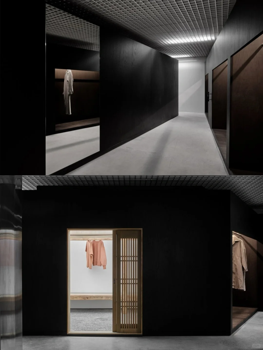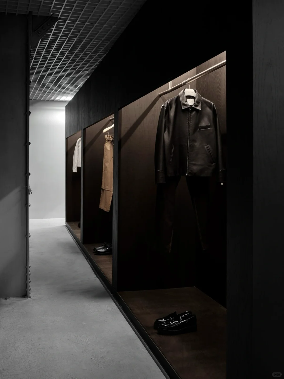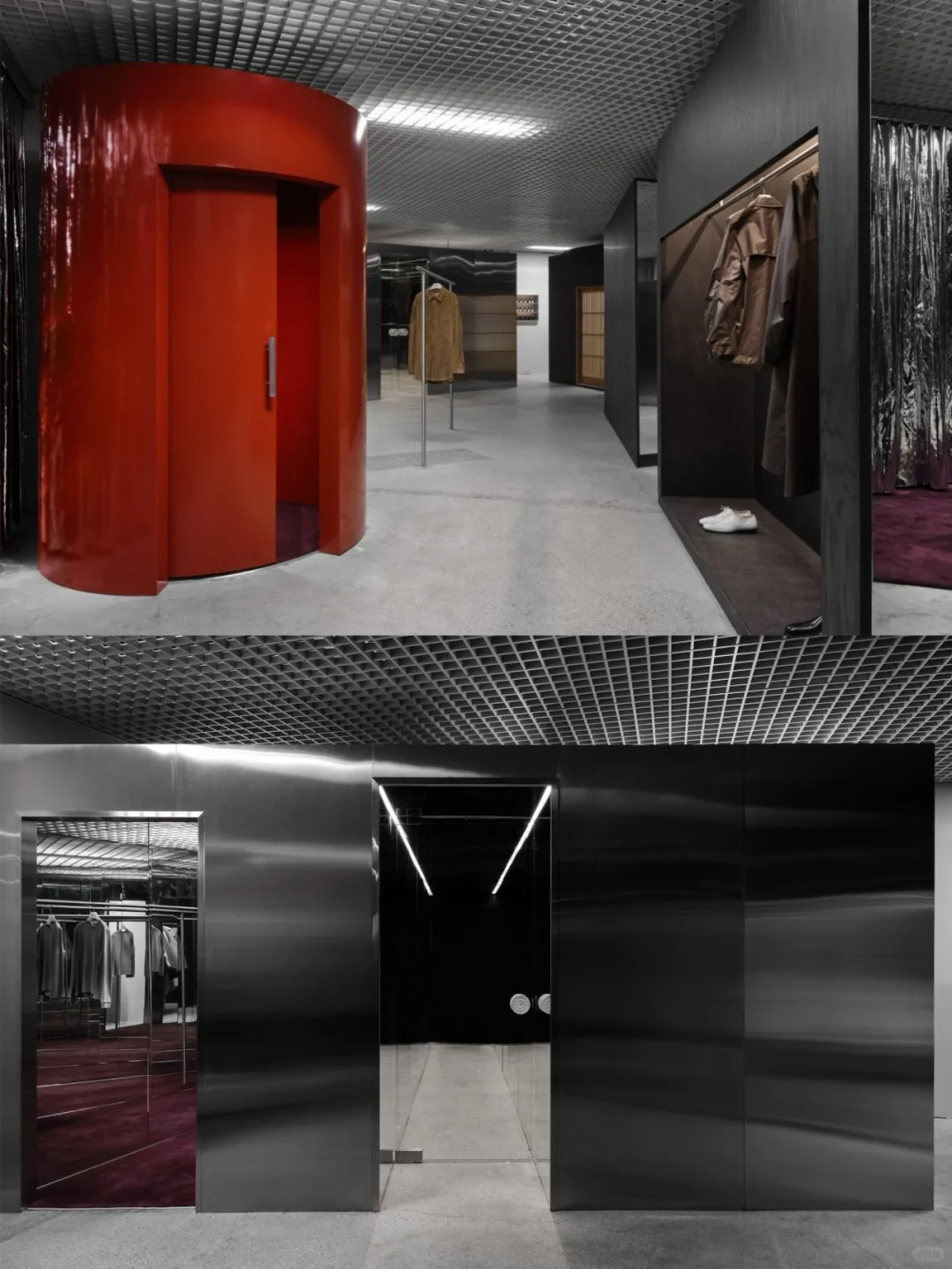 轻金属和重木质元素的反差对比下,一面是白色铝制天花板以网格凸显空间的工业性质,另一面是专属于Taiga Takahashi的“店中店”,以来自百年日本旅馆的杉木和榻榻米式木架呈现传统与当下共生的关联。介于此之间,以深酒红色试衣门和斑点牛皮服饰营造出穿越现实的复古未来感。