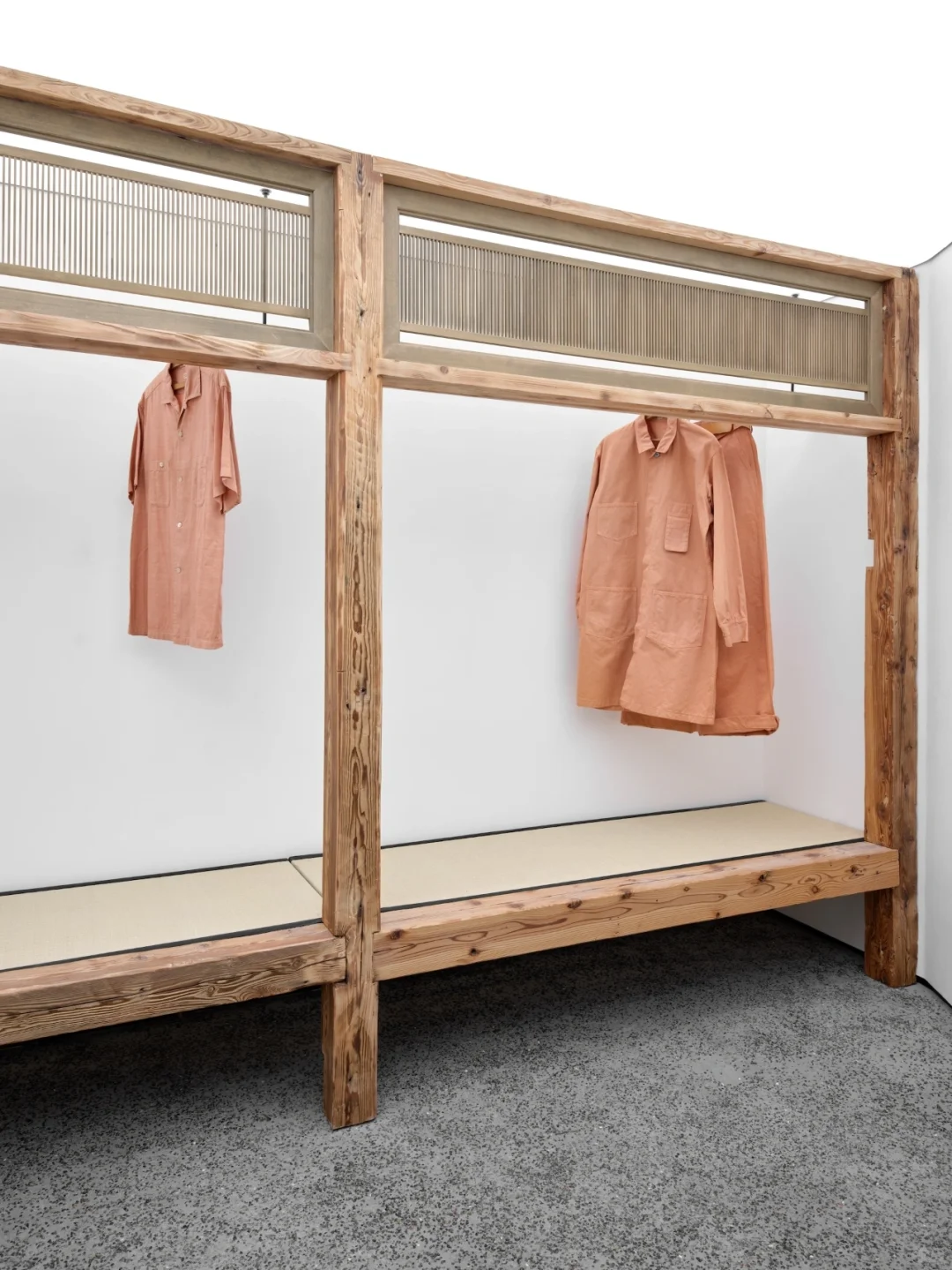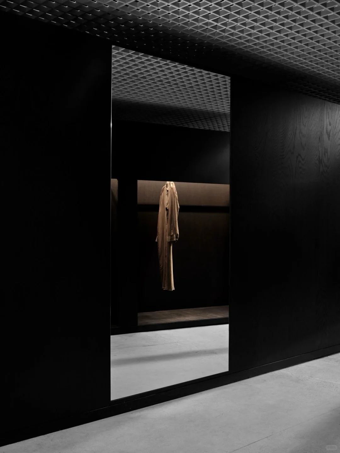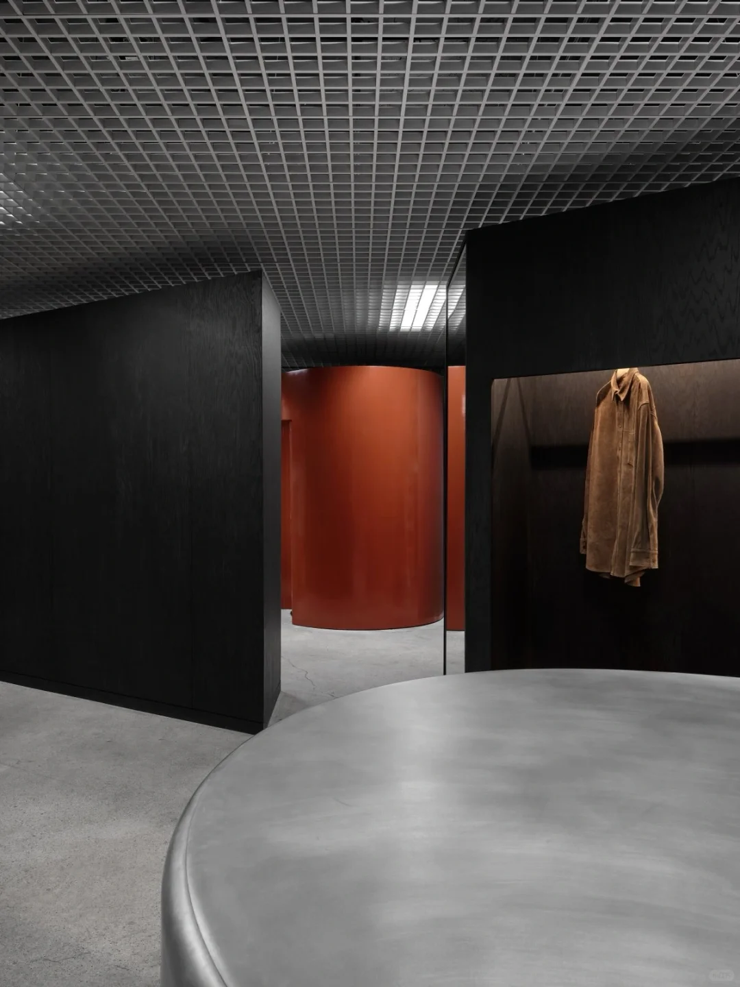 轻金属和重木质元素的反差对比下,一面是白色铝制天花板以网格凸显空间的工业性质,另一面是专属于Taiga Takahashi的“店中店”,以来自百年日本旅馆的杉木和榻榻米式木架呈现传统与当下共生的关联。介于此之间,以深酒红色试衣门和斑点牛皮服饰营造出穿越现实的复古未来感。