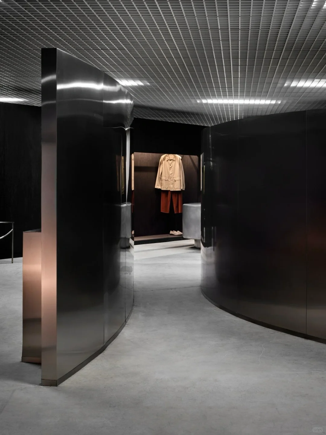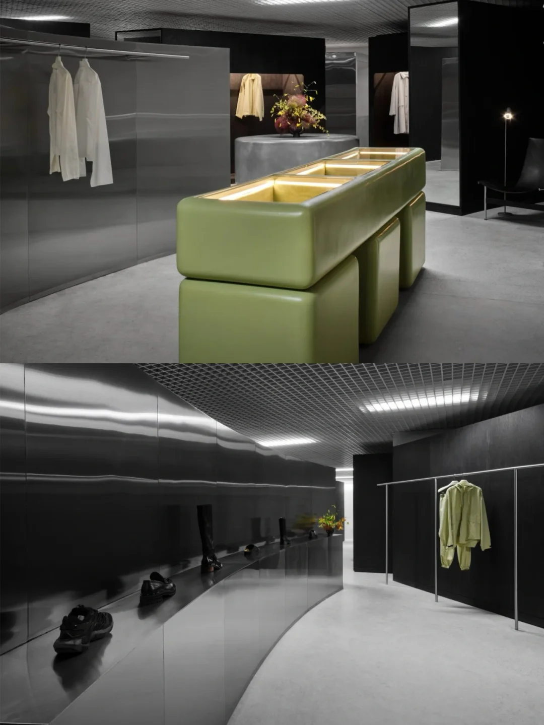 空间采用非线性布局,挑战传统的购物体验,在空间中探索、游逛。陈列系统以整体性的雕塑展示品牌产品,并划分空间区块。