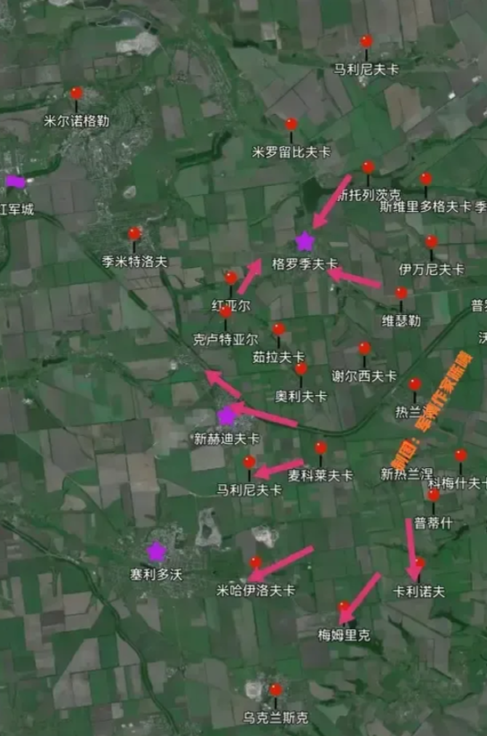除新赫迪夫卡外,另一个红军城重要门户是北边的格罗季夫卡,正在被俄军三面夹击。显然,乌军根本没有能力,也丧失了继续坚守红军城外围的决心。