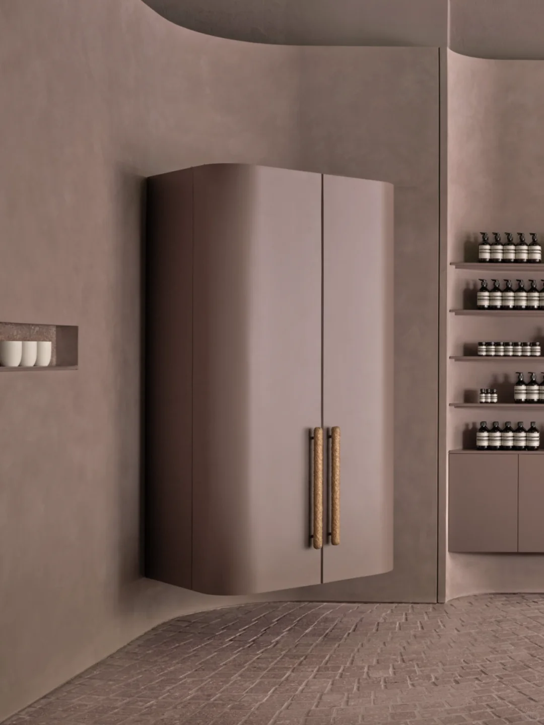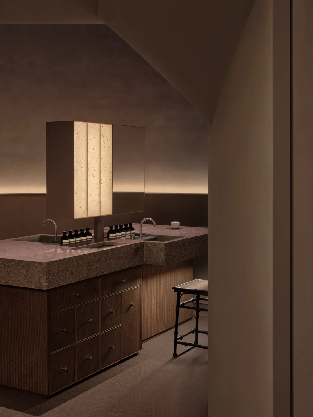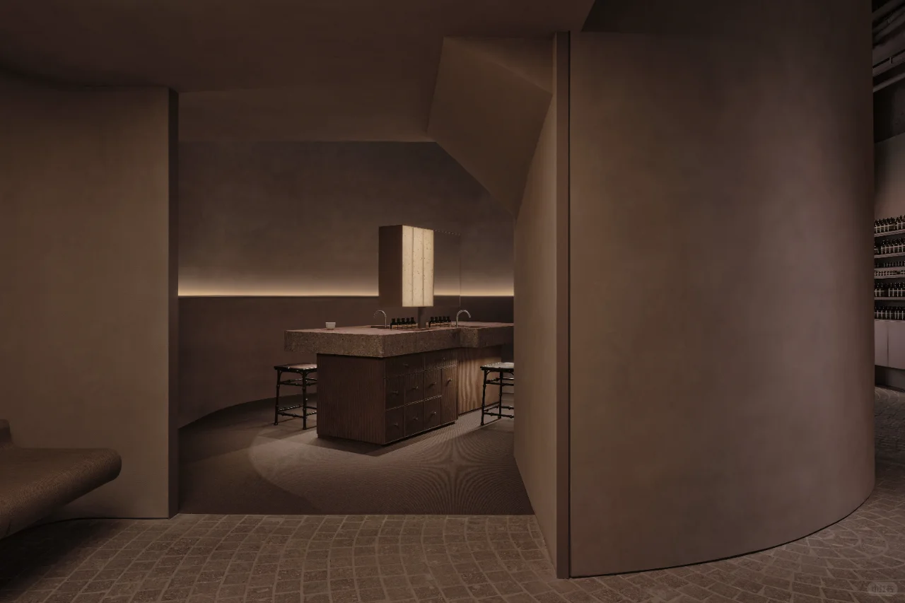 设计团队保留了建筑中原始的旋转楼梯,进而创造出充满韵律节奏的空间元素——以楼梯的蜿蜒曲面,自然地引导人们进一步深入店内——店铺空间因此被巧妙区隔,勾勒出个人化水槽区域,予顾客如家中浴室般的私密体验。
