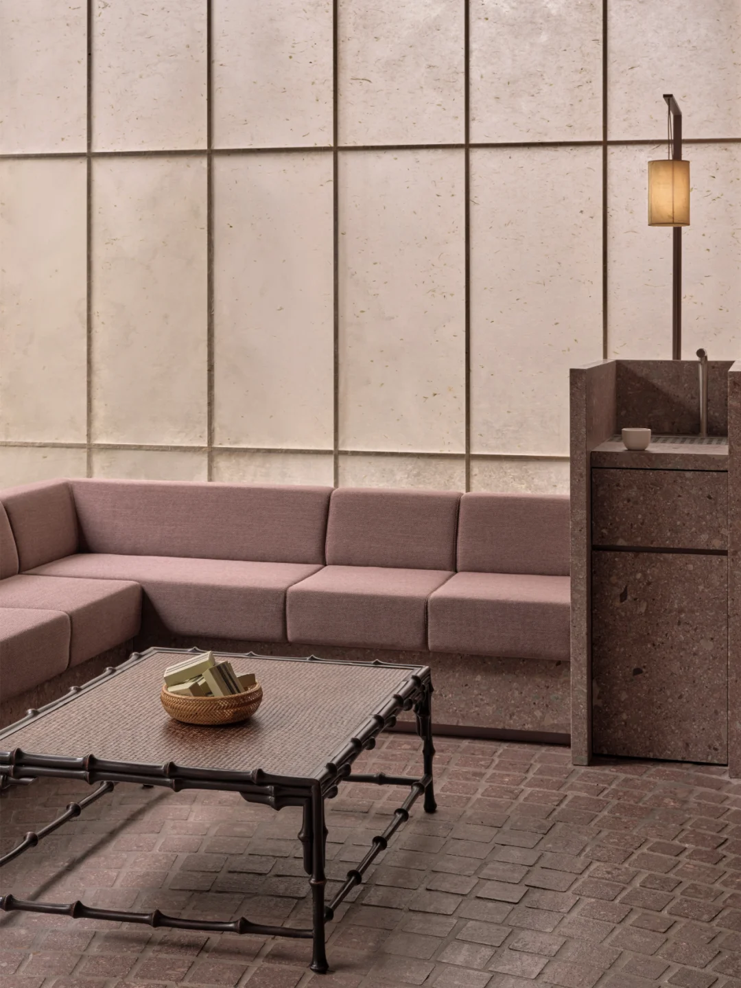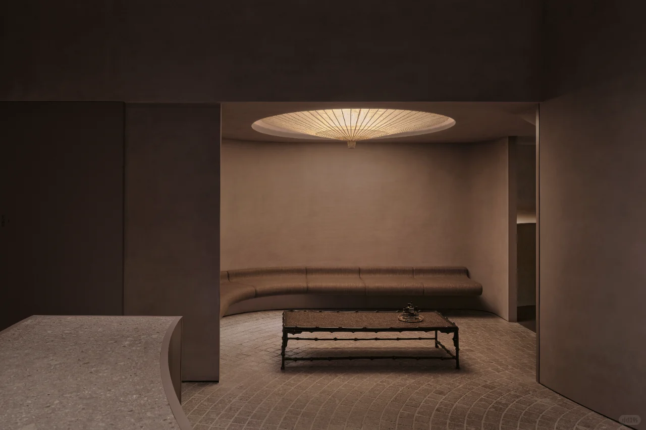 户外空间以充满在地意趣的“高湖石”及本地植物打造而成。庭院中特别设有弧形长椅,为疲惫的行人提供休憩之所。不同加工方式的石材被用于塑造粗质柱廊、锤纹地面以及抛光台面,将其独特的肌理美感运用于诗意空间。