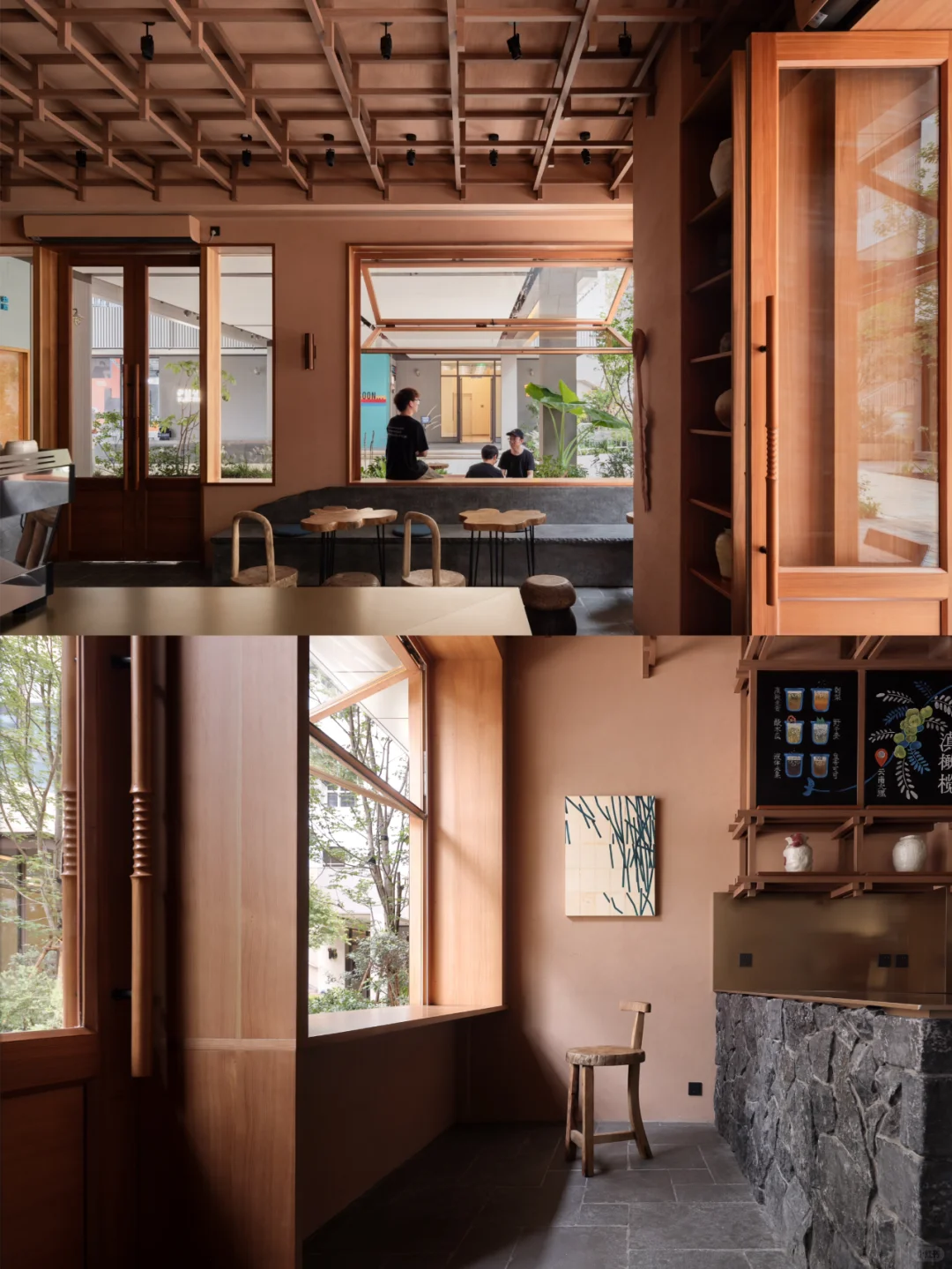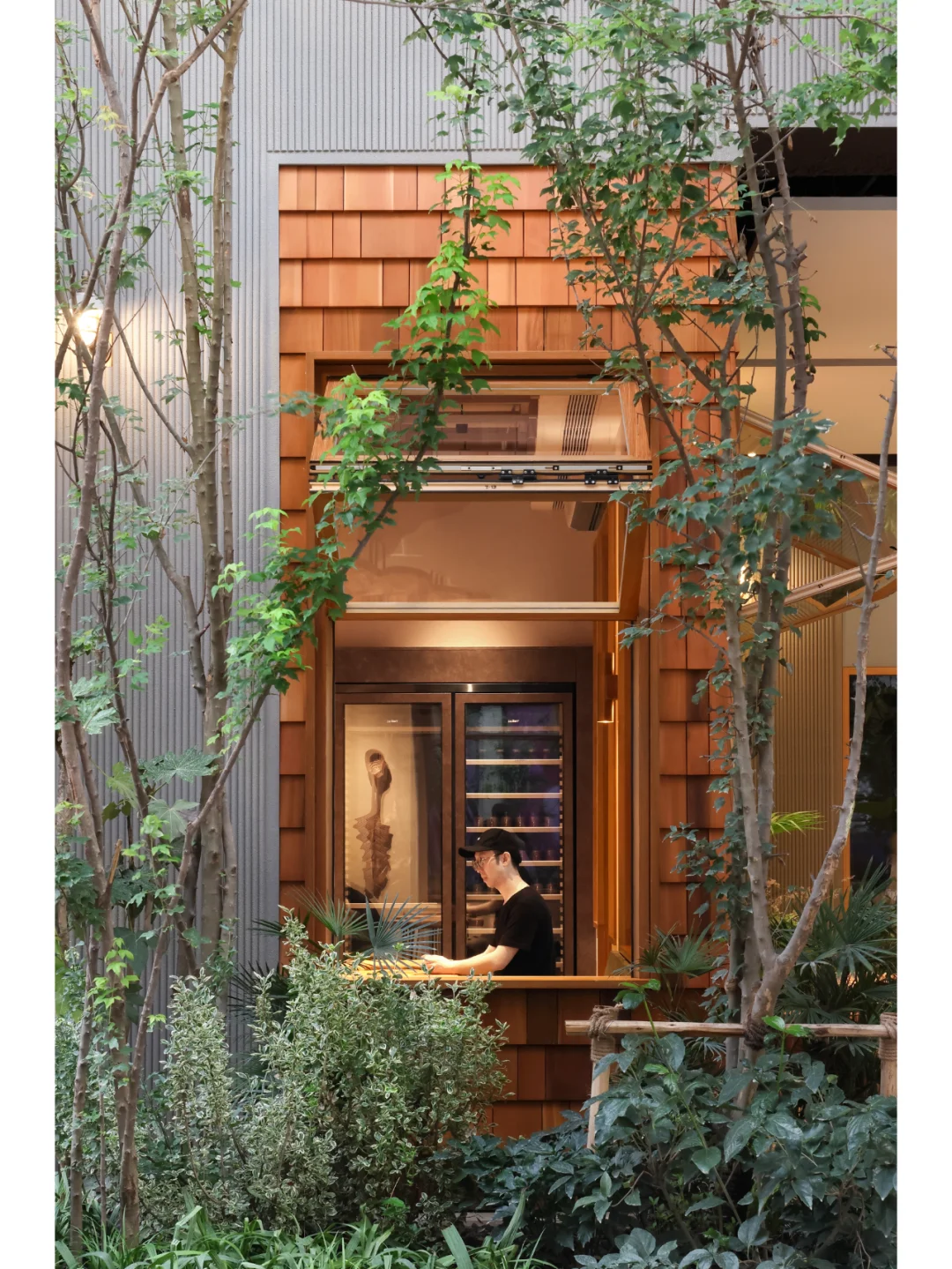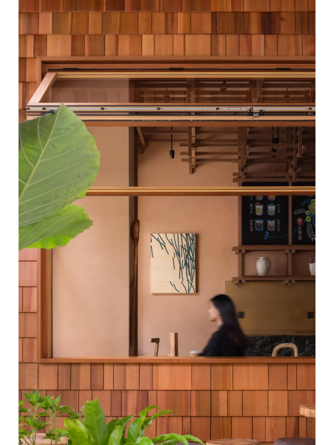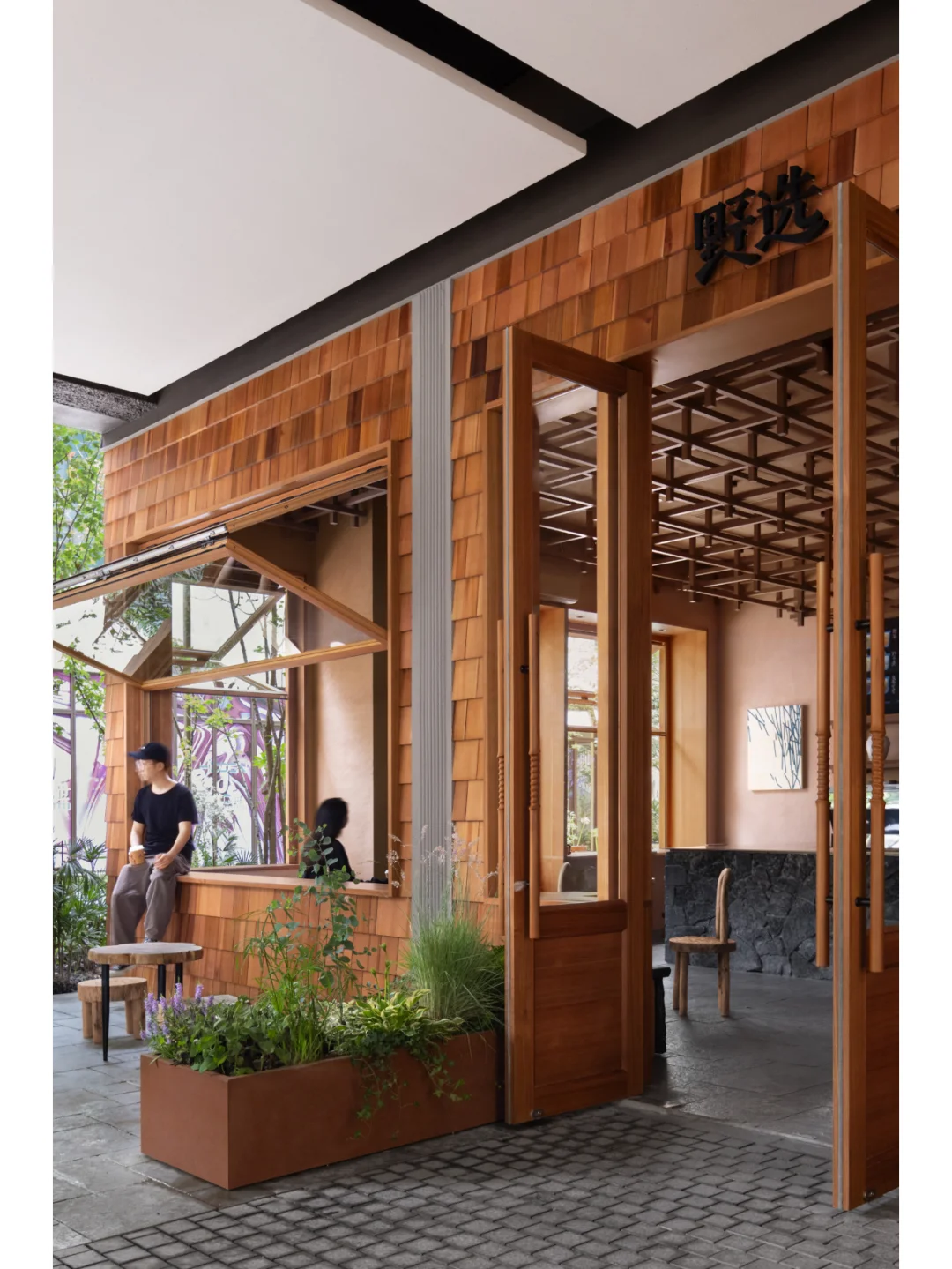 外立面设计灵感来自云南传统木作红雪松木瓦墙面,充分的释放自然材料的魅力,折叠开启窗让室内外空间融为一体,在加上户外的外摆区域和植物景观,让店面轻松的融入整个社区。
