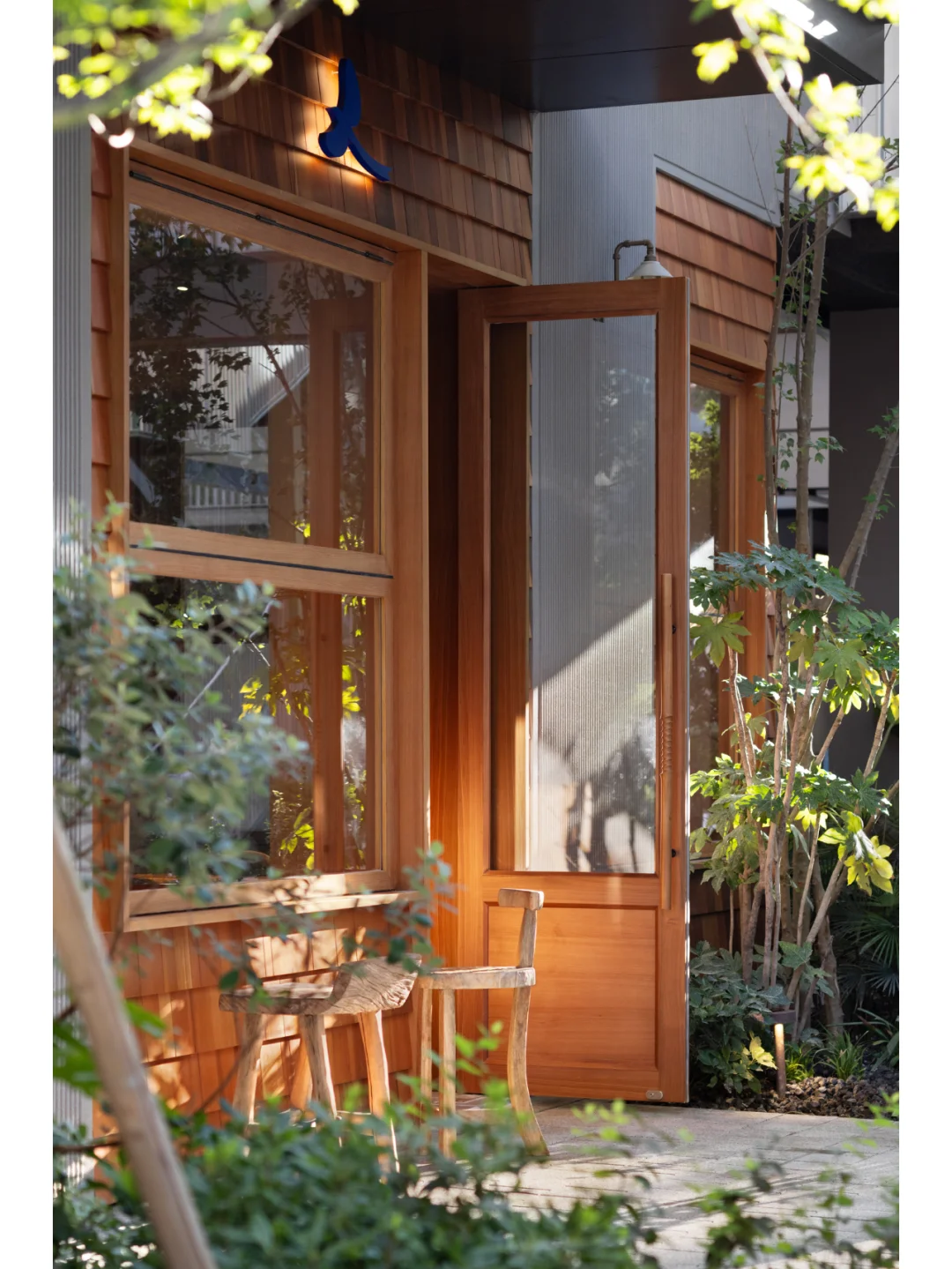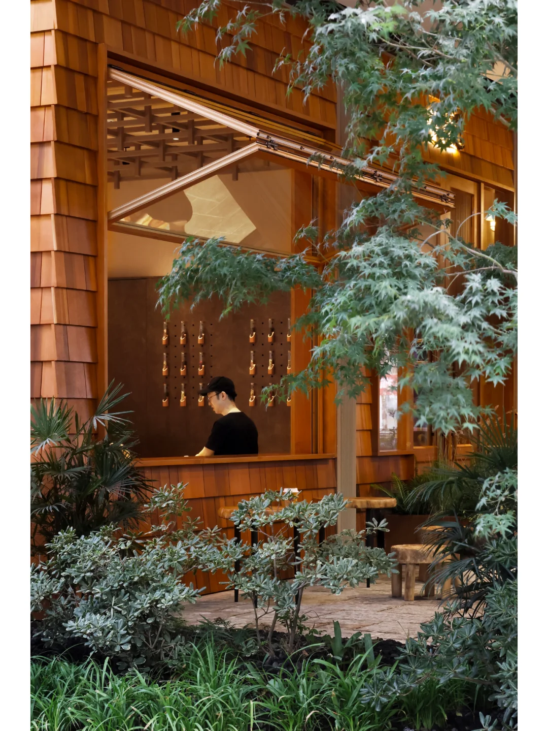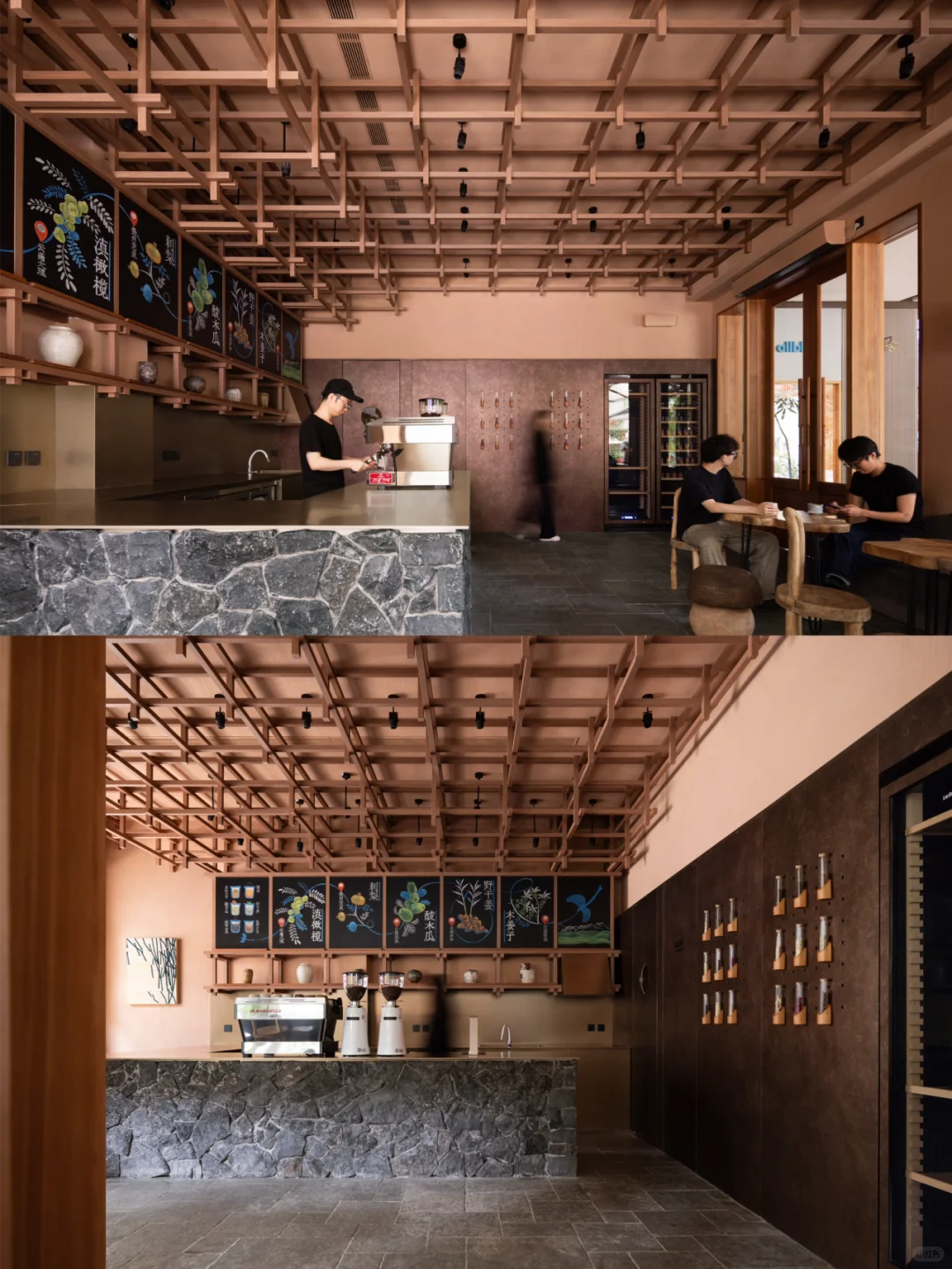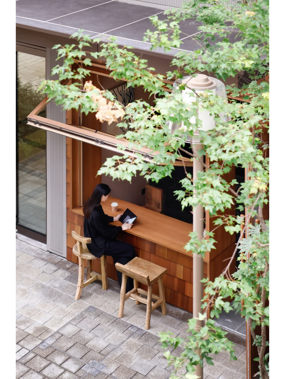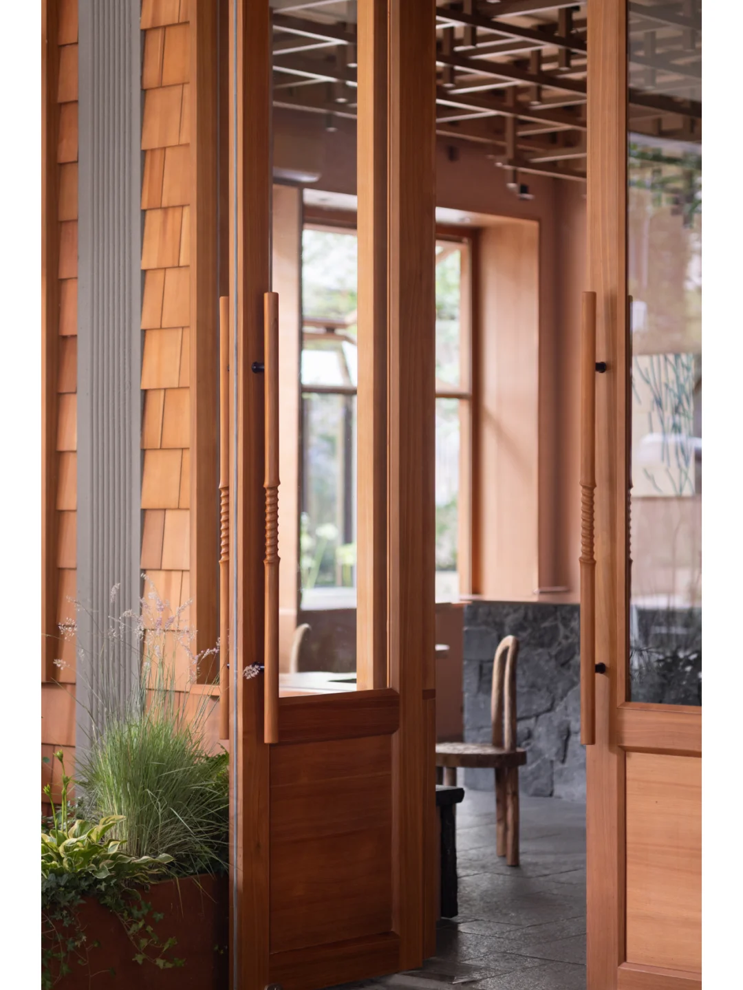 外立面设计灵感来自云南传统木作红雪松木瓦墙面,充分的释放自然材料的魅力,折叠开启窗让室内外空间融为一体,在加上户外的外摆区域和植物景观,让店面轻松的融入整个社区。