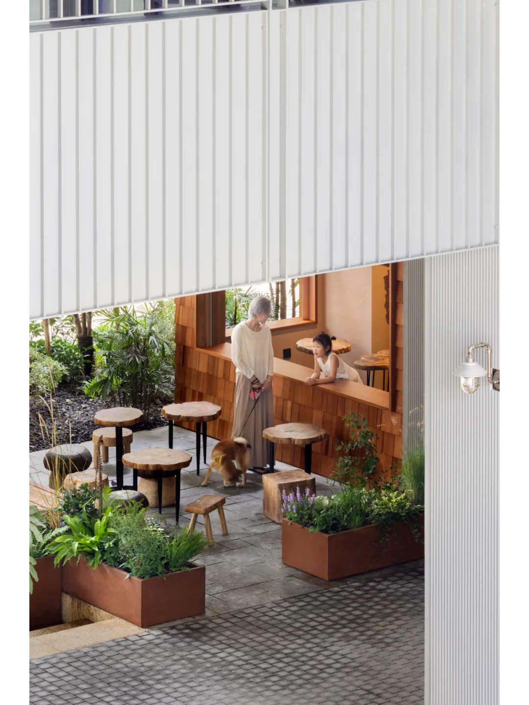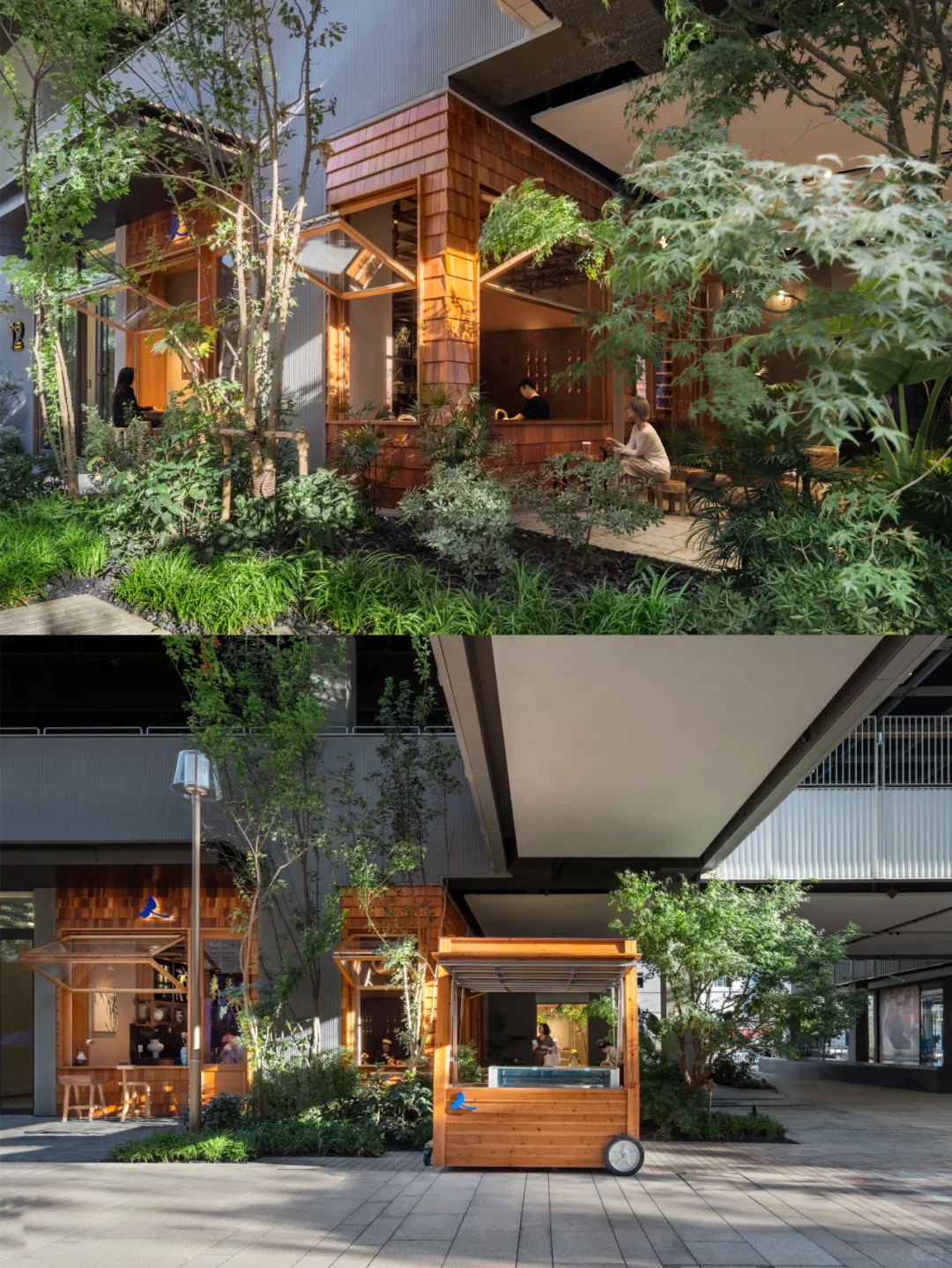 空间设计概念是在这个转角店面位置植入一个开放的“木屋”,让社区的自然景观和室内外空间可以无缝融合在一起。