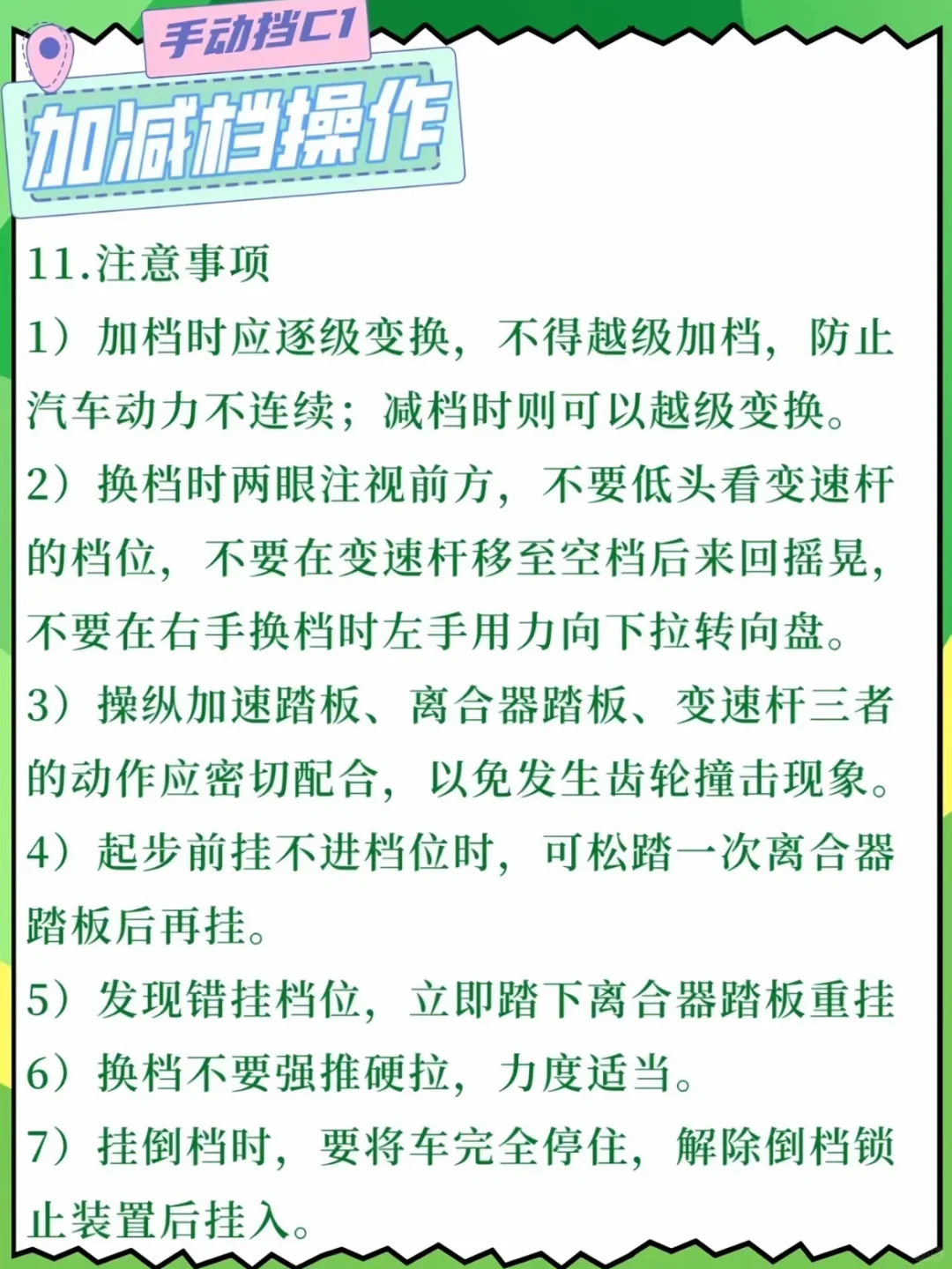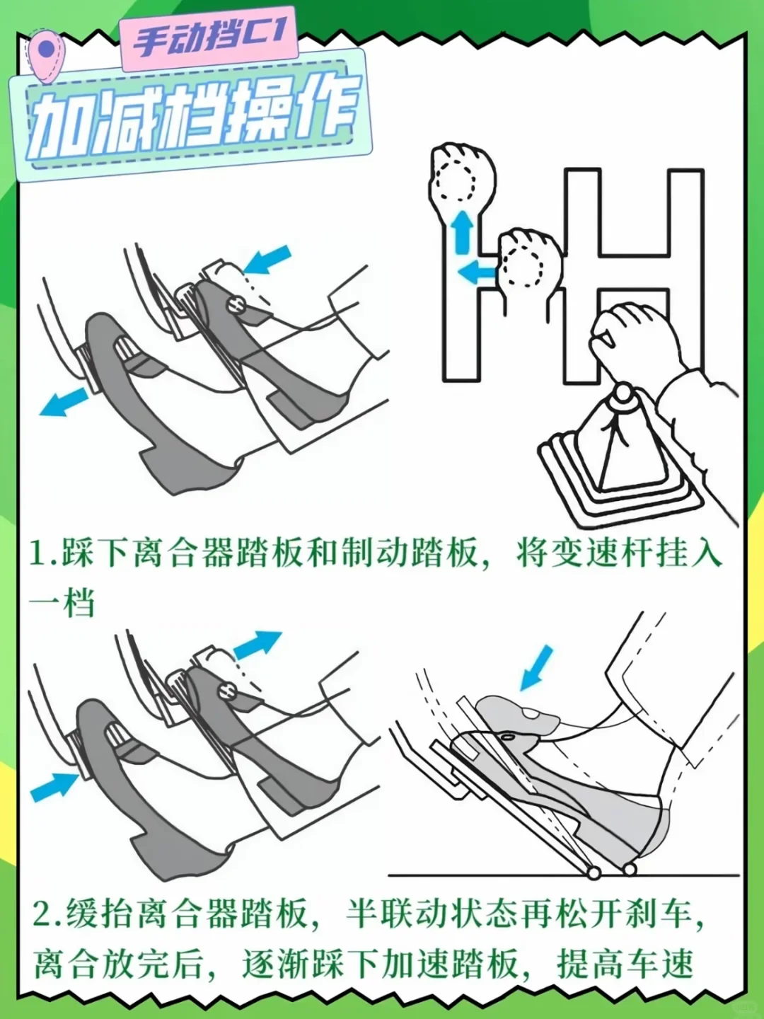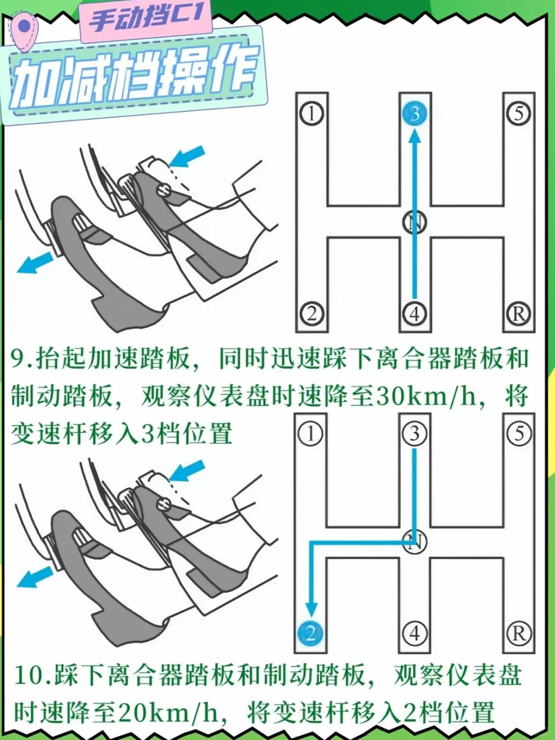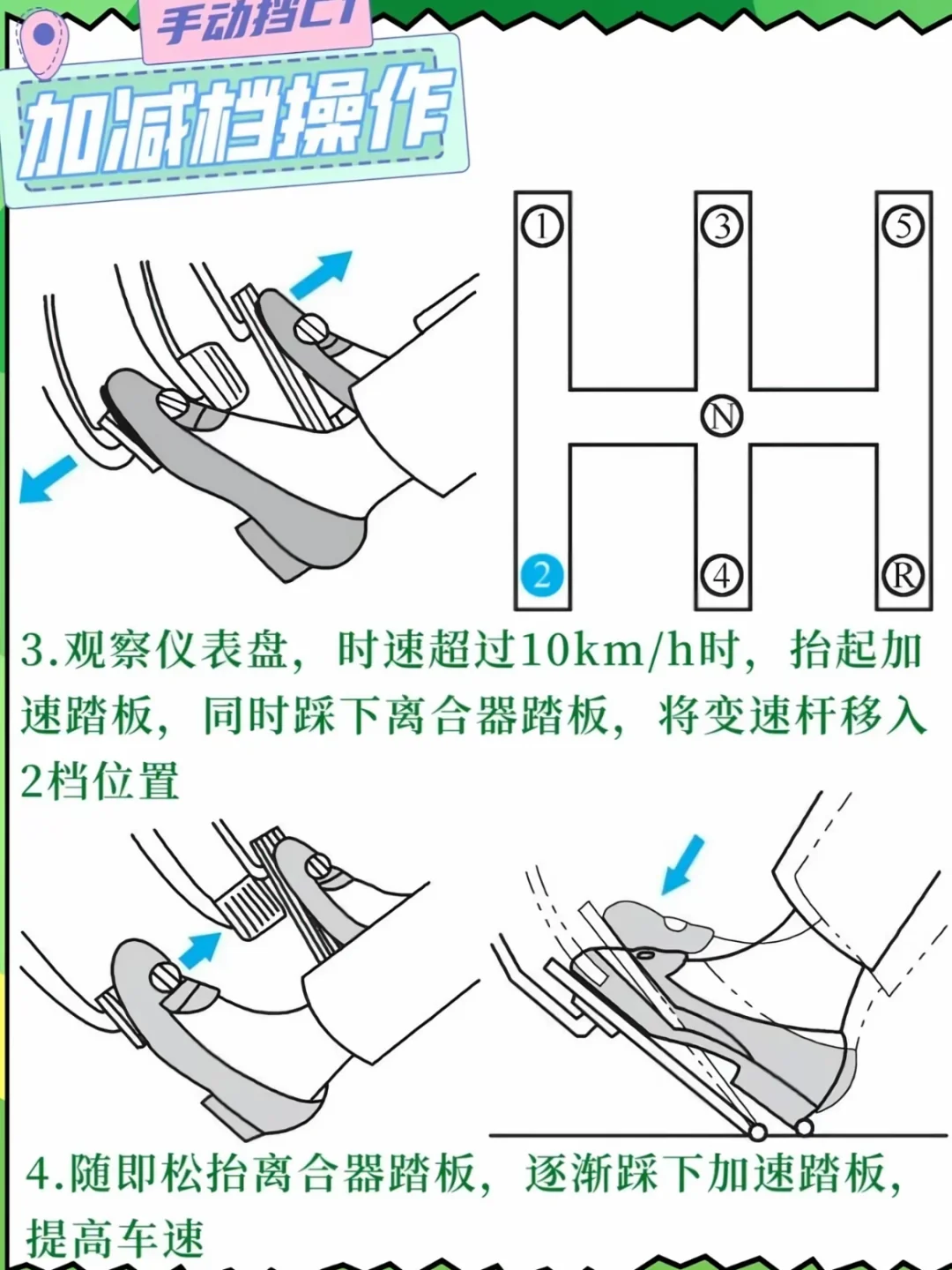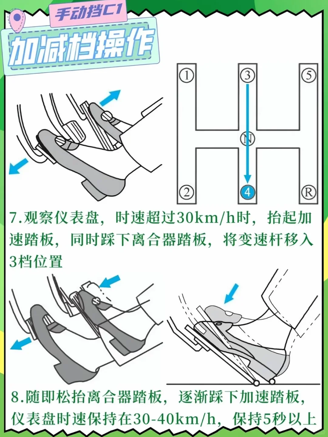 5.观察仪表盘,时速超过20km/h时,抬起加速踏板,同时踩下离合器踏板,将变速杆移入 3档位置 / 6.随即松抬离合器踏板,逐渐踩下加速踏板,提高车速