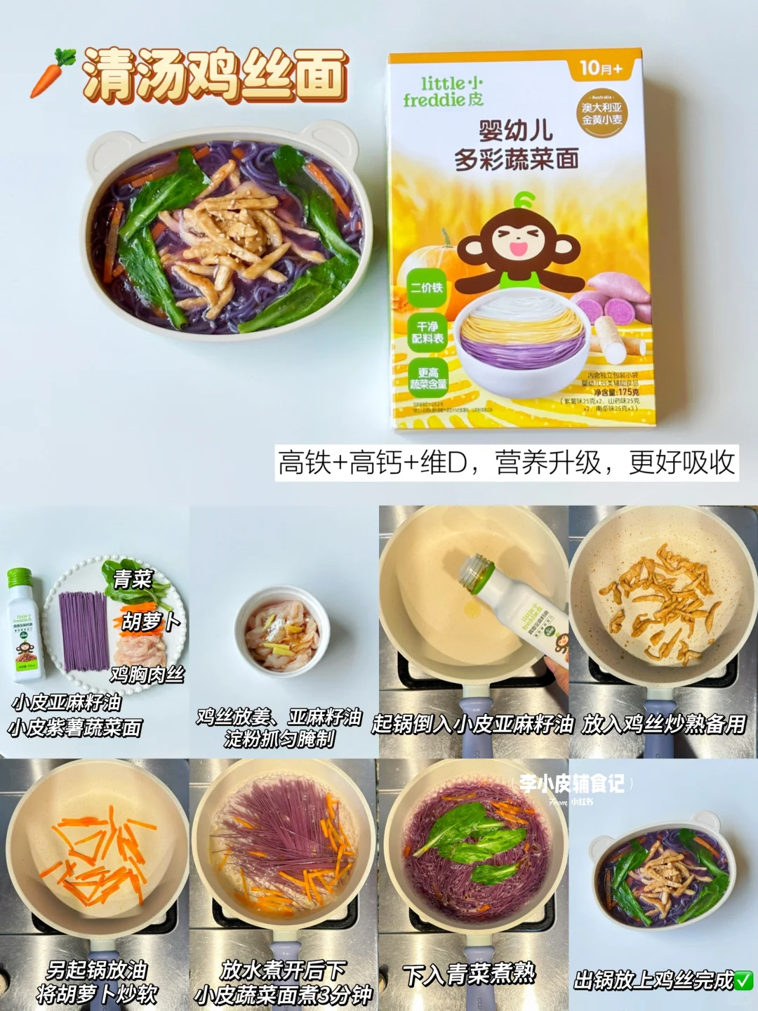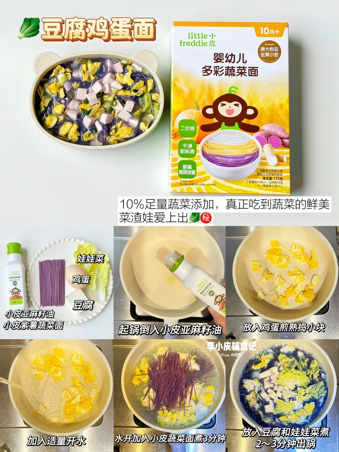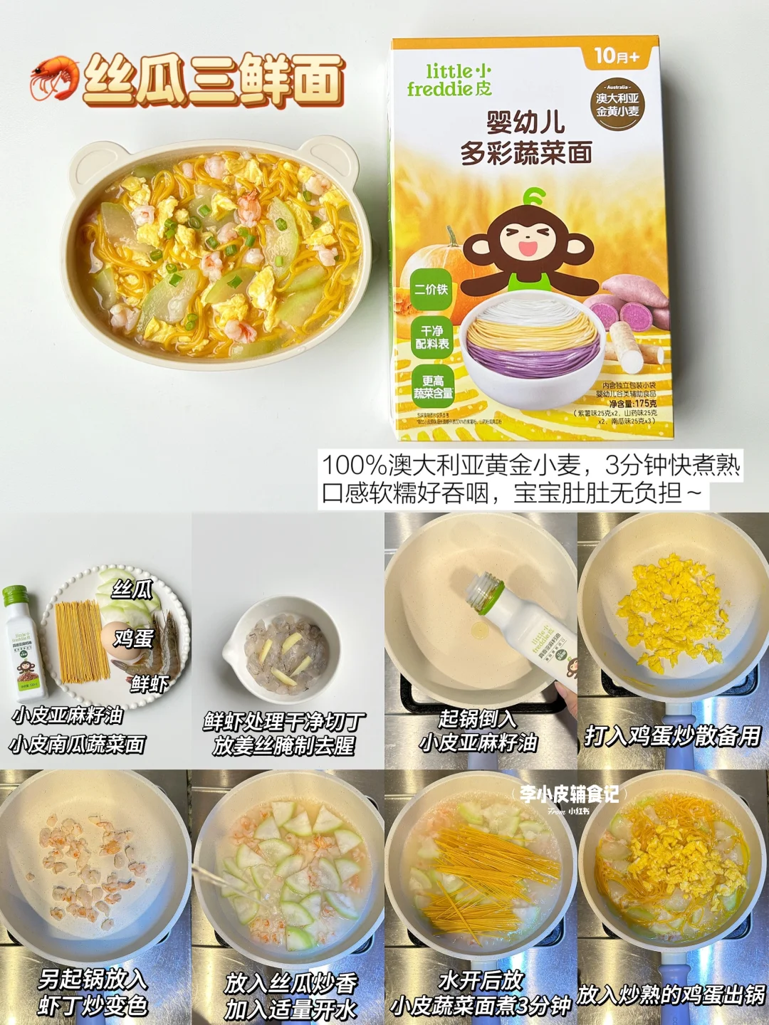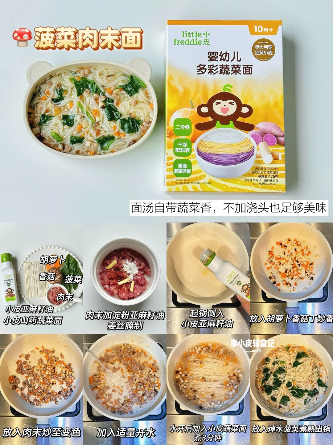 秋季是宝宝长个长🥩的猛涨期,辅食讲究营养全面,尤其要注意养好脾胃,脾胃棒的宝宝自然营养吸收得更好 👏🏻今天用我家娃敲爱吃的小皮面条给大家分享6款好吃又营养的面条辅食,简单快手,荤素搭配均衡,好吞咽好消化,每一款都好吃到光盘,饭渣娃也敲爱吃😋 家有挑食的饭渣宝宝赶紧收藏安排起来吧~[派对R] ✅番茄牛肉面 ✅丝瓜三鲜面 ✅南瓜龙利鱼面 ✅菠菜肉末面 ✅豆腐鸡蛋面 ✅清汤鸡丝面 ⚠️具体做法参考图片喔!食材大小需根据宝宝咀嚼能力处理,一岁以下宝宝不加调味料~ 面条是皮皮敲级喜欢吃的小皮蔬菜面~ ✅10%的足量蔬菜含量,每一口面条都裹满着蔬菜清甜,即使啥浇头都不加也能吃到面条的美味,一口进去敲满足!! ✅原料用的蔬菜还是对宝宝肚肚很友好的单一蔬菜,初添加面条的宝宝也不用担心会mm,紫薯+山药+南瓜3种口味搭配,每天都可以换着吃,宝宝更容易接受,从小吃惯蔬菜的味道,长大也就不挑食啦!还特别添加了和小皮米粉一样好吸收的二价铁🥰,搭配上高钙+维生d,营养更全面~而且符合婴幼儿辅食标准,没有盐添加剂等乱七八糟的添加,给宝宝吃的面条辅食,主打一个安心👍🏻 ✅水开后下面煮 3min就熟啦~软糯好吞咽,不坨不粘口感也很👍 对宝宝肚肚消化吸收敲👍 平时我还会习惯会搭配上小皮真香亚麻籽油,面条吃起来更香了,营养也更加丰富了~里面的0mega-3能转化为DHA,对宝宝的🧠发育很nice ~可冷拌面可热炒,做平时给皮皮做辅食都会习惯滴几滴,这样出来的辅食宝宝吃得嘎嘎香!没5分钟就光盘了~