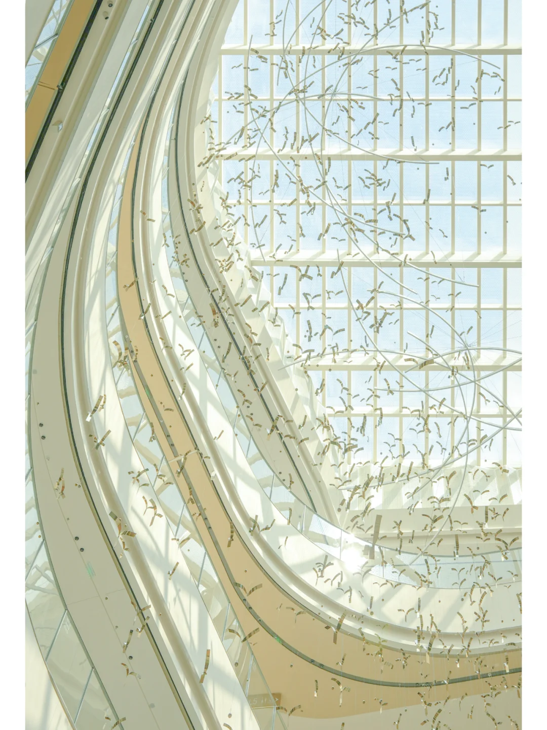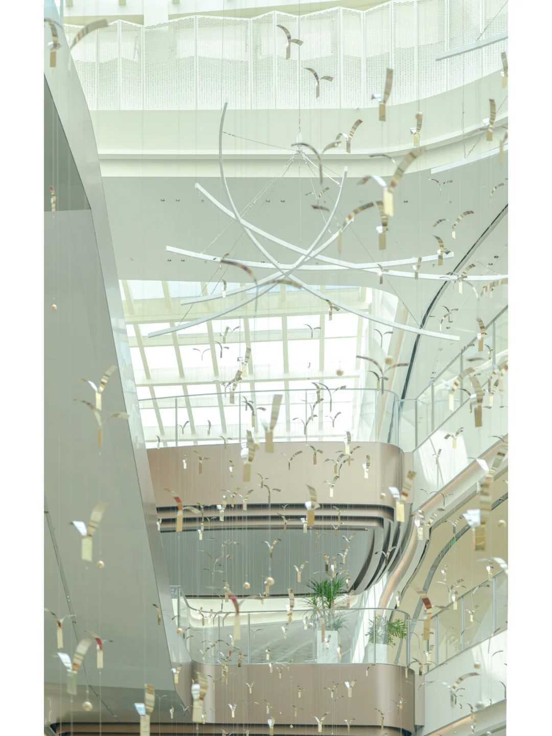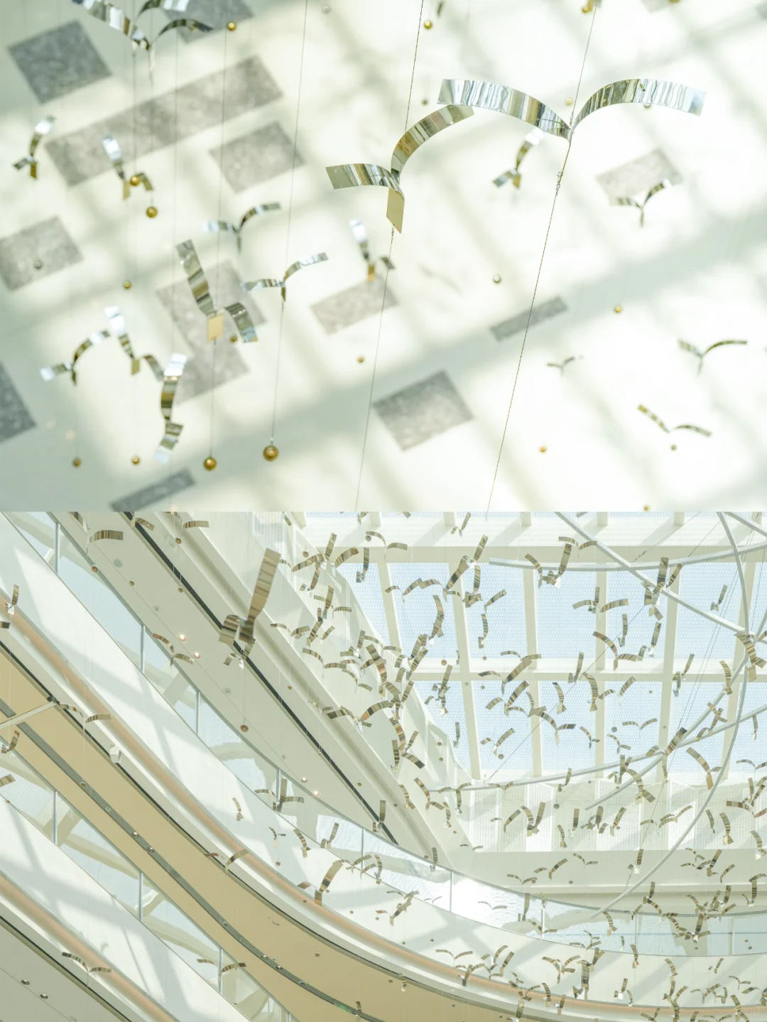 ⬜ 在光影交错的建筑心脏地带,一件名为《既是轻盈的,也是沉甸的》公共艺术作品悄然绽放。它转译了枫树科植物的种子形态,将其与金属材料结合,仿形自由飞翔的纸蜻蜓,编织着一场跨越现实与幻想的视觉盛宴。 ⬜ 艺术家泽良以他独特的艺术视角,将人造物、自然景观与社会文化融为一体,构建了一个后自然的世界——在享受技术进步带来的便捷与美好时,亦需铭记自然之恩赐,思考人类与自然、现在与未来的和谐共生。