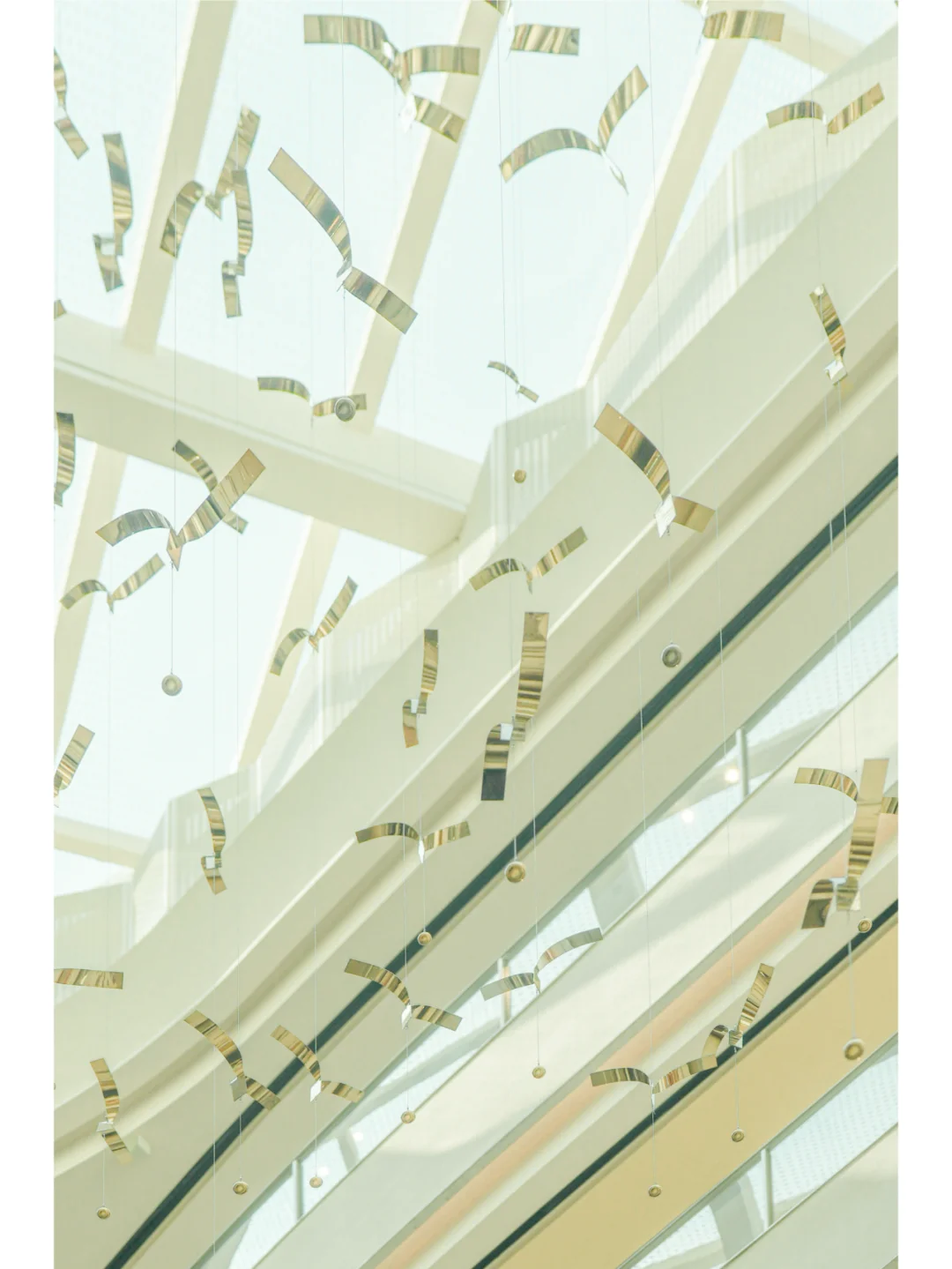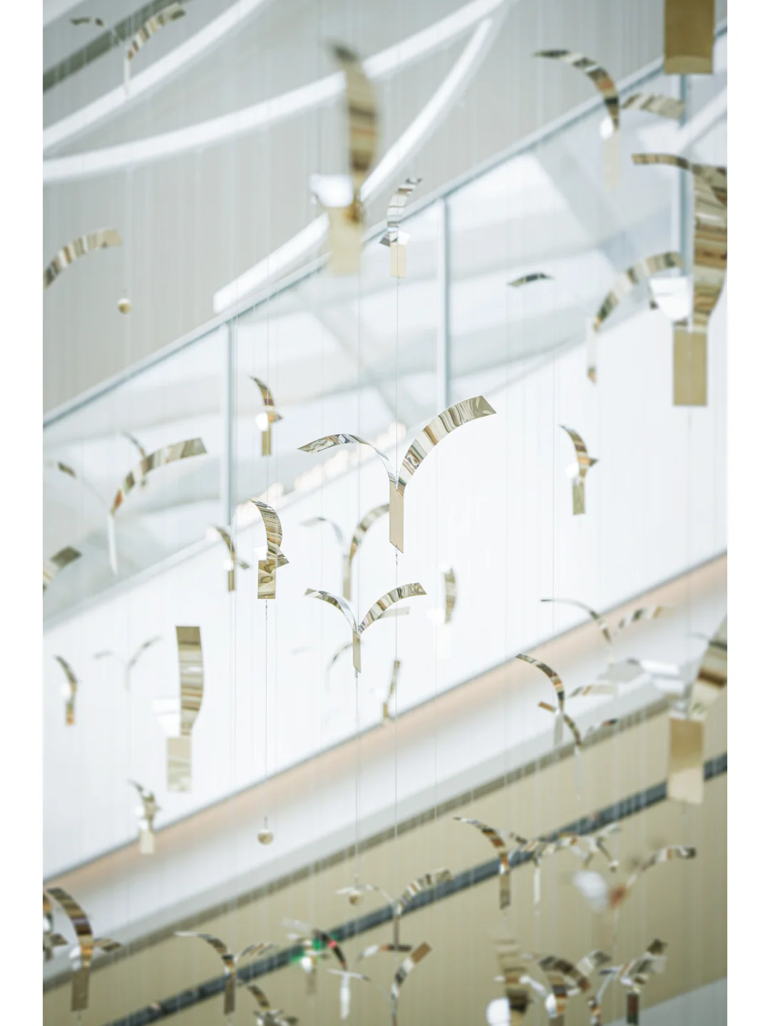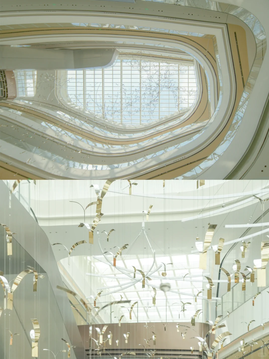 ⬜ 在光影交错的建筑心脏地带,一件名为《既是轻盈的,也是沉甸的》公共艺术作品悄然绽放。它转译了枫树科植物的种子形态,将其与金属材料结合,仿形自由飞翔的纸蜻蜓,编织着一场跨越现实与幻想的视觉盛宴。 ⬜ 艺术家泽良以他独特的艺术视角,将人造物、自然景观与社会文化融为一体,构建了一个后自然的世界——在享受技术进步带来的便捷与美好时,亦需铭记自然之恩赐,思考人类与自然、现在与未来的和谐共生。