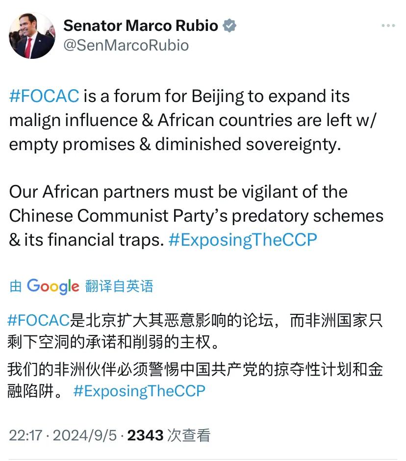 被我方制裁的美国参议员马可·卢比奥昨晚(北京时间9月5日晚)污蔑道:“中非合作论坛是北京扩大其恶意影响的论坛,非洲国家只得到空洞的承诺、和被削弱的主权。我们的非洲伙伴必须警惕中国共产党的掠夺性计划及其金融陷阱。” 【卢比奥转发了路透社的报道:中国将 “振兴” 连接赞比亚和坦桑尼亚的老旧铁路。】 [机智]评几句:中国在非洲修桥、铺路、建医院、打水井……中国的角色和影响,非洲民众自有公论,美国反华议员的诋毁不起作用。中非双方通过优势互补实现互利共赢,不断丰富中非合作的内涵。美国则对非洲的关注时有时无,并不能保持长期的重视。尽管美国曾主办过两届美非峰会,但时间上却相隔了8年,美国时任总统特朗普还曾严重“污名化”非洲国家。在奥巴马时期提出的“电力非洲”计划,美国至今仅完成了约四分之一的目标……