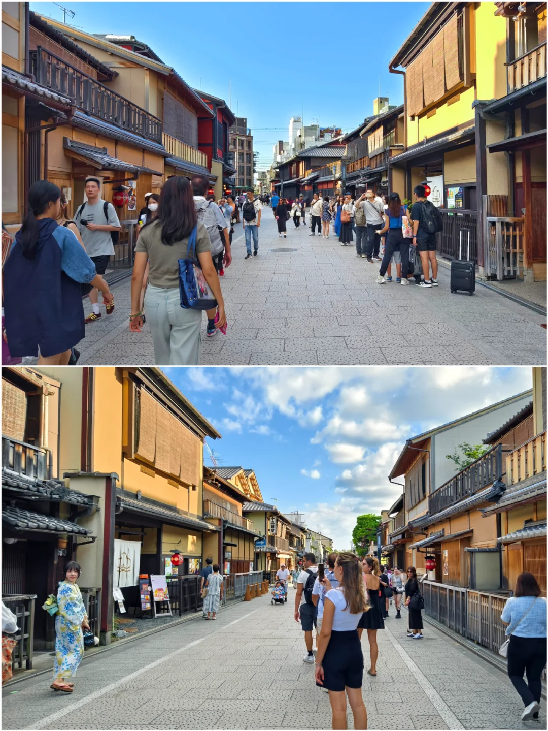🔥傍晚的花见小路,许多店铺还没有开门,但游客已经络绎不绝了,据说再晚点,能看到踩着木屐、行色匆匆去赴约的艺伎或舞伎。
